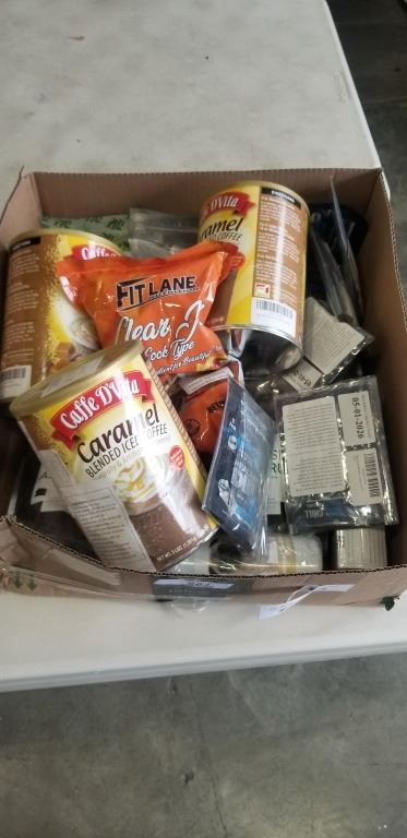 ASSORTED NEW OVERSTOCK FOOD ITEMS INLCUDING 3 TUBS OF CARAMEL BLENDED ICED COFFEE MIX
