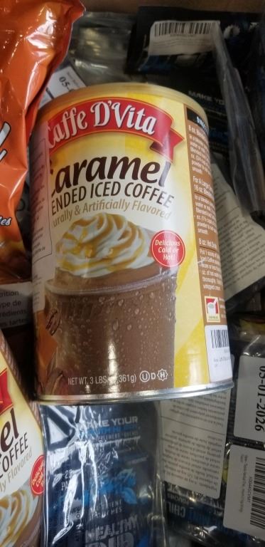 Lot 964 ASSORTED NEW OVERSTOCK FOOD ITEMS INLCUDING 3 TUBS OF CARAMEL BLENDED ICED COFFEE MIX