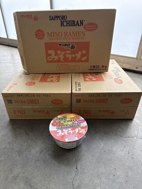 3 NEW CASES OF SAPPORO ICHIBAN MISO RAMEN JAPANESE STYLE NOODLE BOWLS, 12 PER BOX, 36 TOTAL BB. APRIL 28.2026