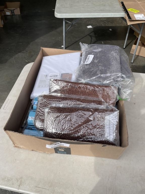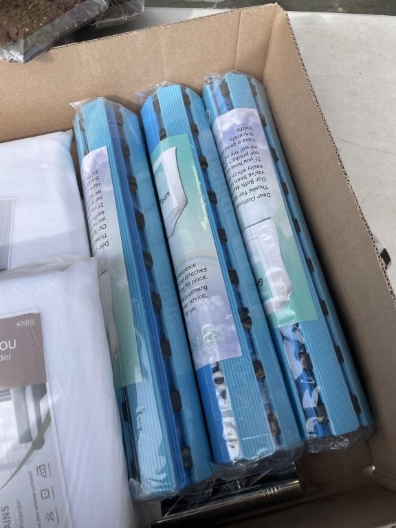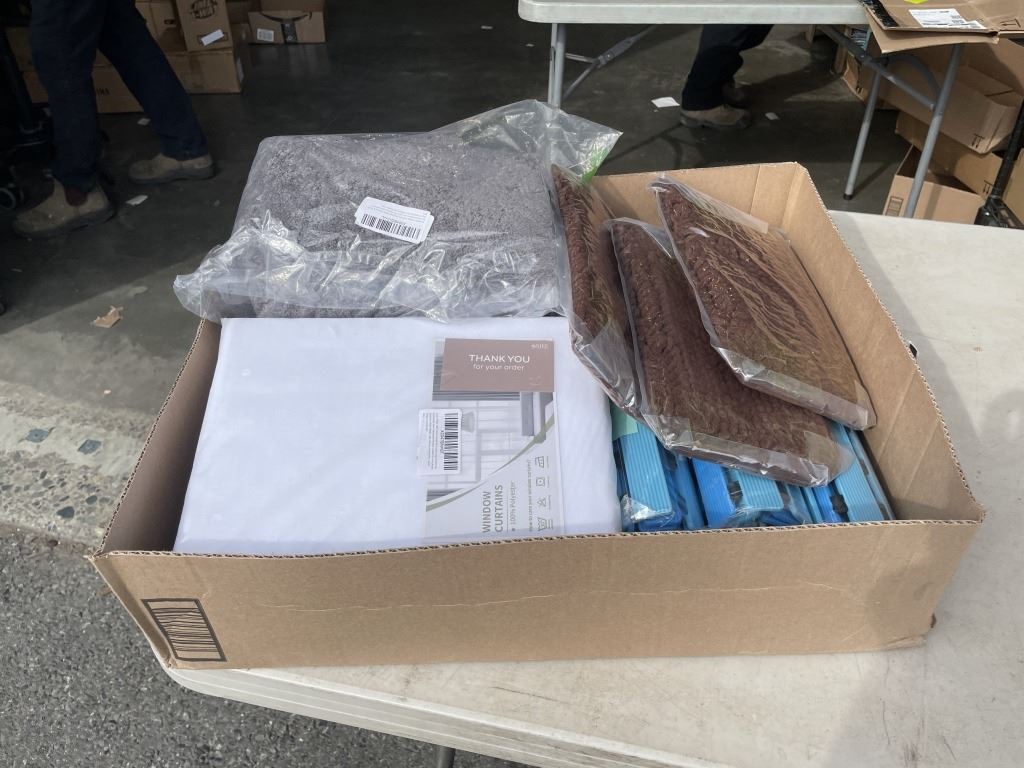 Lot 989 LARGE LOT OF NEW AMAZON OVERSTOCK BATH MATTS, CURTAINS AND ROD HOLDER ETC