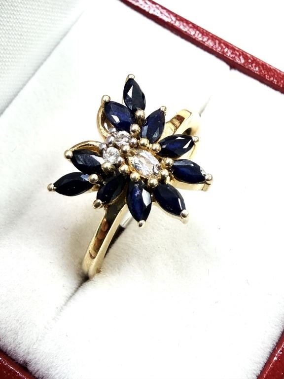 GOLD PLATED STERLING SILVER NATURAL BLUE SAPPHIRE (1.35CT) AND WHITE TOPAZ (0.17CT) RING, SIZE 7.75, W/A $750.00. SAPPHIRE IS THE BIRTHSTONE FOR SEPTEMBER.