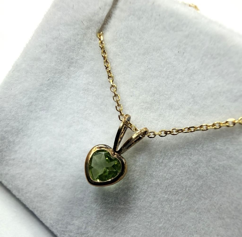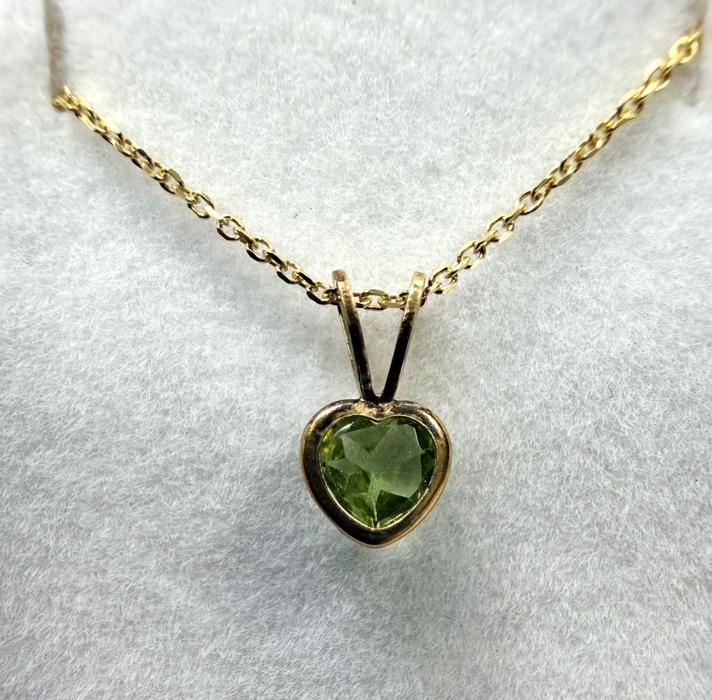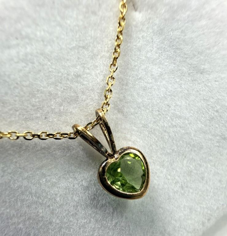 GOLD PLATED STERLING SILVER NATURAL PERIDOT (0.95CT) HEART SHAPE PENDANT WITH GOLD PLATED STERLING SILVER CHAIN, W/A $150.00. PERIDOT IS THE BIRTHSTONE FOR AUGUST.