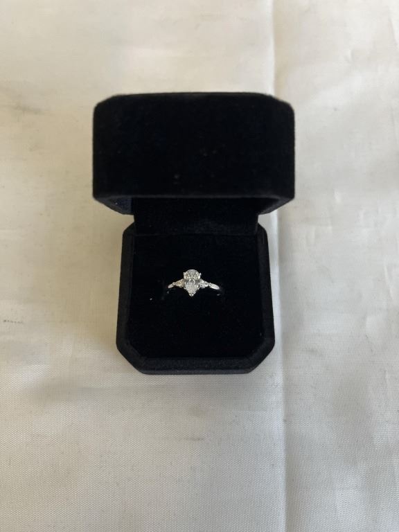 Lot 1065 NEW S925 1.0CT PEAR CUT SIMULATED DIAMOND (CZ) TRINITY RING W/ PEAR SIDESTONES, SIZE 7, MOUNTED IN 9