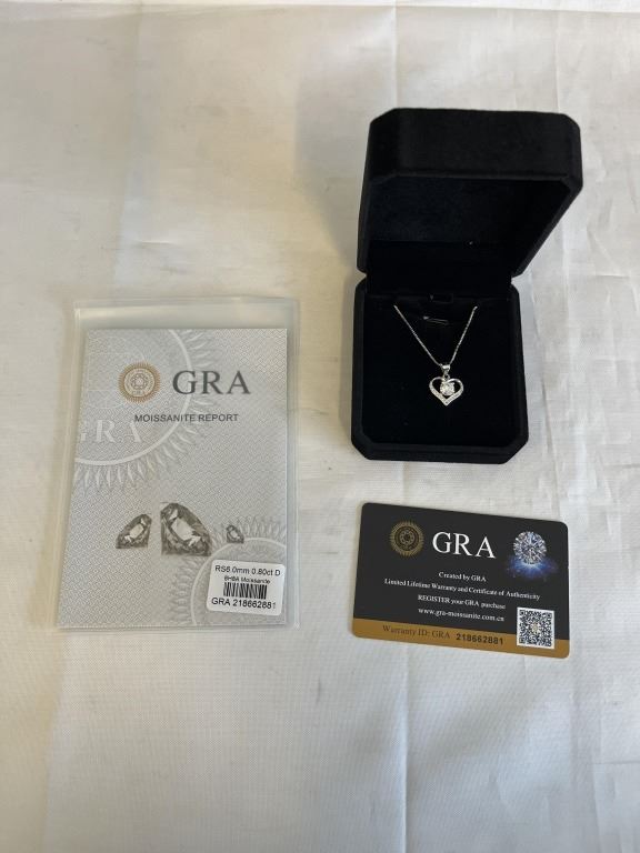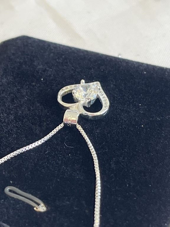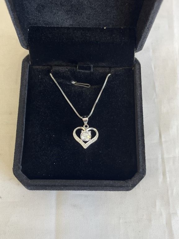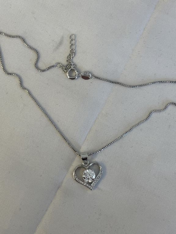 Lot 1067 NEW S925 9.8CT MOISSANITE STONE HEART NECKLACE, 16-17.5" LONG, MOUNTED IN 925 STERLING SILVER W/ WHI