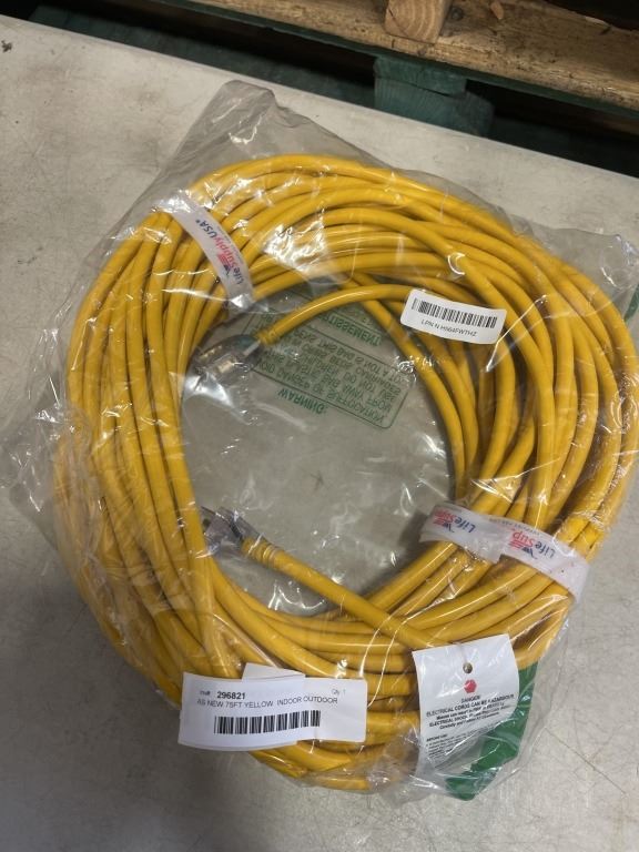 Lot 1101 AS NEW 75FT YELLOW INDOOR OUTDOOR HEAVY DUTY LIGHTED 3 WIRE GROUNDED EXTENSION CORD 14AWG