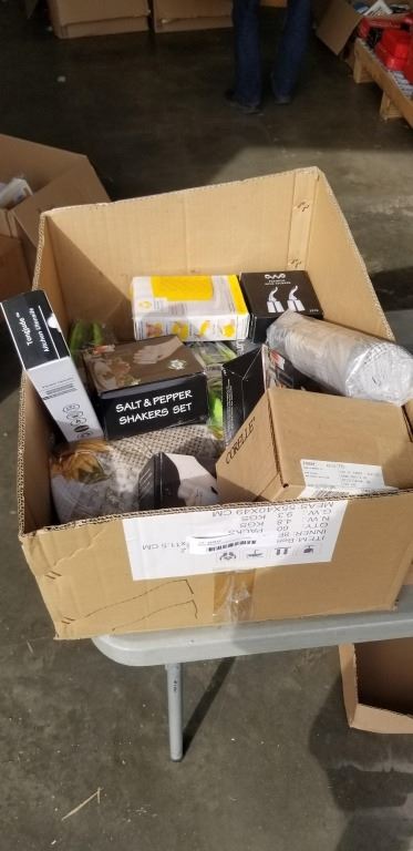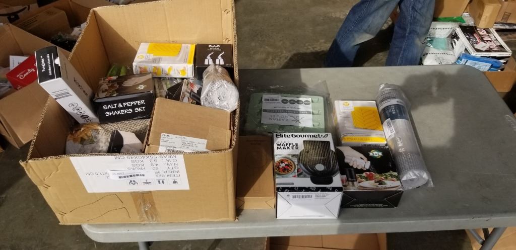 Lot 1122 NEW AMAZON OVERSTOCK ITEMS INCULDING MINI WAFFLE MAKER AND SALT AND PEPPER SHAKERS AND ICE CUBE TRAY