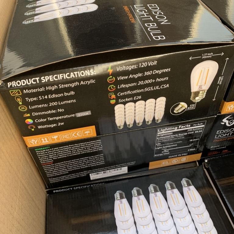 CASE OF 14 BOXES OF BERELLI S14 2700K E26 STANDARD SOCKET EDISON LIGHT BULBS 25 COUNT PER BOX RETAIL $1440