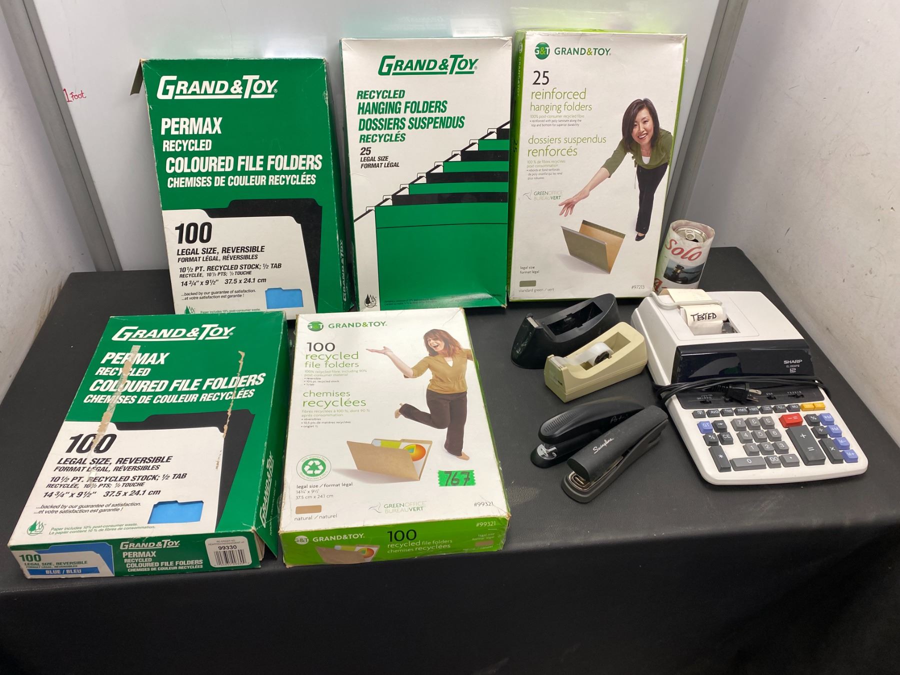 Lot 767 Lot of office supplies including file folders, calculator, tape dispensers, staplers