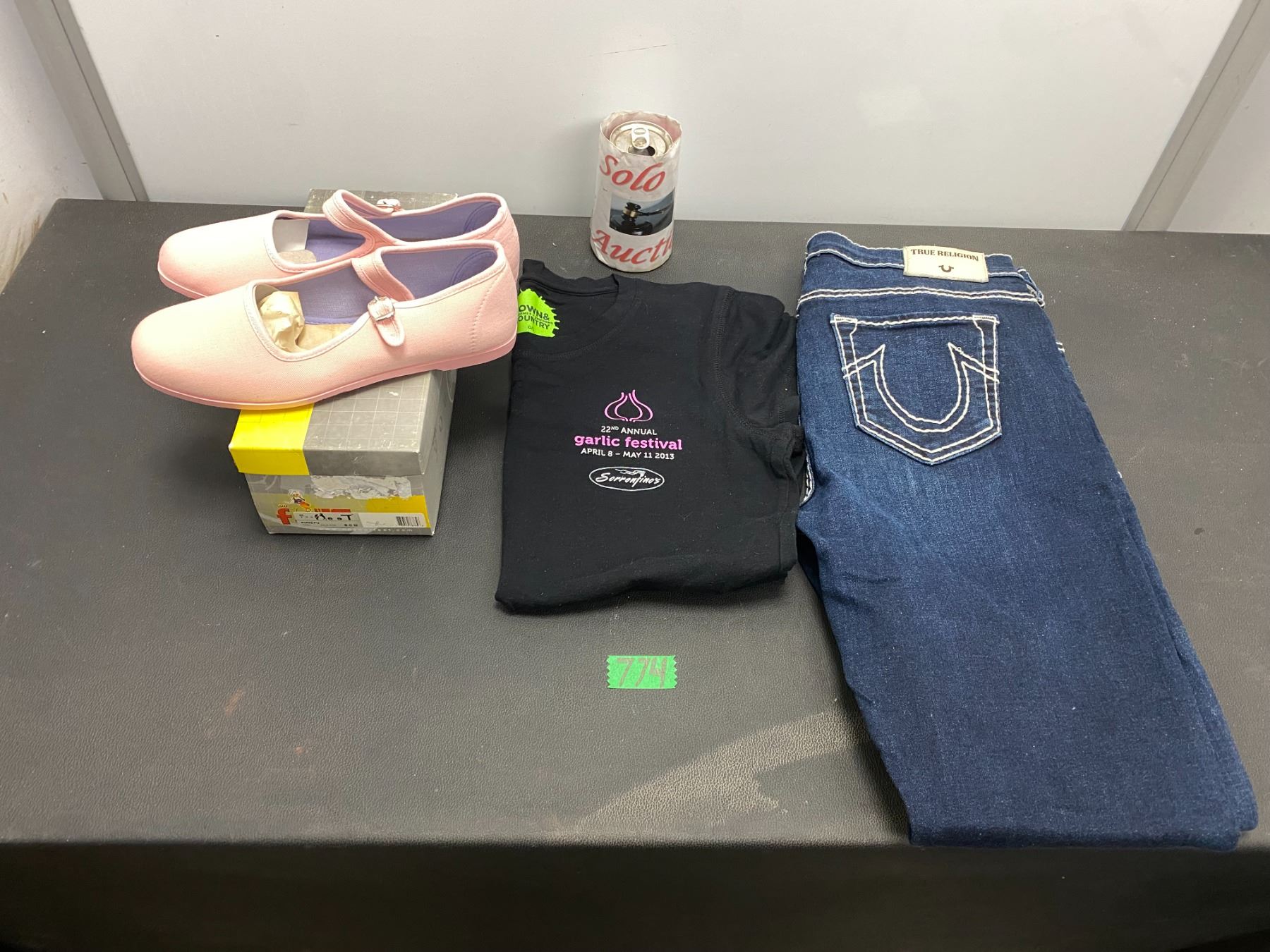 Lot 774 Women's jeans size 32, women's shoes size 6, and t-shirt