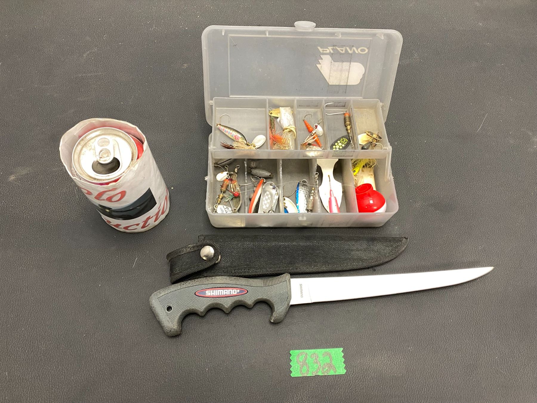 Lot 832 Box of fishing tackle with fillet knife