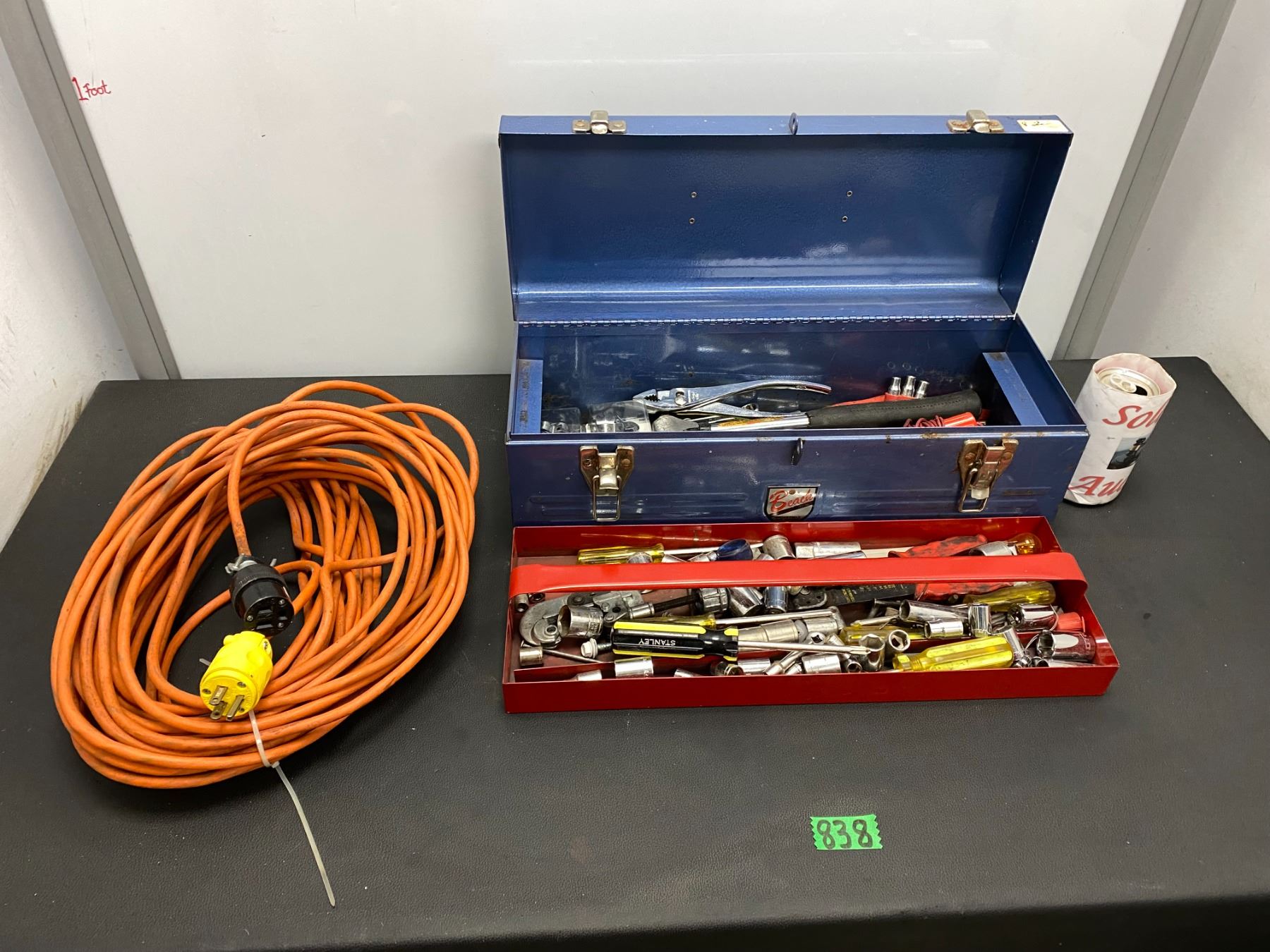 Lot 838 Metal tool box full of hand tools, extension cord