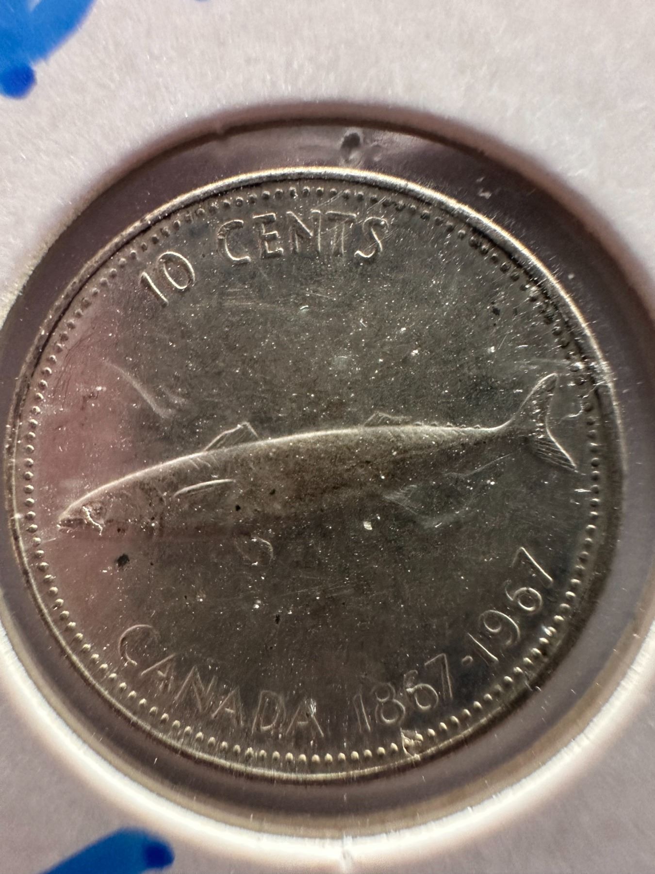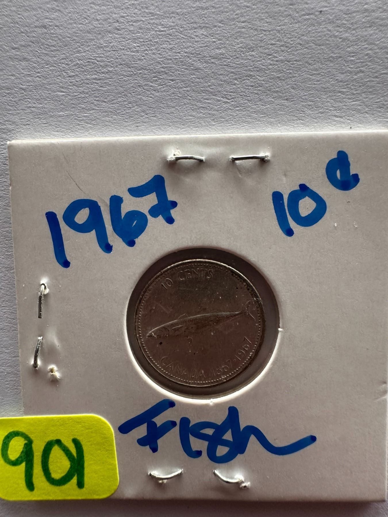 Lot 901 1967 Canadian silver centennial 10 cent coin featuring a mackerel
