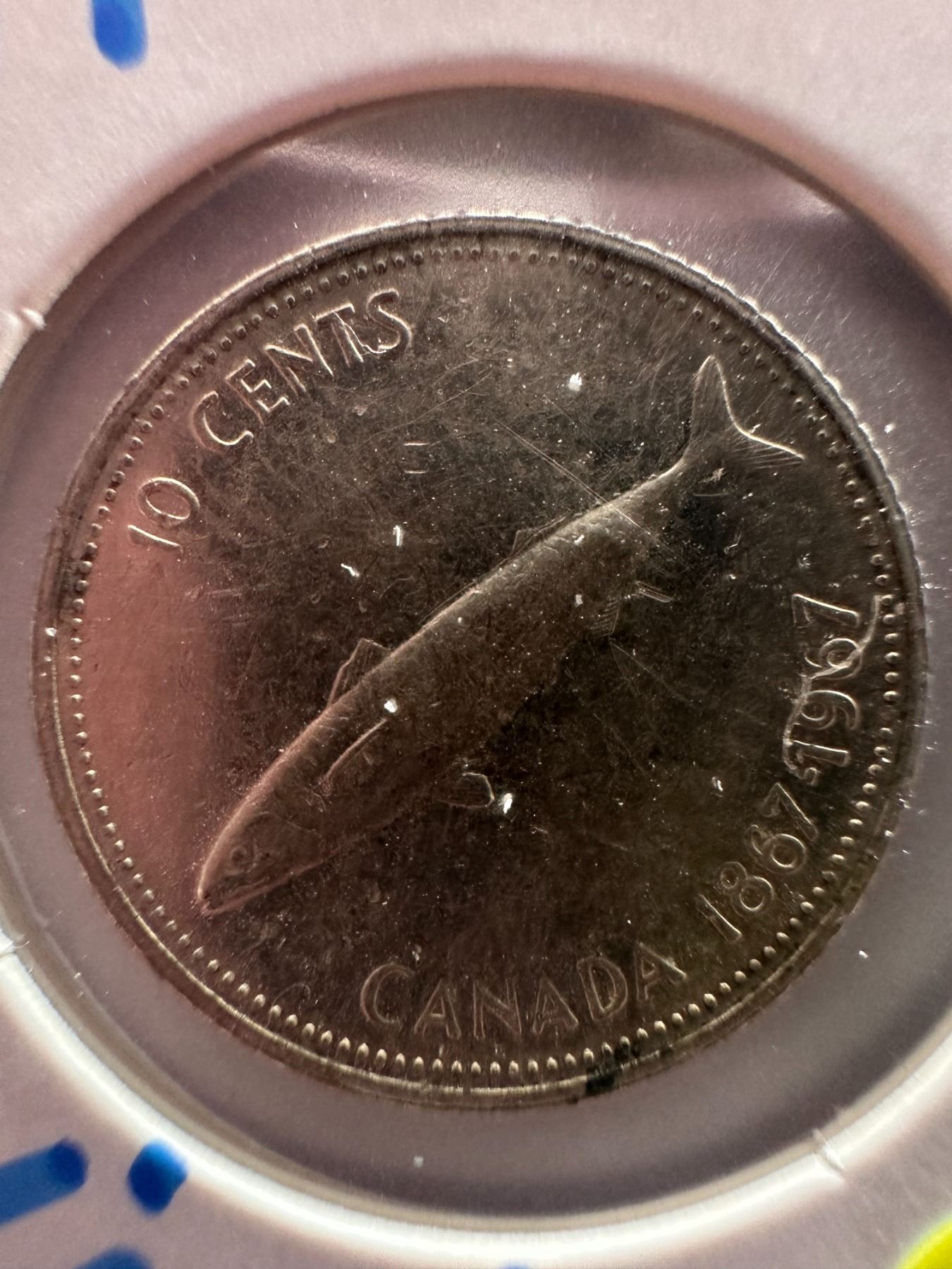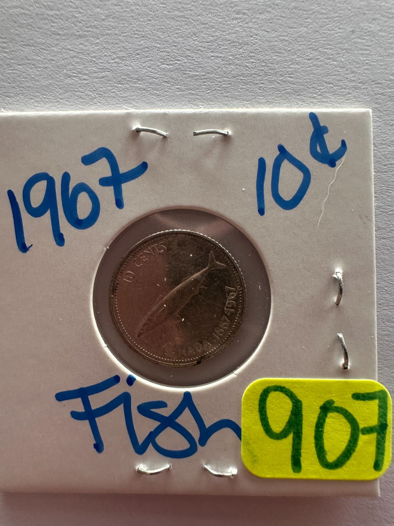 Lot 907 1967 Canadian silver centennial 10 cent coin featuring a mackerel