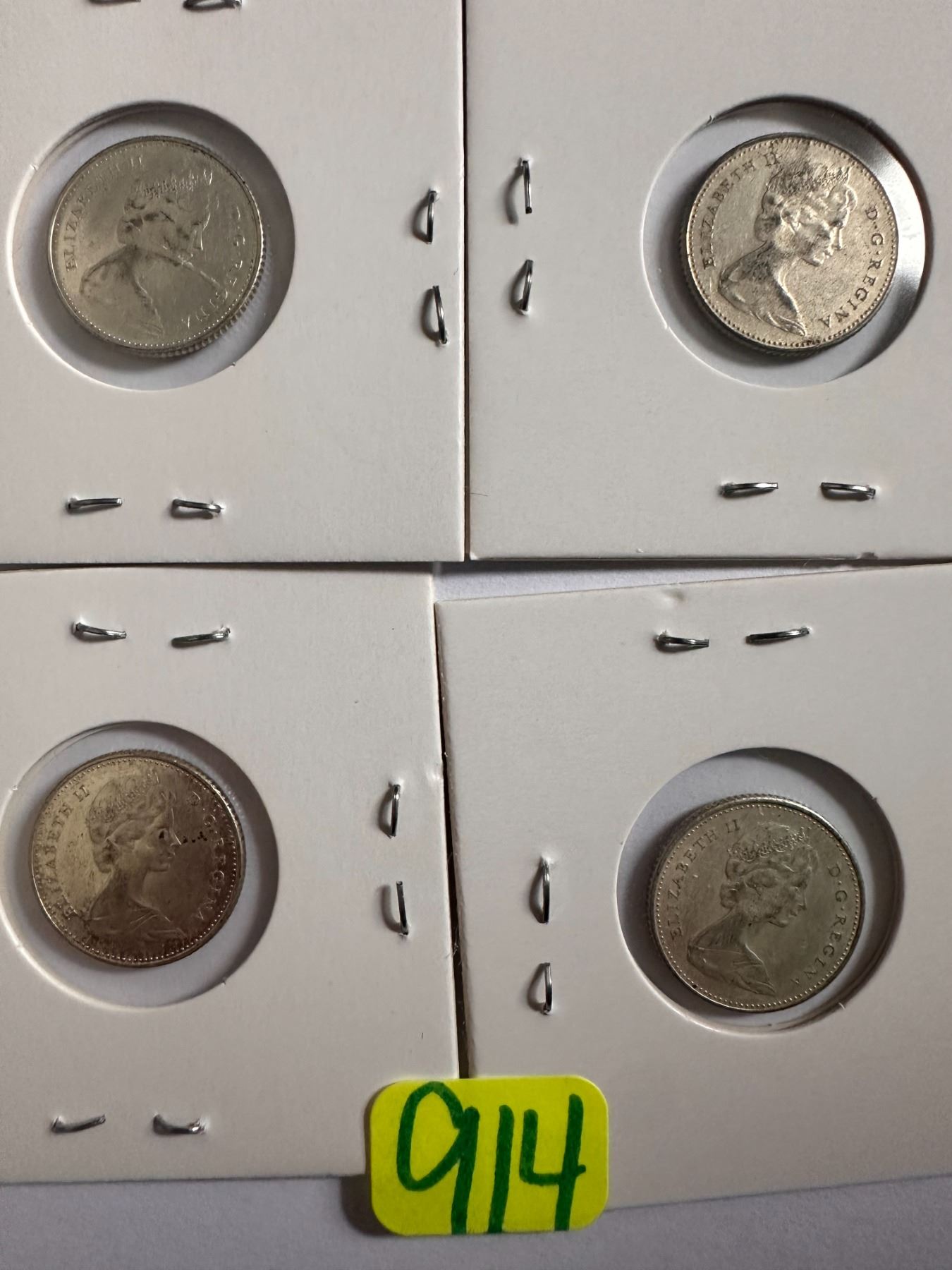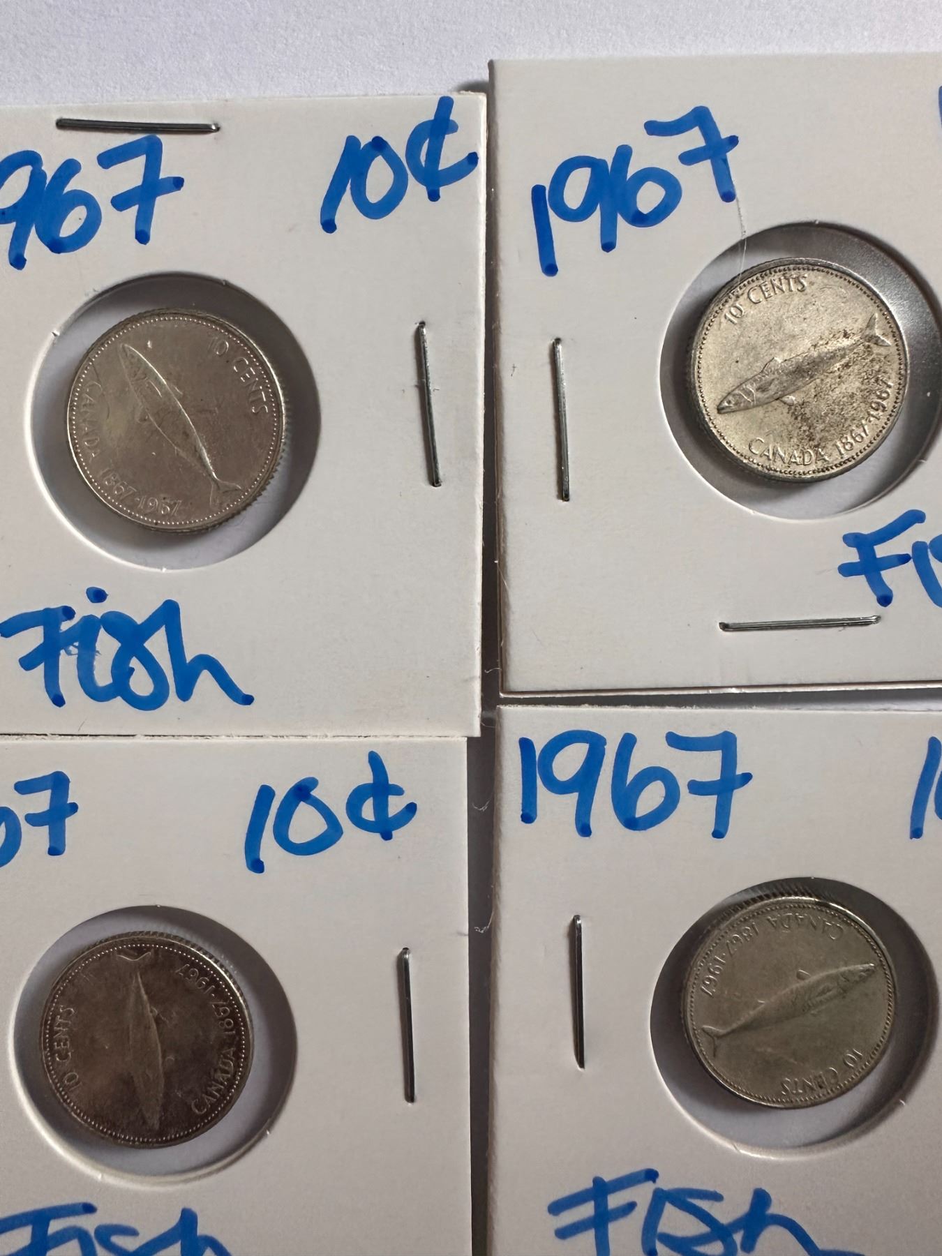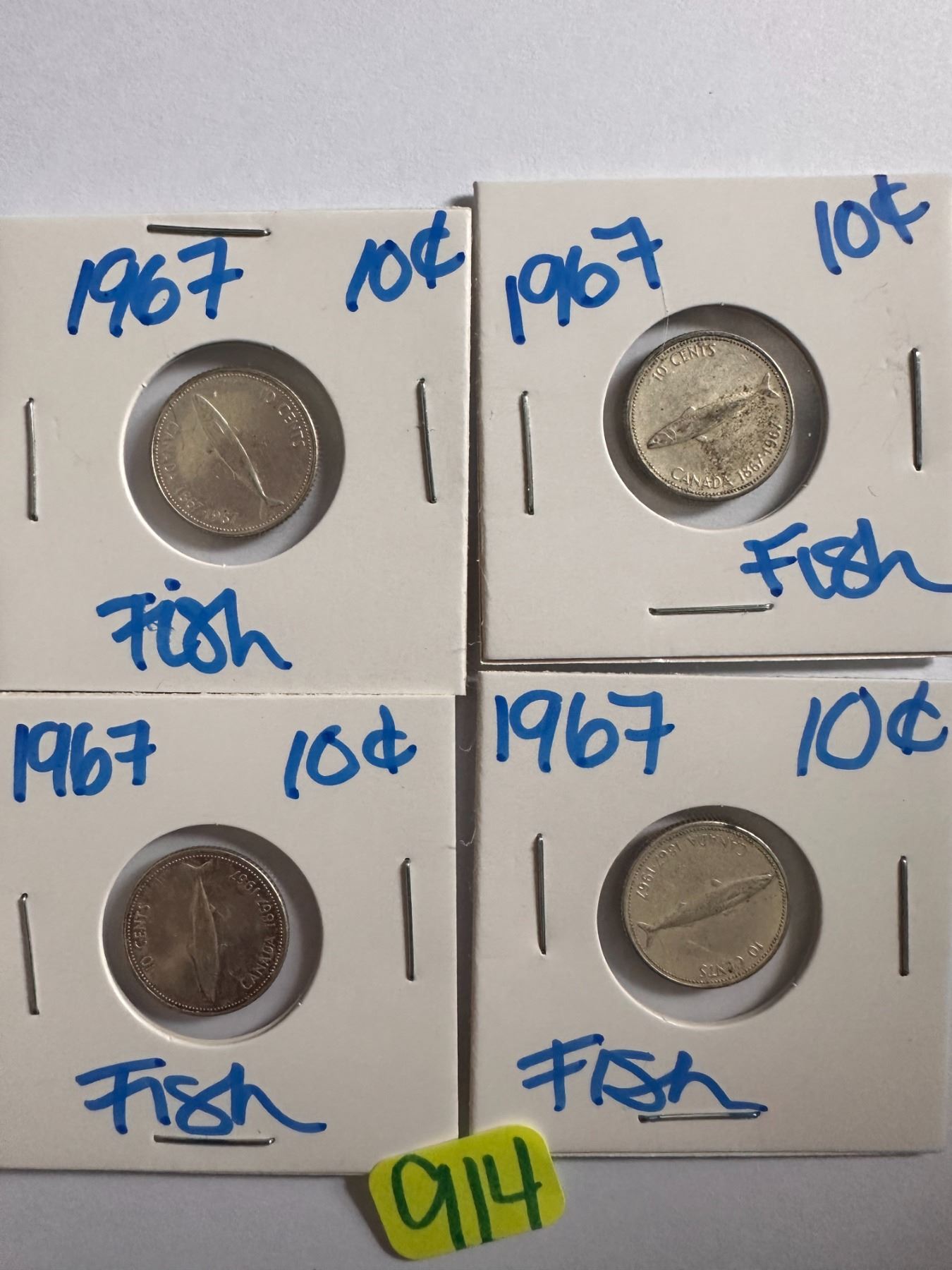 Lot 914 4- 1967 Canadian silver centennial 10 cent coins featuring a mackerel