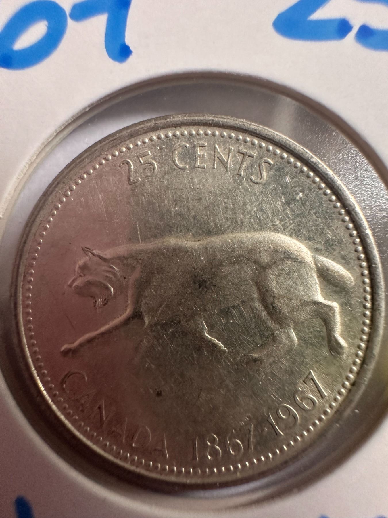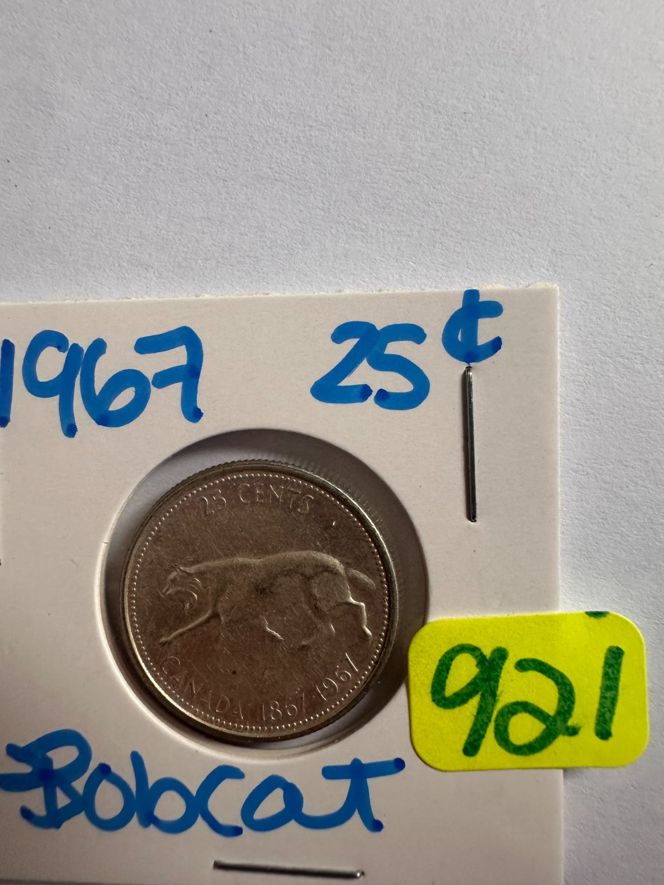 Lot 921 1967 Canadian silver centennial 25 cent coin featuring a Bobcat