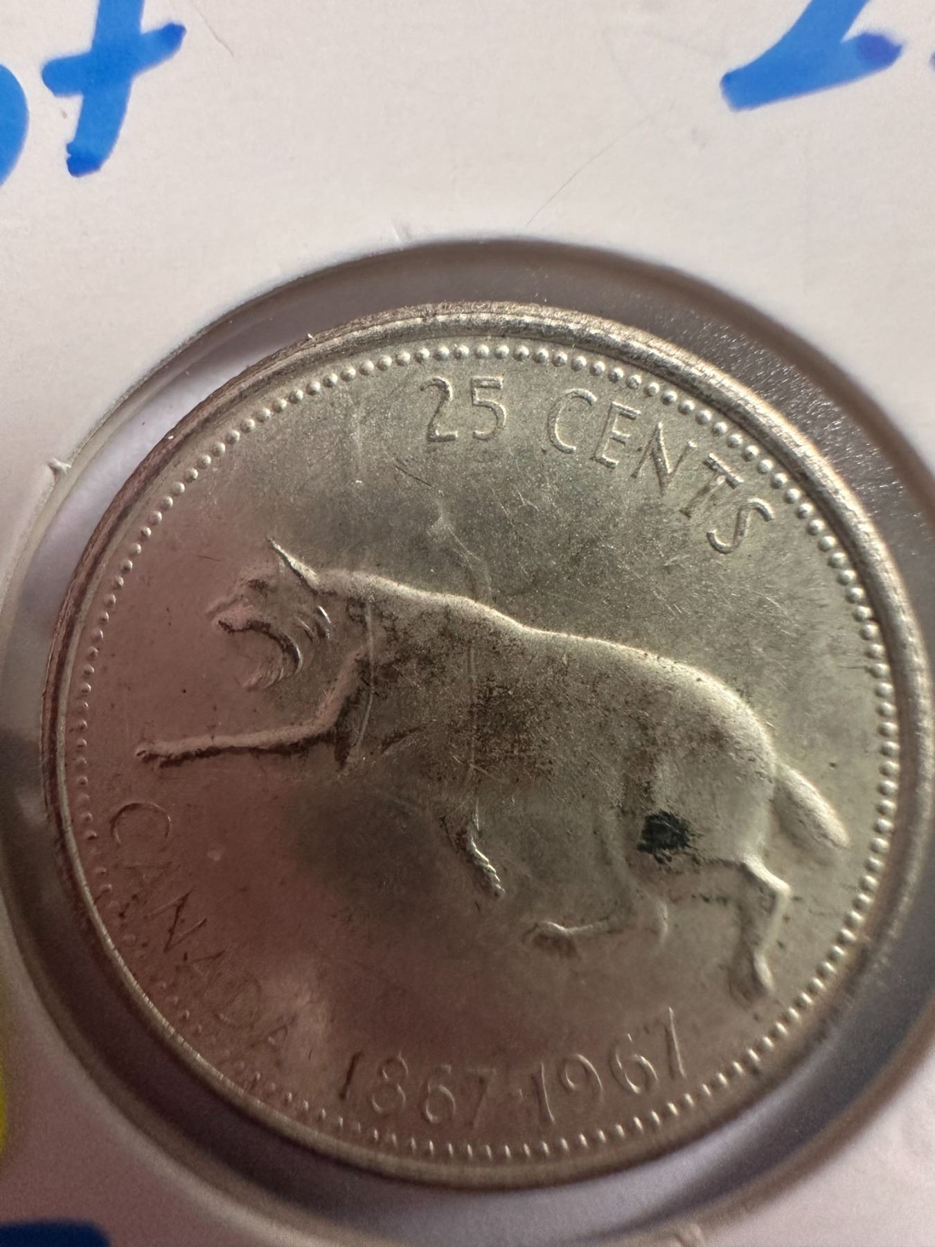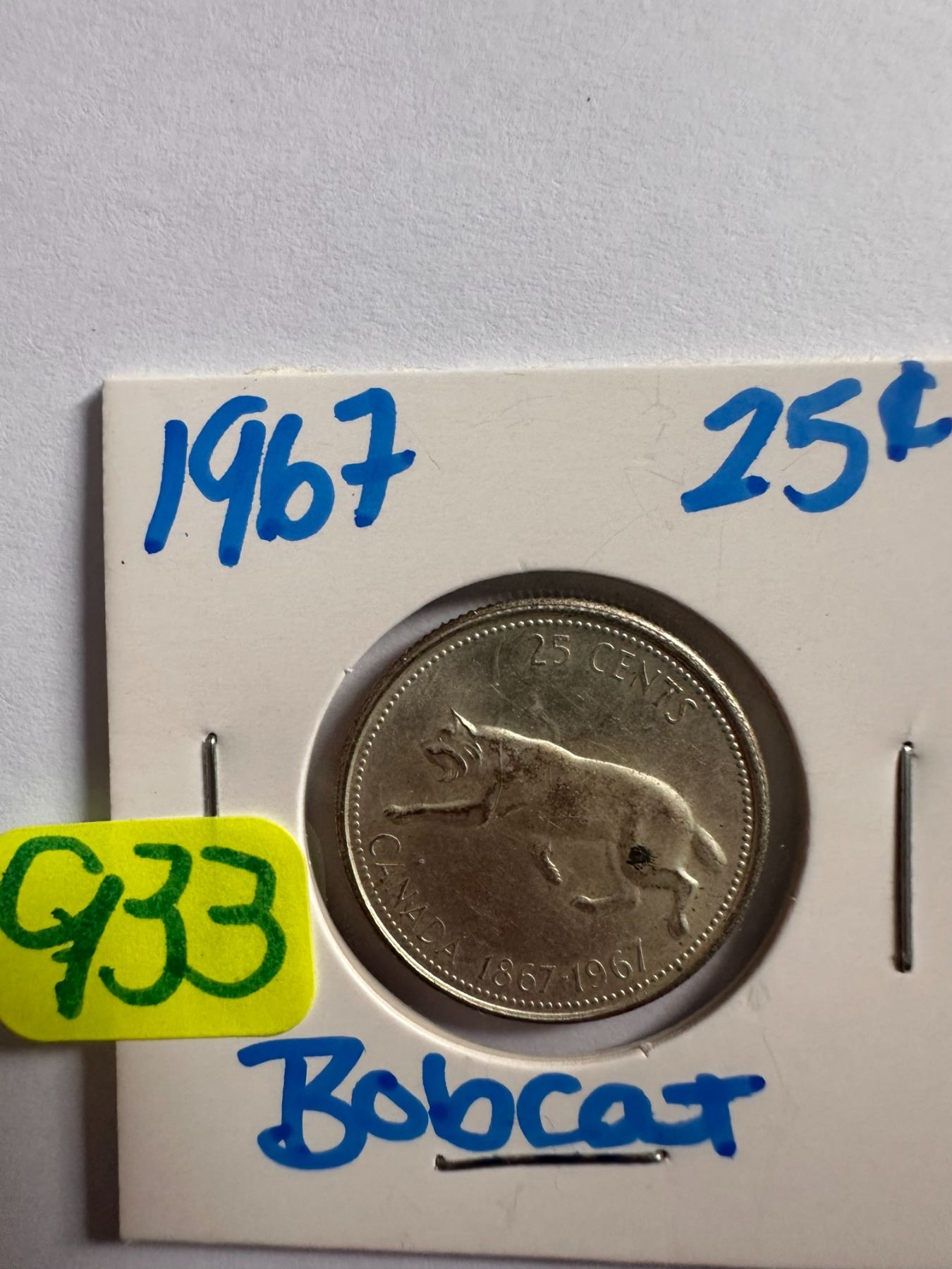 Lot 933 1967 Canadian silver centennial 25 cent coin featuring a Bobcat