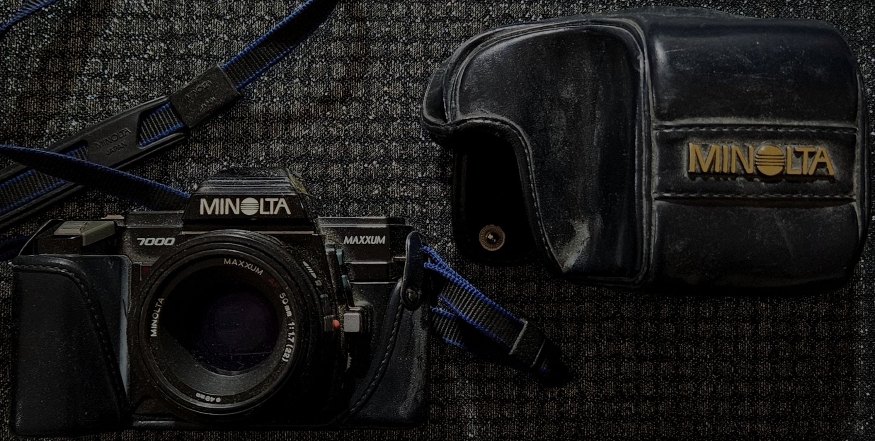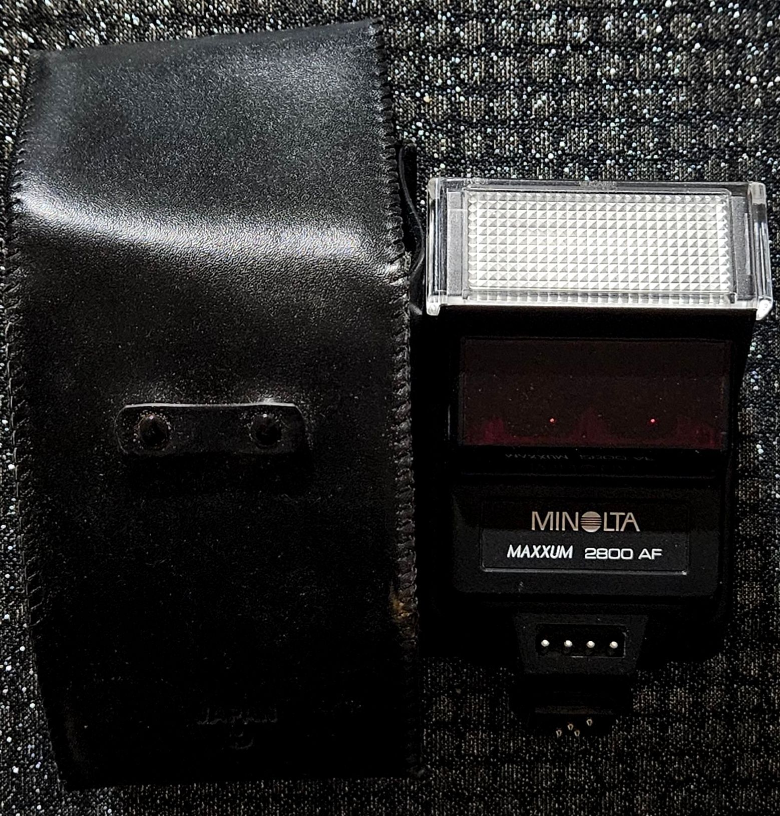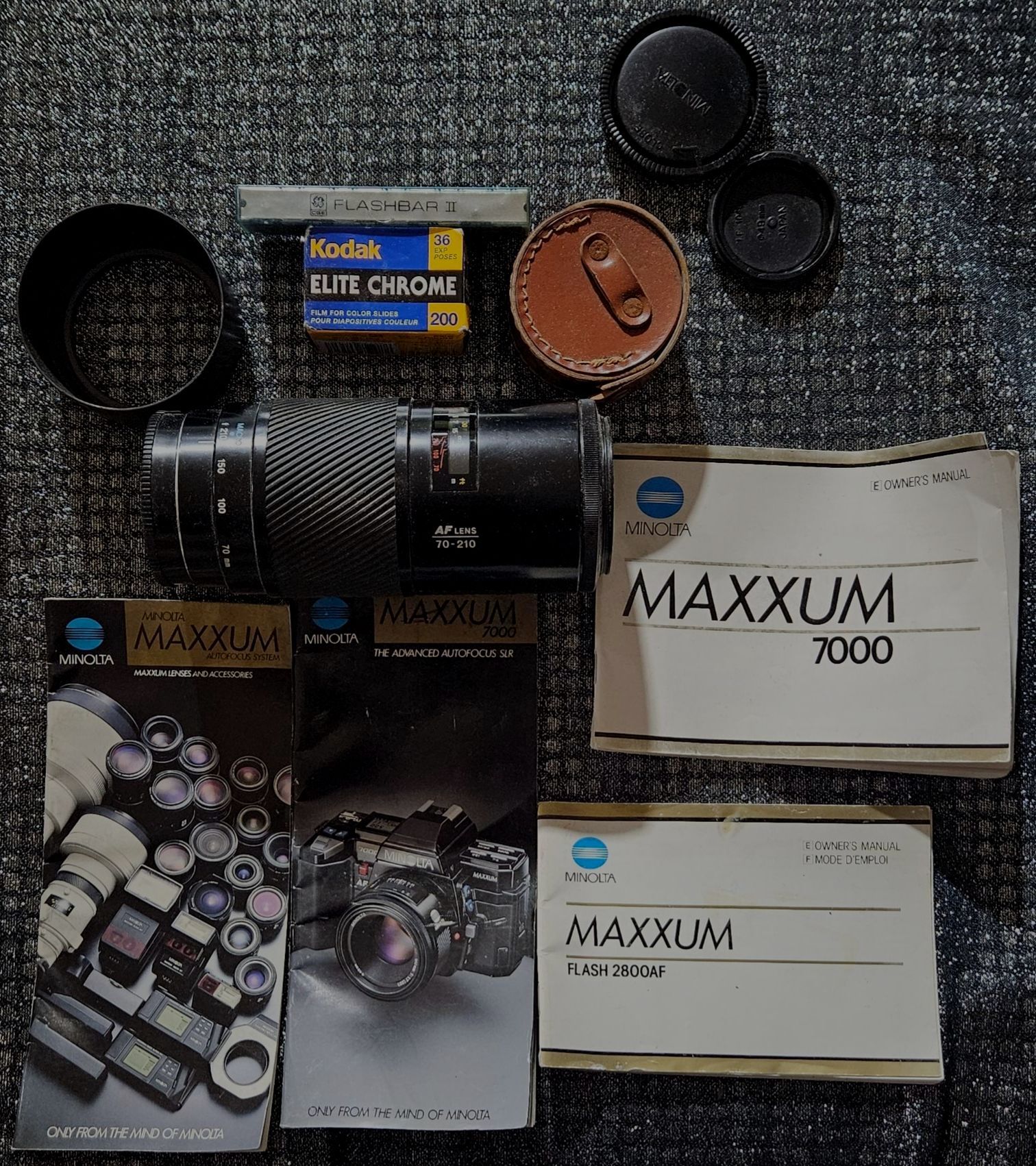 Beautiful collection of accessories are included with this Minolta Maxxum 7000 film camera. Includes film, a flash attachment, a flashbar, an extra lens and operation manuals.