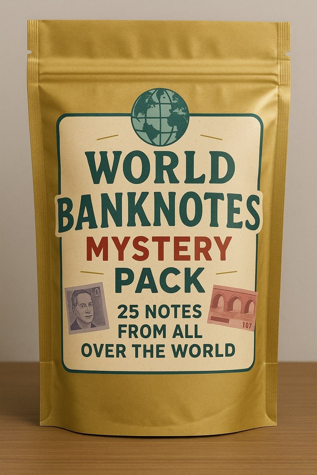 Step into the fascinating world of currency collecting with this World Banknotes Mystery Pack, offering 25 different banknotes from countries across the globe. Each pack delivers a diverse assortment of designs, denominations, and cultural historyÑperfect for both seasoned collectors and newcomers to the hobby. The majority of notes in these packs range from Uncirculated (UNC) to Gem condition, ensuring crisp detail, vibrant color, and collectible quality. With origins spanning multiple continents, each Mystery Pack is a journey through world history, art, and economicsÑall in the palm of your hand. Whether youÕre looking to expand your collection, begin a new hobby, or gift a unique set to an enthusiast, this Mystery Pack offers tremendous variety and long-term collectible value. Bid now and secure your chance at owning a global mix of banknotes in premium condition! Ð 29877