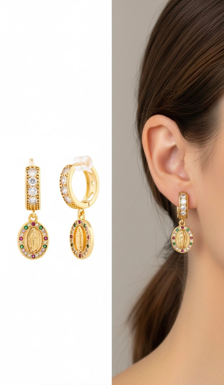 18kt Oro Laminado Hoop Earrings w/ Oval St. Jude Pendant & Gemstones Around Ð 2075
