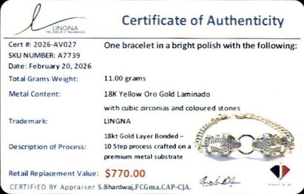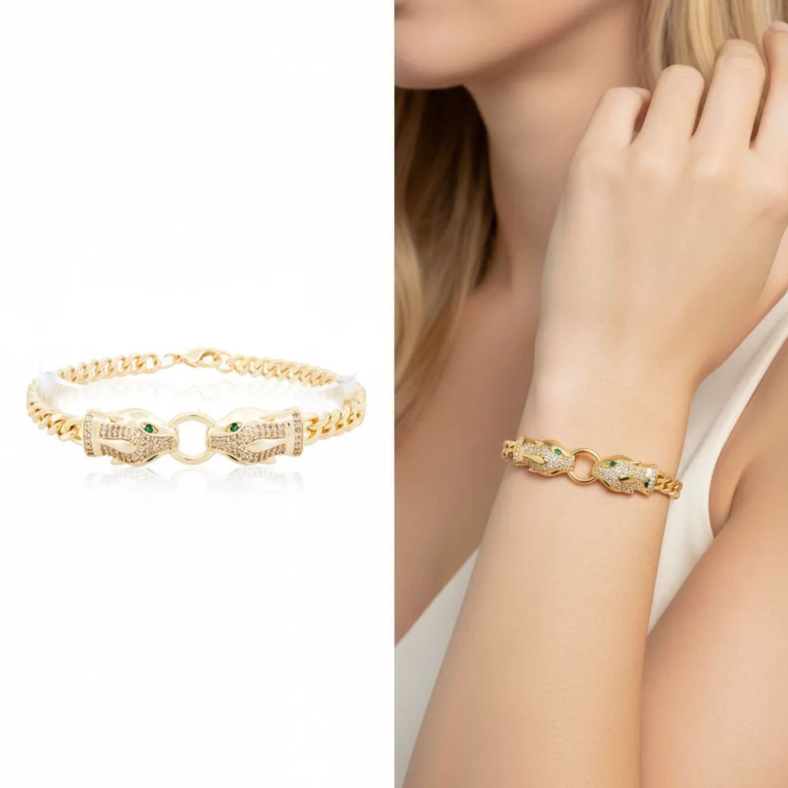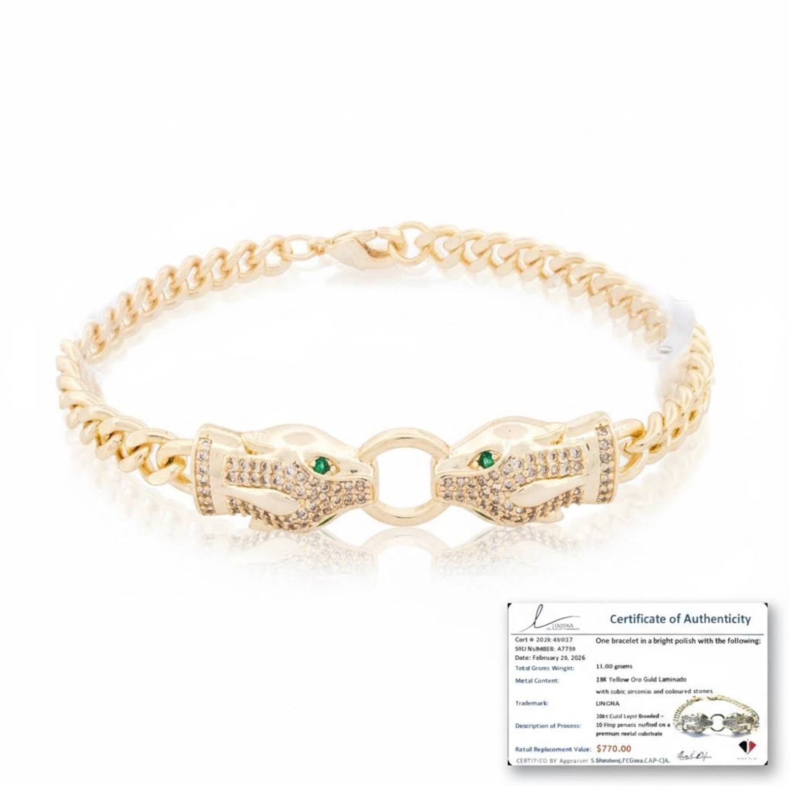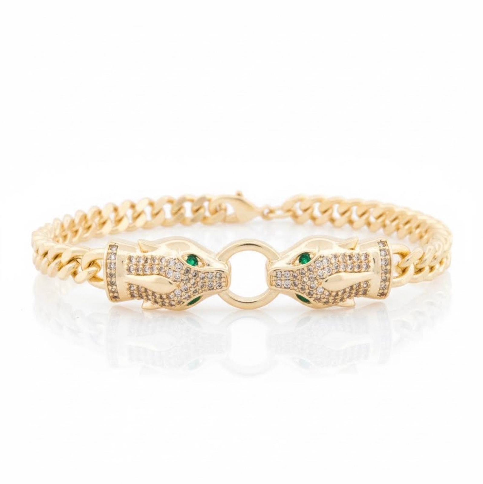 18kt Gold-Overlay Oro Laminado Double Panther-Head Bracelet, each panther biting a round baguette-set circle with emerald-green eyes, presented on a Cuban link chain. COA. - RRV:$770.00 Ð A7739