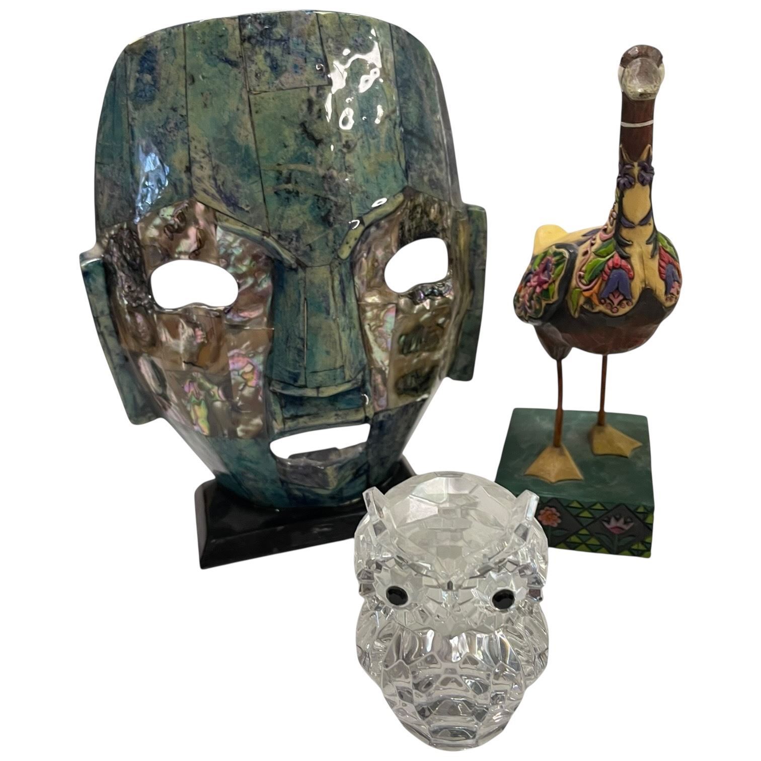Lot 785 Lacquered Mask with Abalone Detail, Wood Goose Statuette, and Assorted Decorative Items