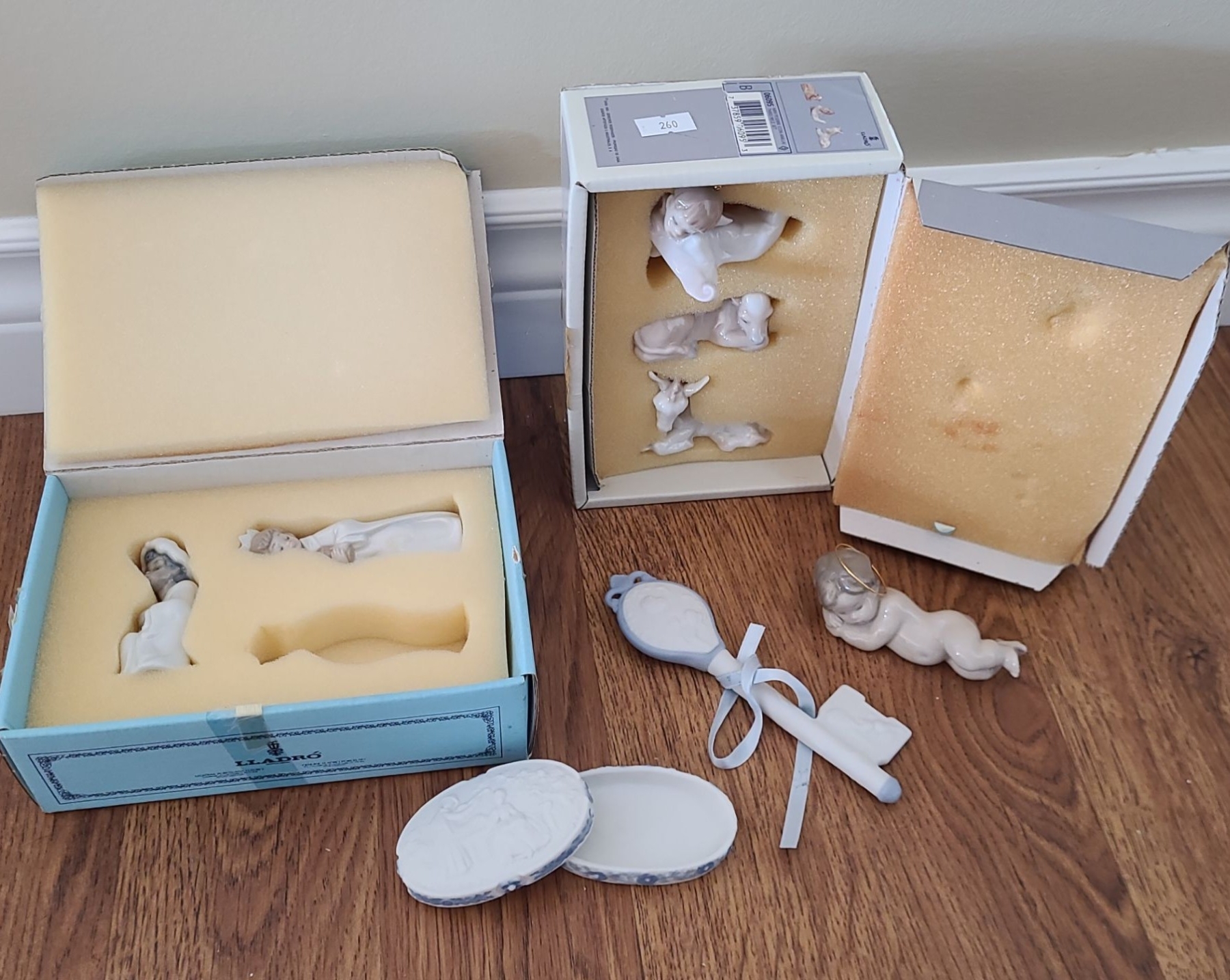 Lot 260 Lladro Decor: Key 6 W, 3.5 D, 1.5 T, Oval Box 3 W, 2 D, 1 T, Baby and Animal Ornaments