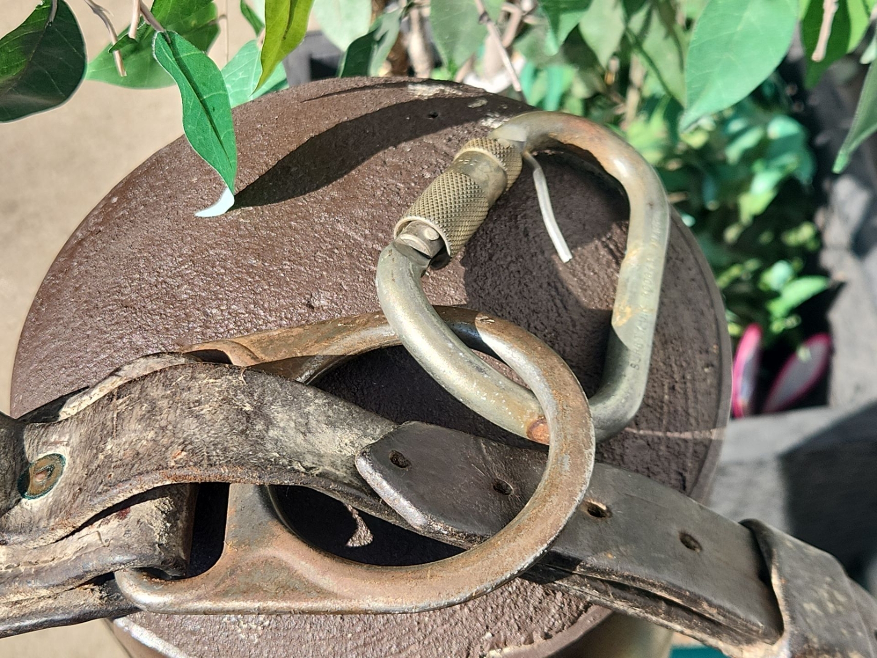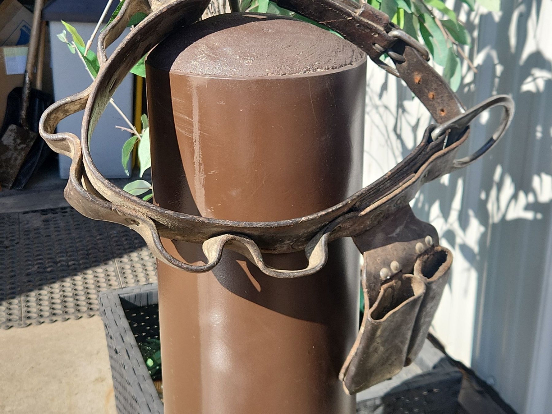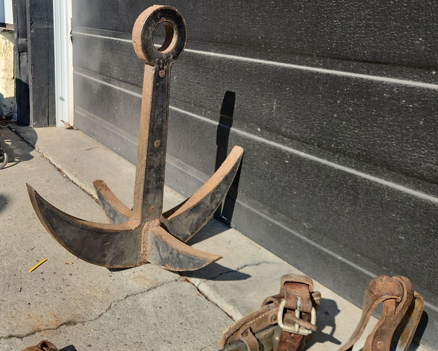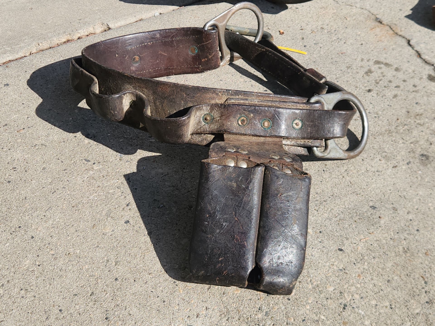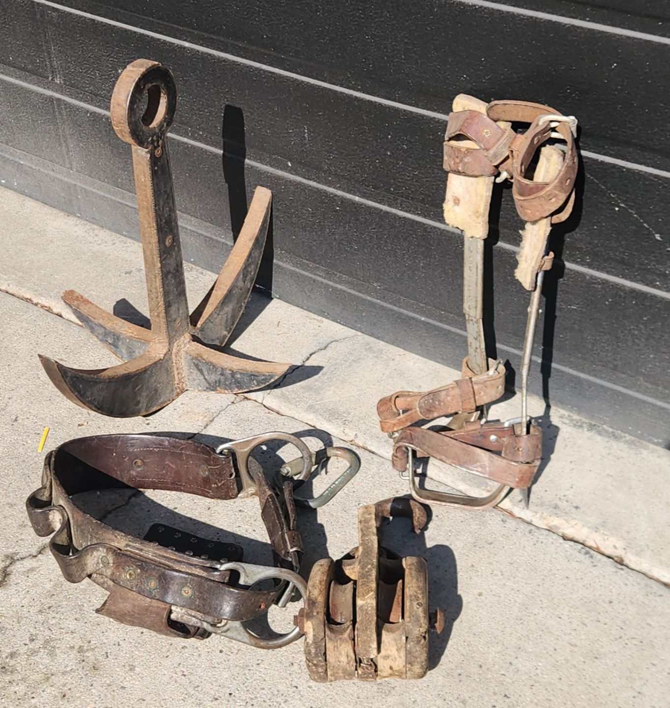 This lot features an assortment of vintage work gear, including a leather belt, old pulley, metal anchor, and lineman spurs. Each piece carries a rich history and rugged character, perfect for collectors, decorators, or enthusiasts of antique tools and industrial memorabilia.