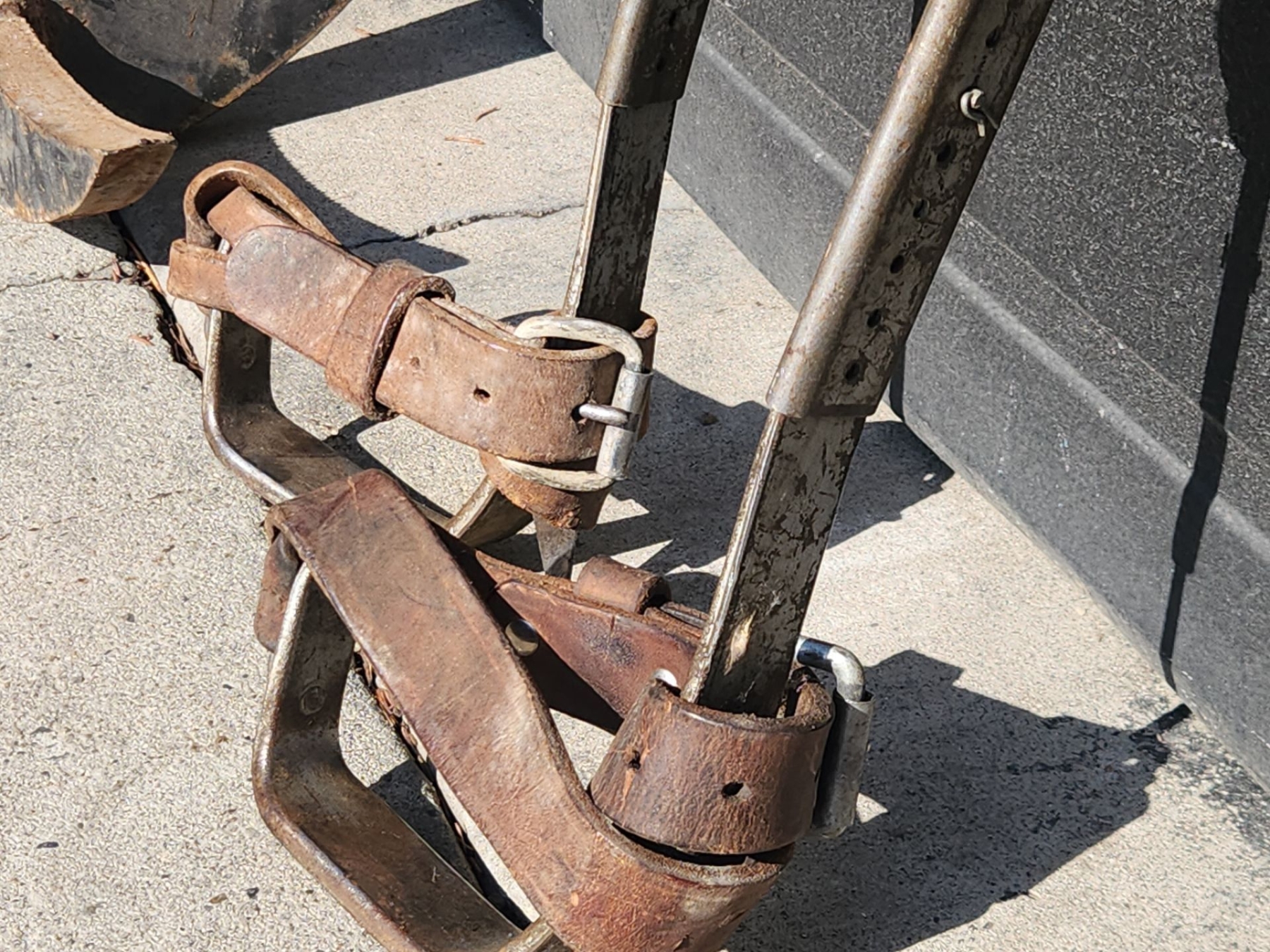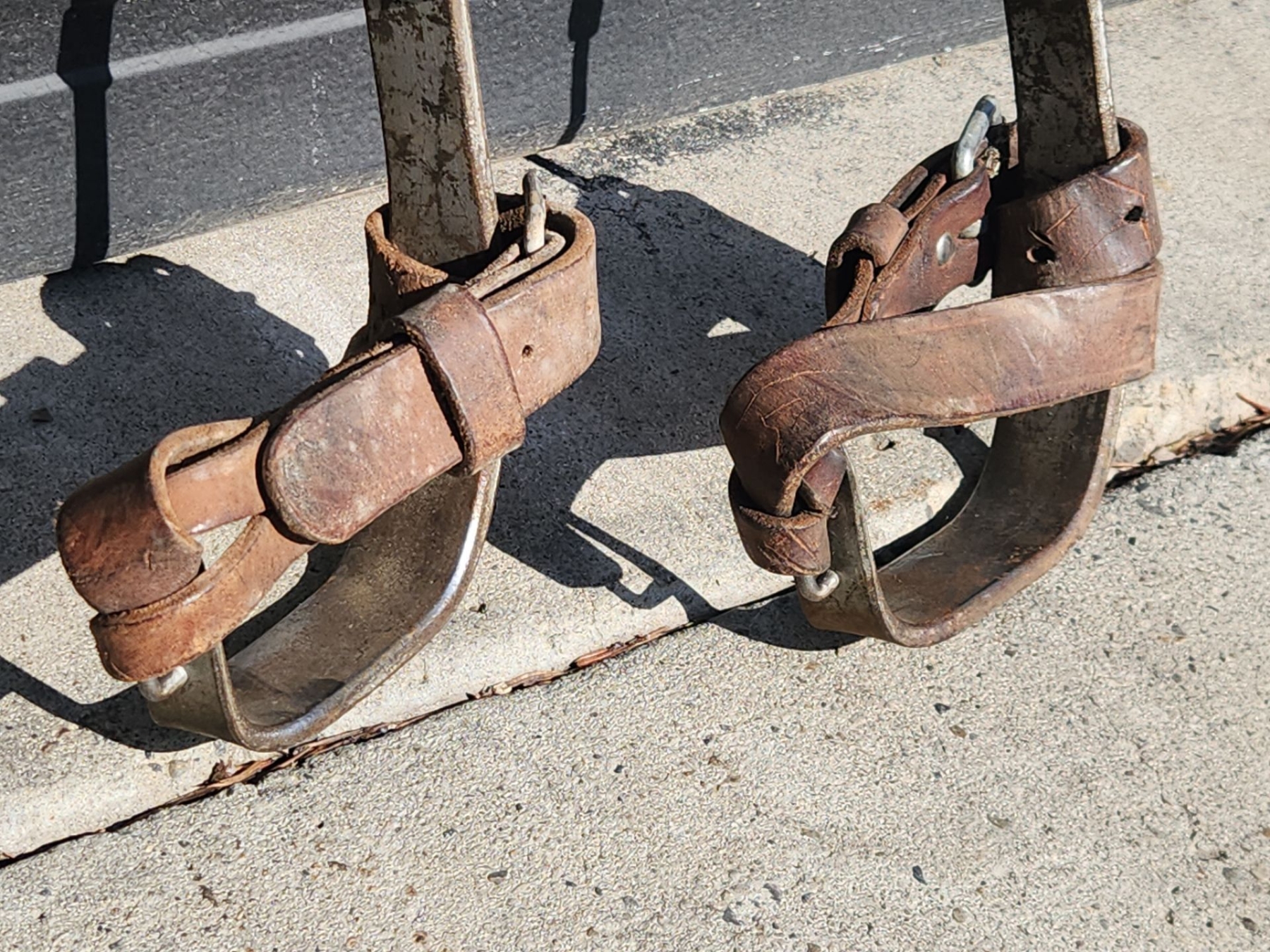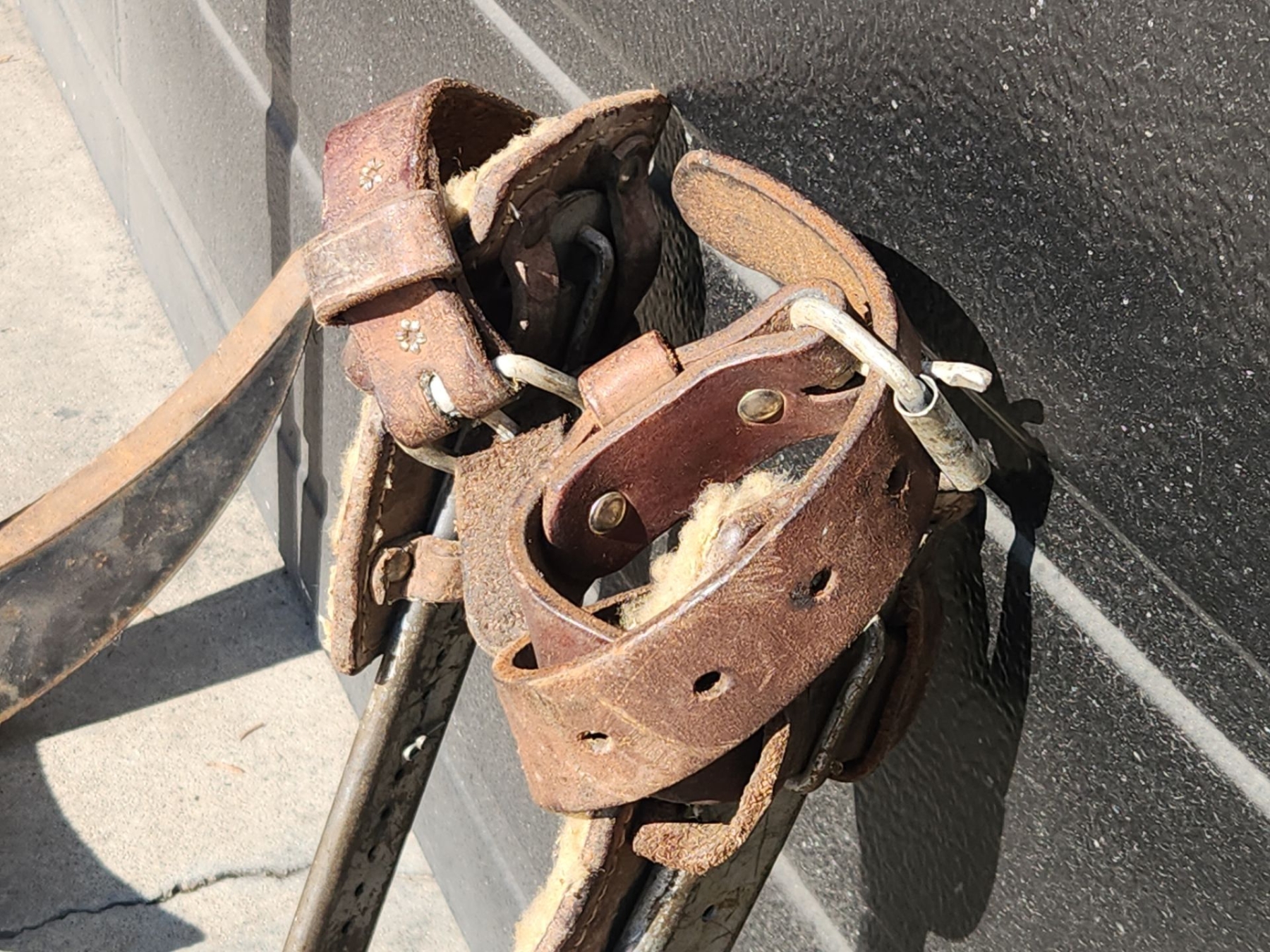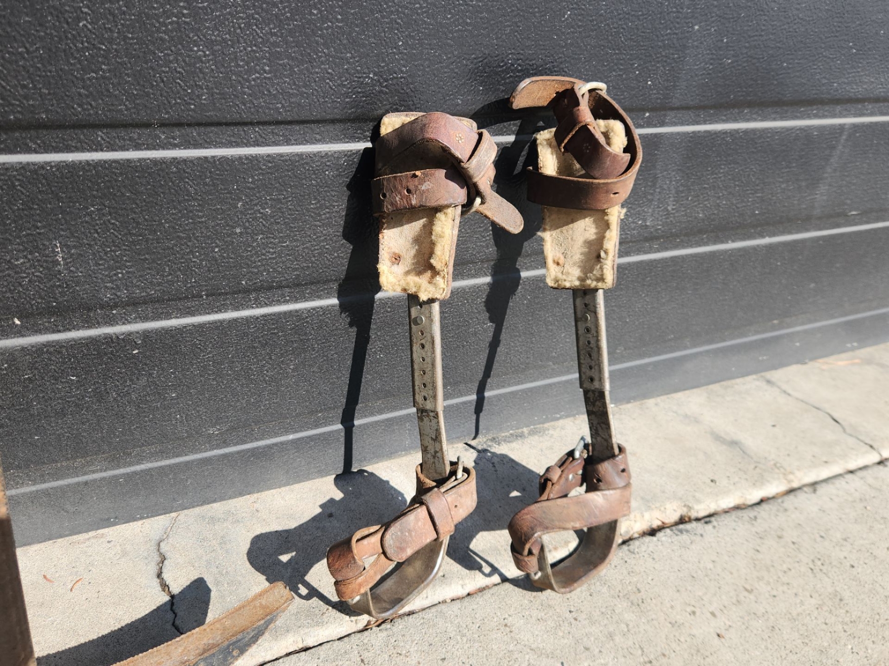 This lot features an assortment of vintage work gear, including a leather belt, old pulley, metal anchor, and lineman spurs. Each piece carries a rich history and rugged character, perfect for collectors, decorators, or enthusiasts of antique tools and industrial memorabilia.