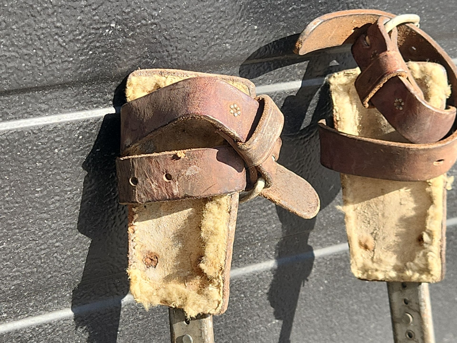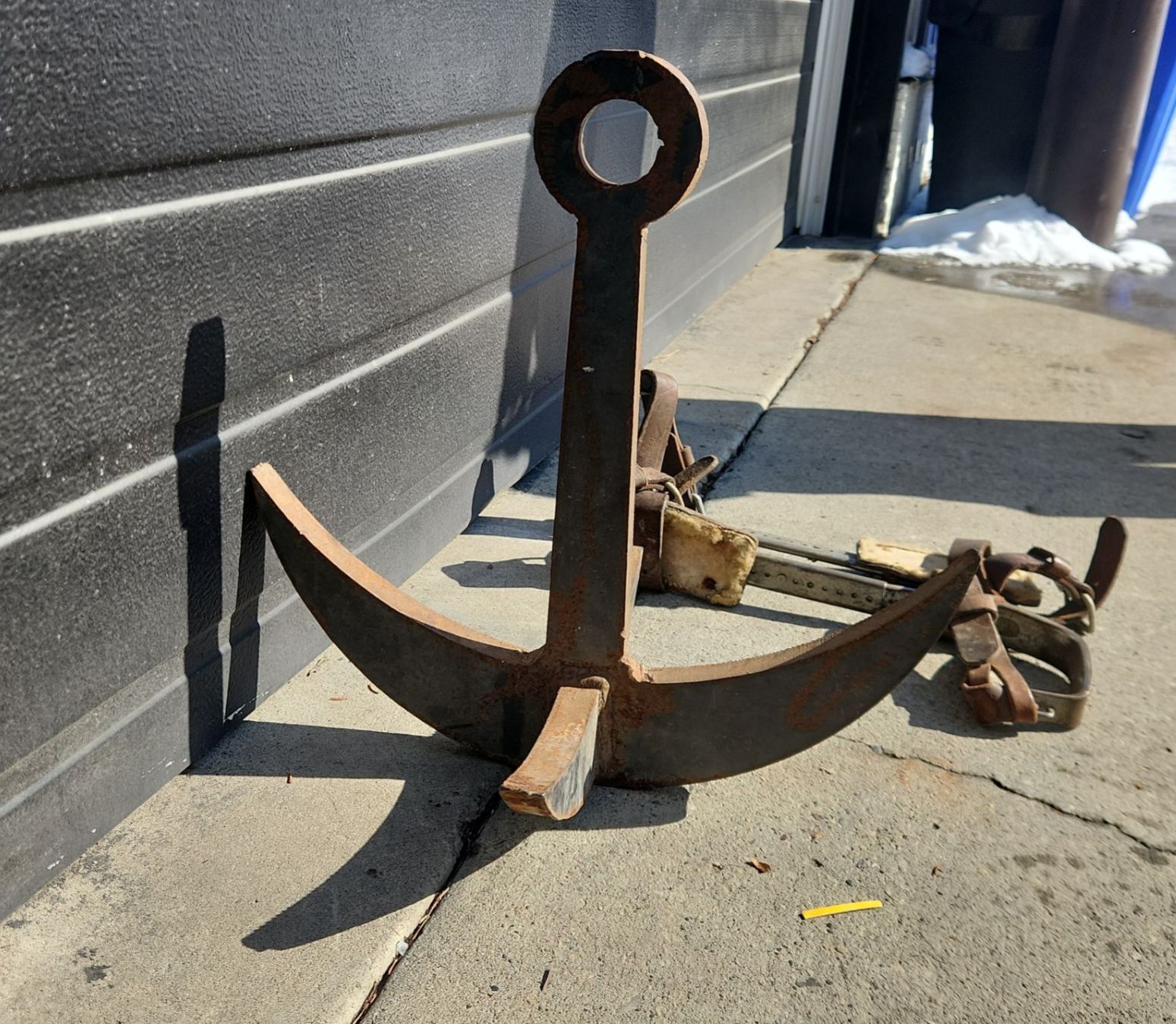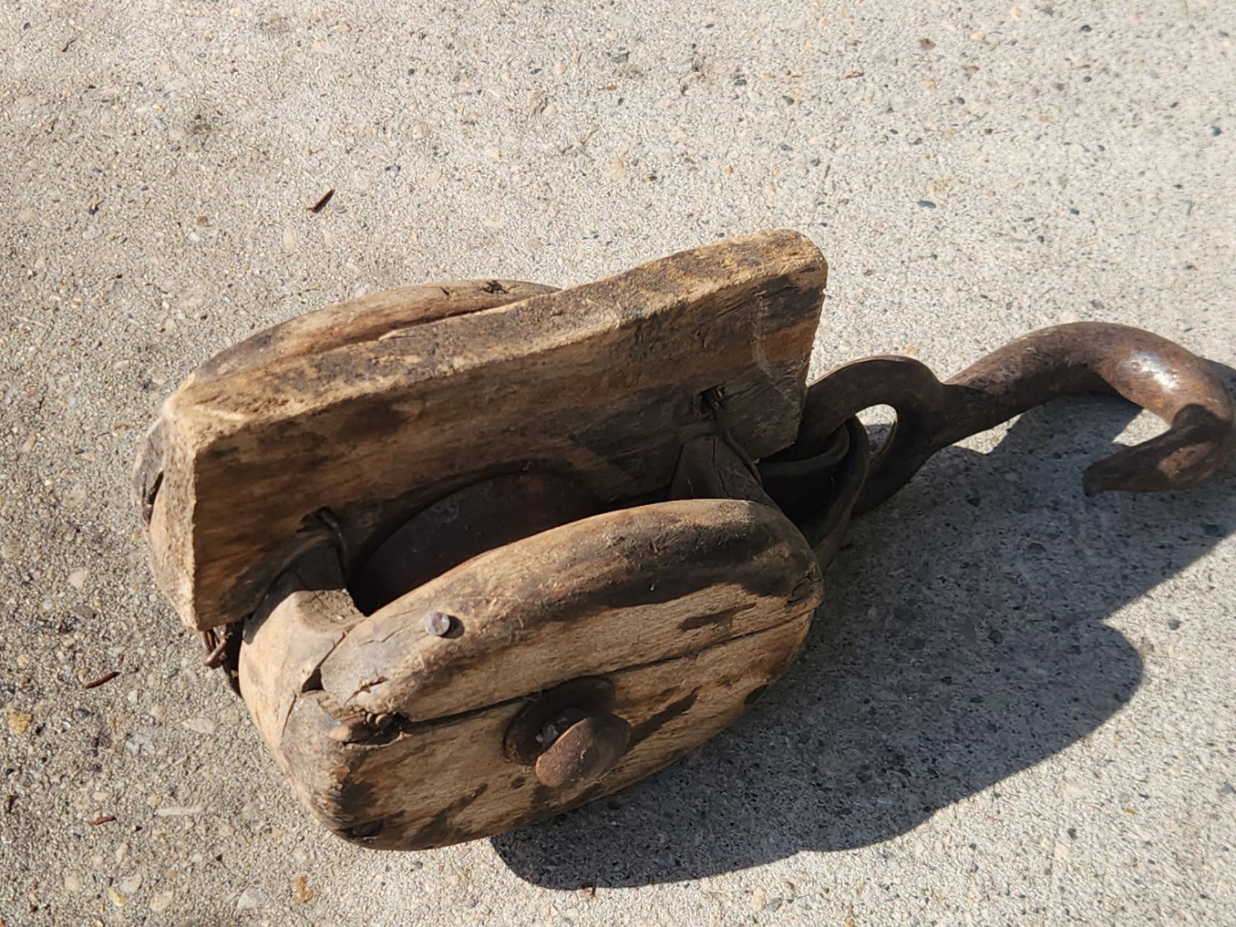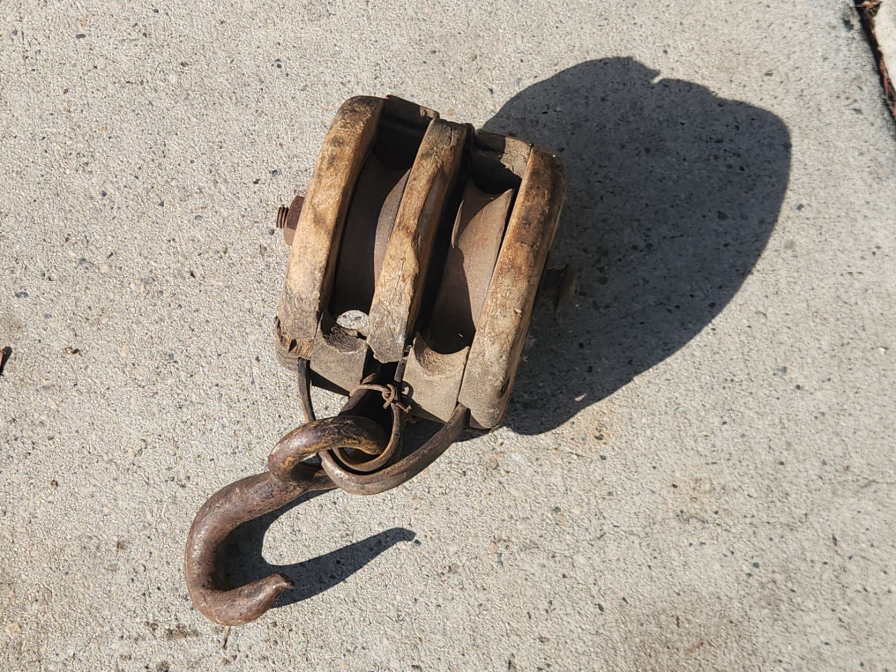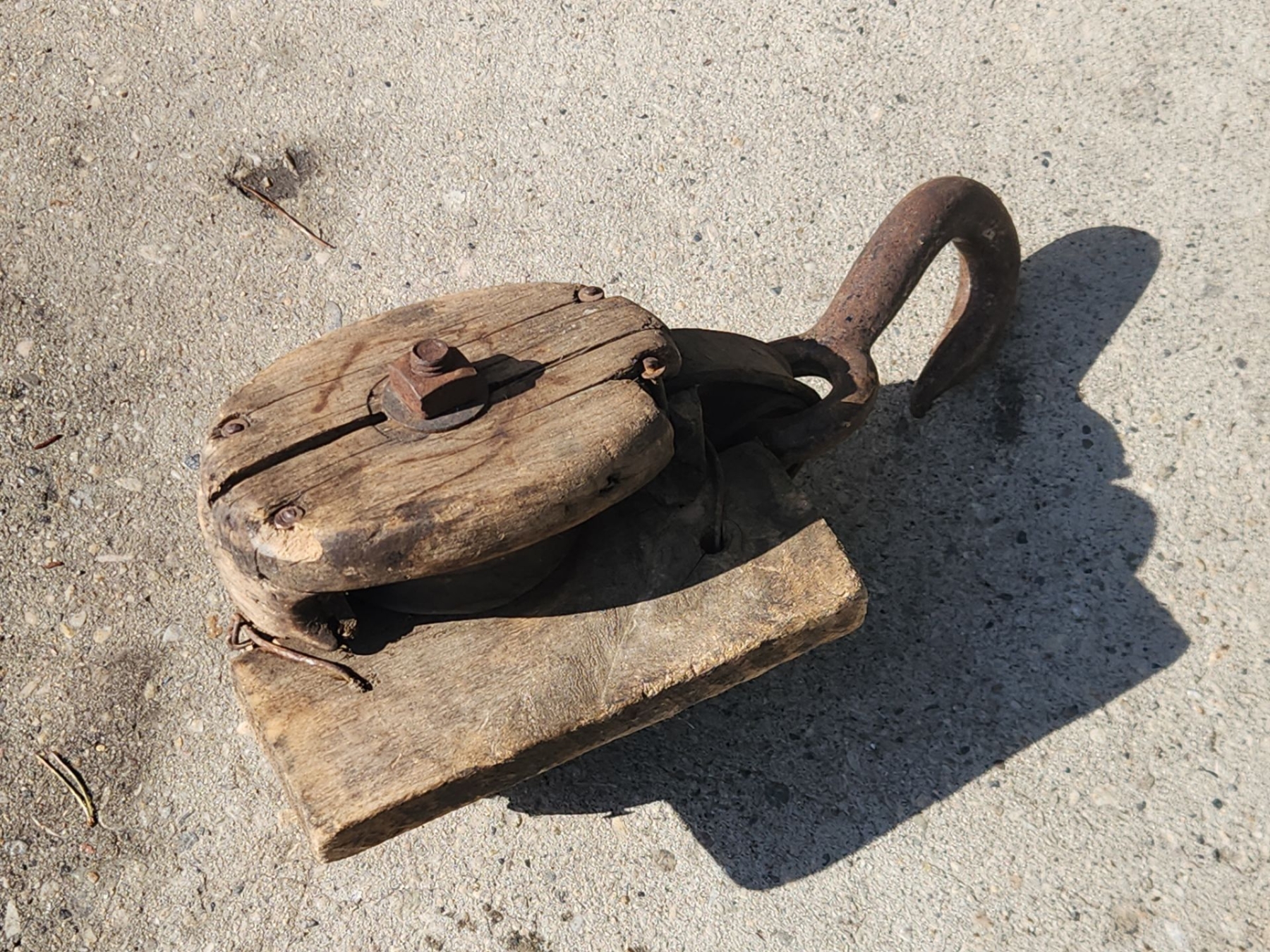 This lot features an assortment of vintage work gear, including a leather belt, old pulley, metal anchor, and lineman spurs. Each piece carries a rich history and rugged character, perfect for collectors, decorators, or enthusiasts of antique tools and industrial memorabilia.