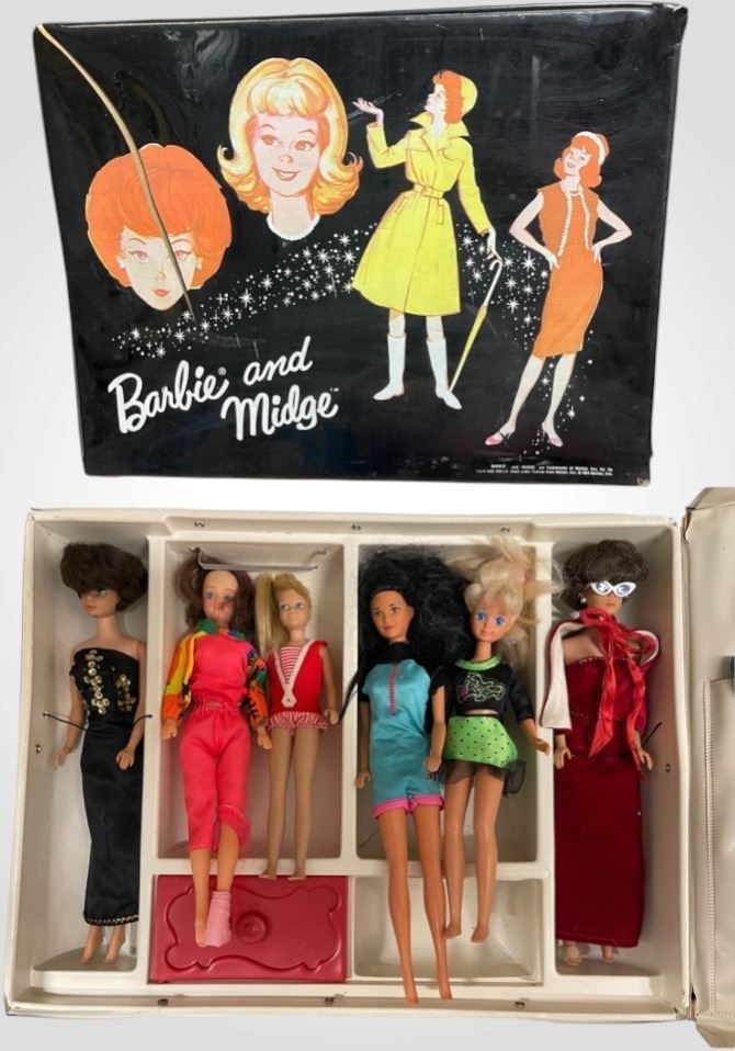 Lot 347a 2-pcs 1960s Straight Leg Bubble Cut Barbies, 4-pcs Extra Dolls & Midge Doll Case