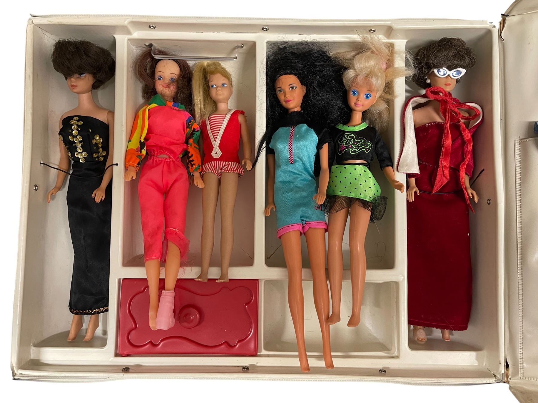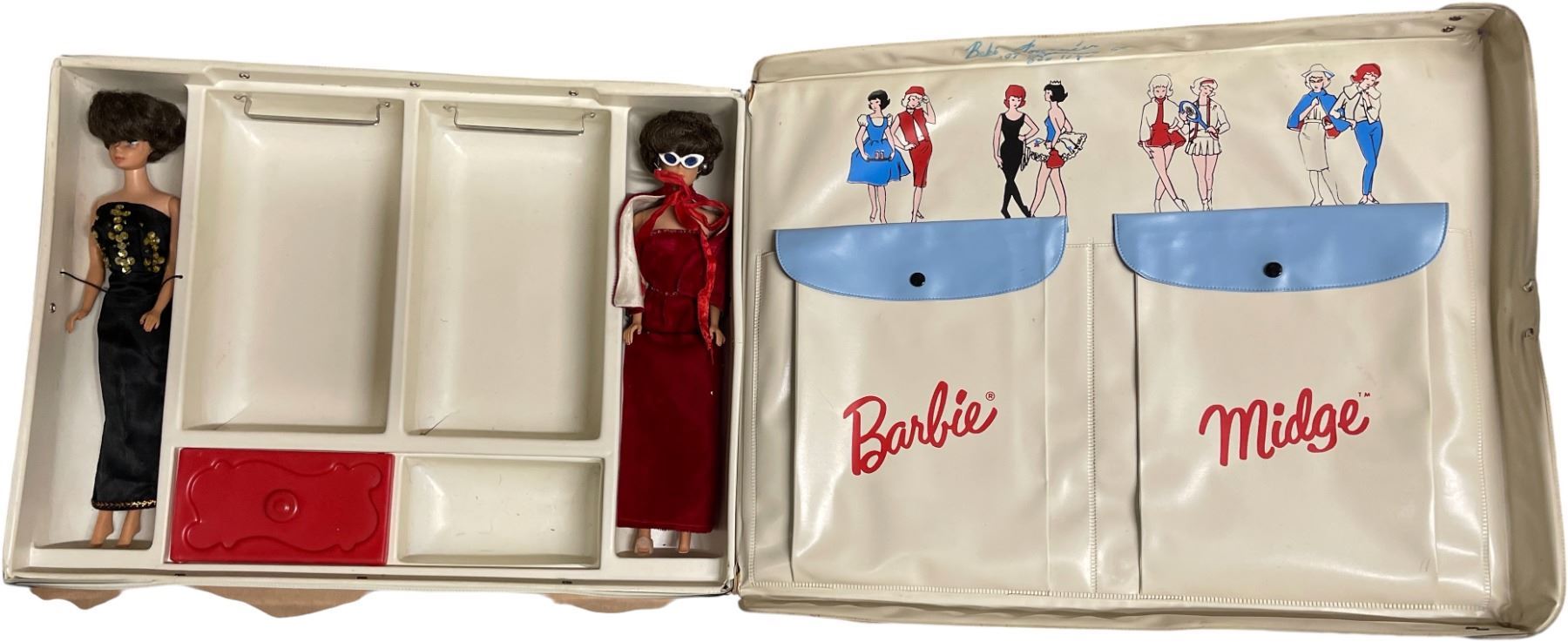 2-pcs 1960s Straight Leg Bubble Cut Barbies, 4-pcs Extra Dolls & Midge Doll Case (Front cover has a tear)