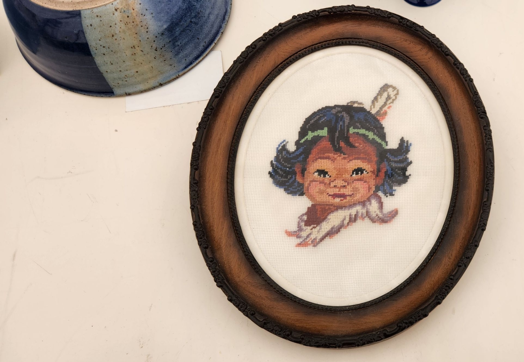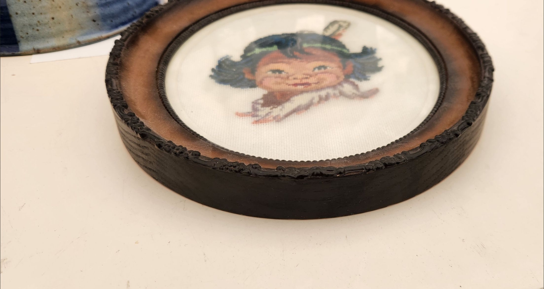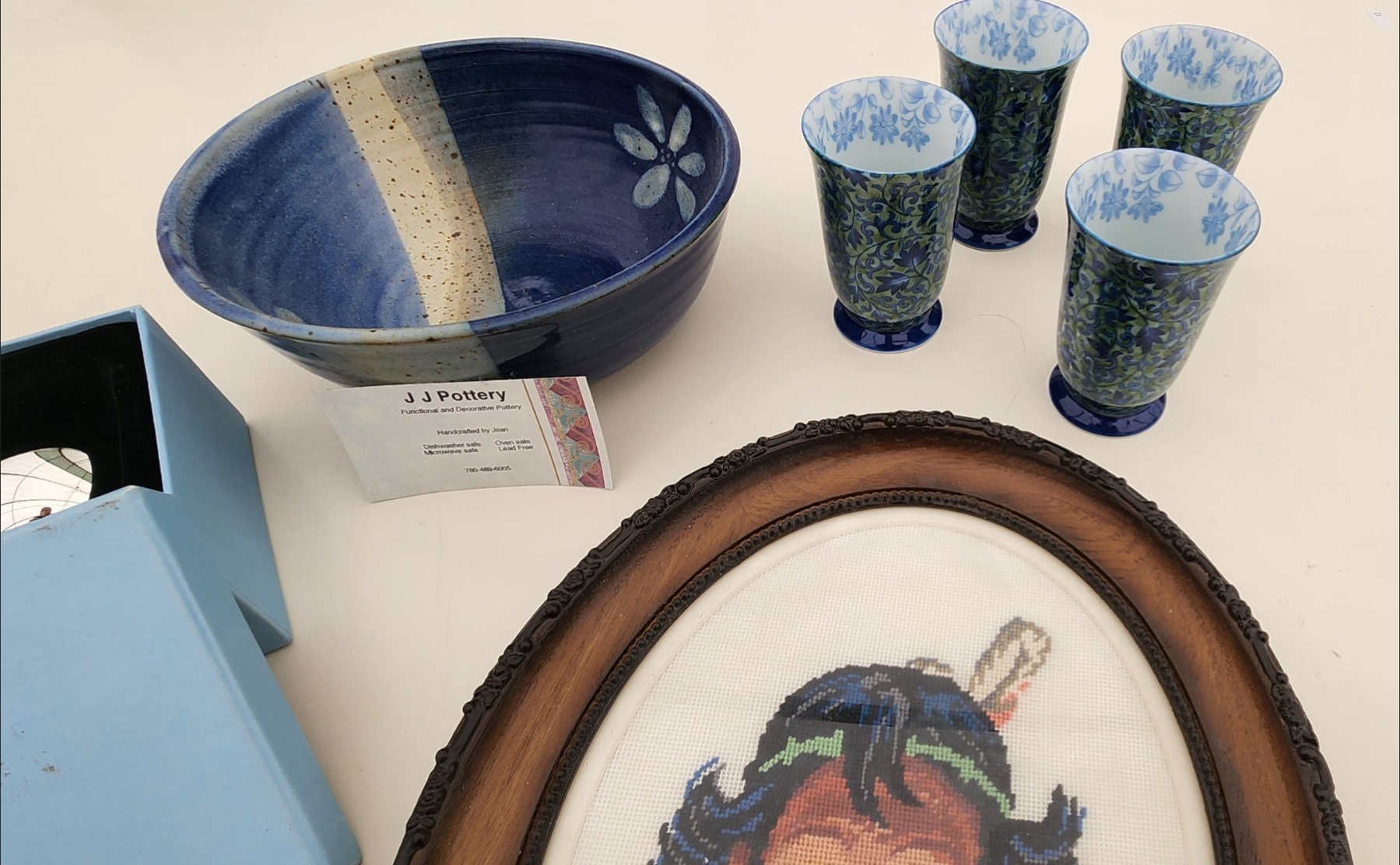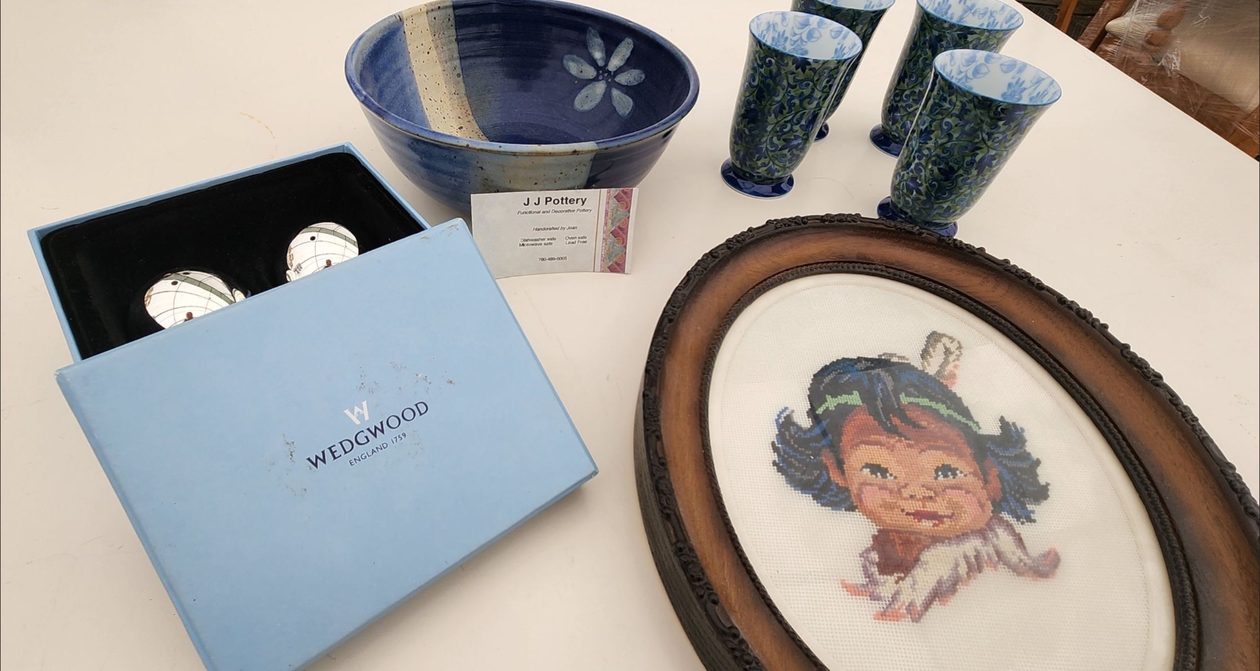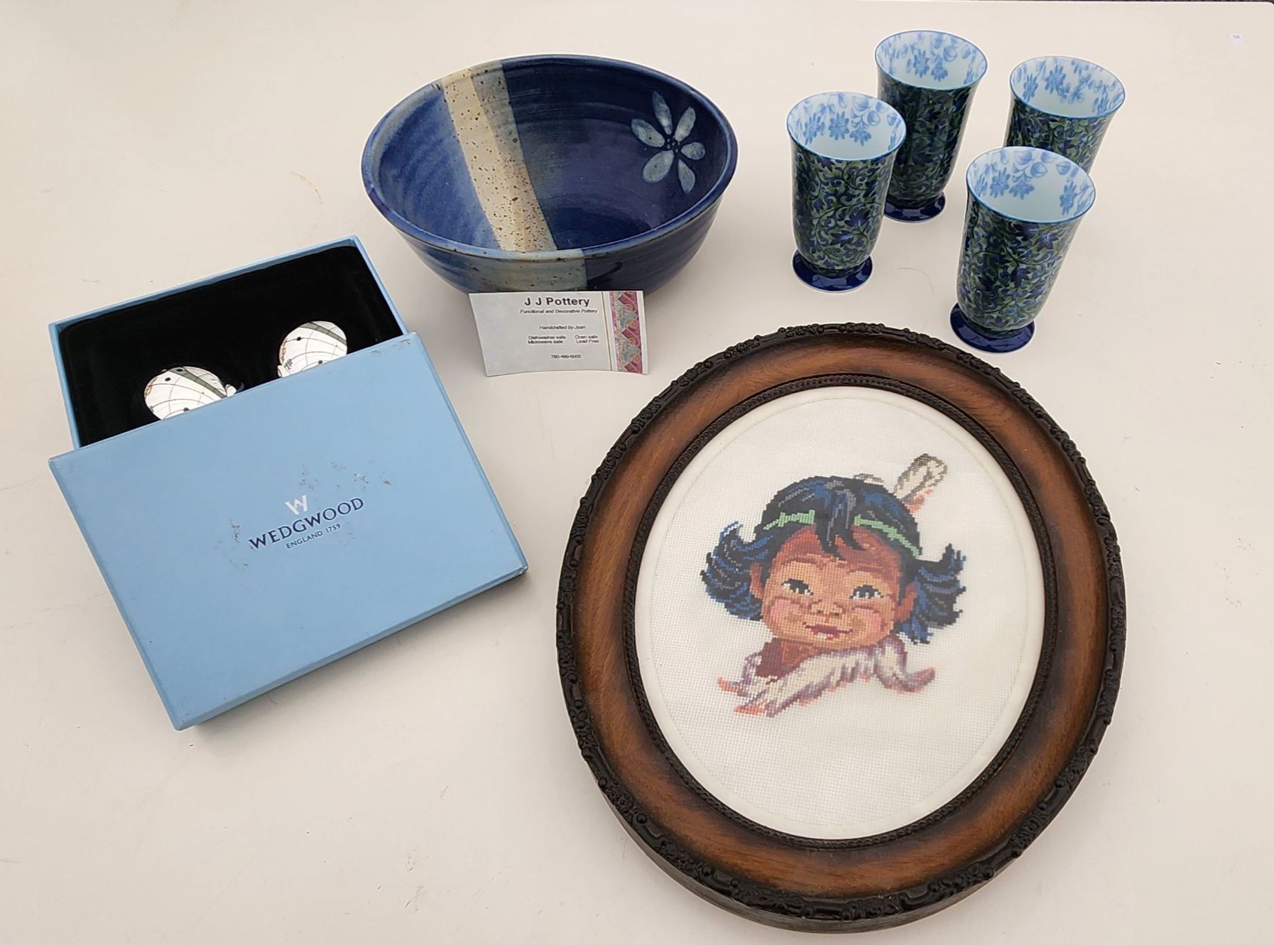 This curated lot features vintage cross-stitch art, a Wedgewood mirror, salt & pepper shakers, a pottery bowl, and tea cups. Perfect for collectors or decorators, each piece adds charm, elegance, and character to your home.