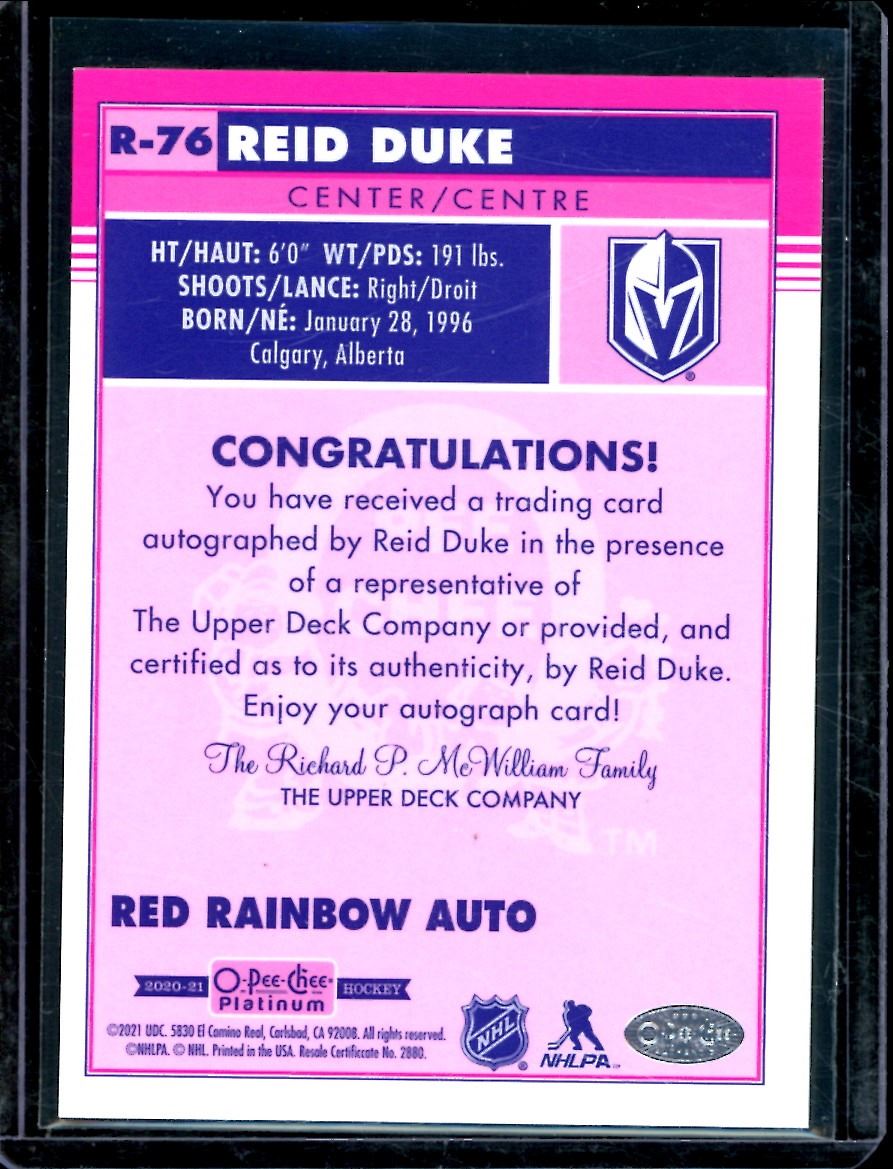 Lot 405 2020-21 O-Pee-Chee Platinum Retro Rainbow Red Autographs #R76 Reid Duke BV $40