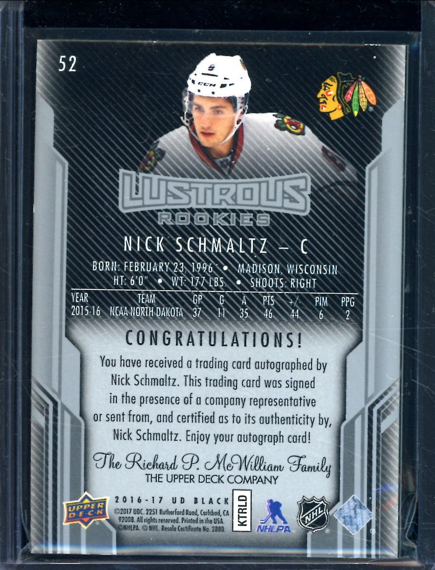 Lot 407 2016-17 UD Black #52 Nick Schmaltz Autographed 54/299 RC BV $50