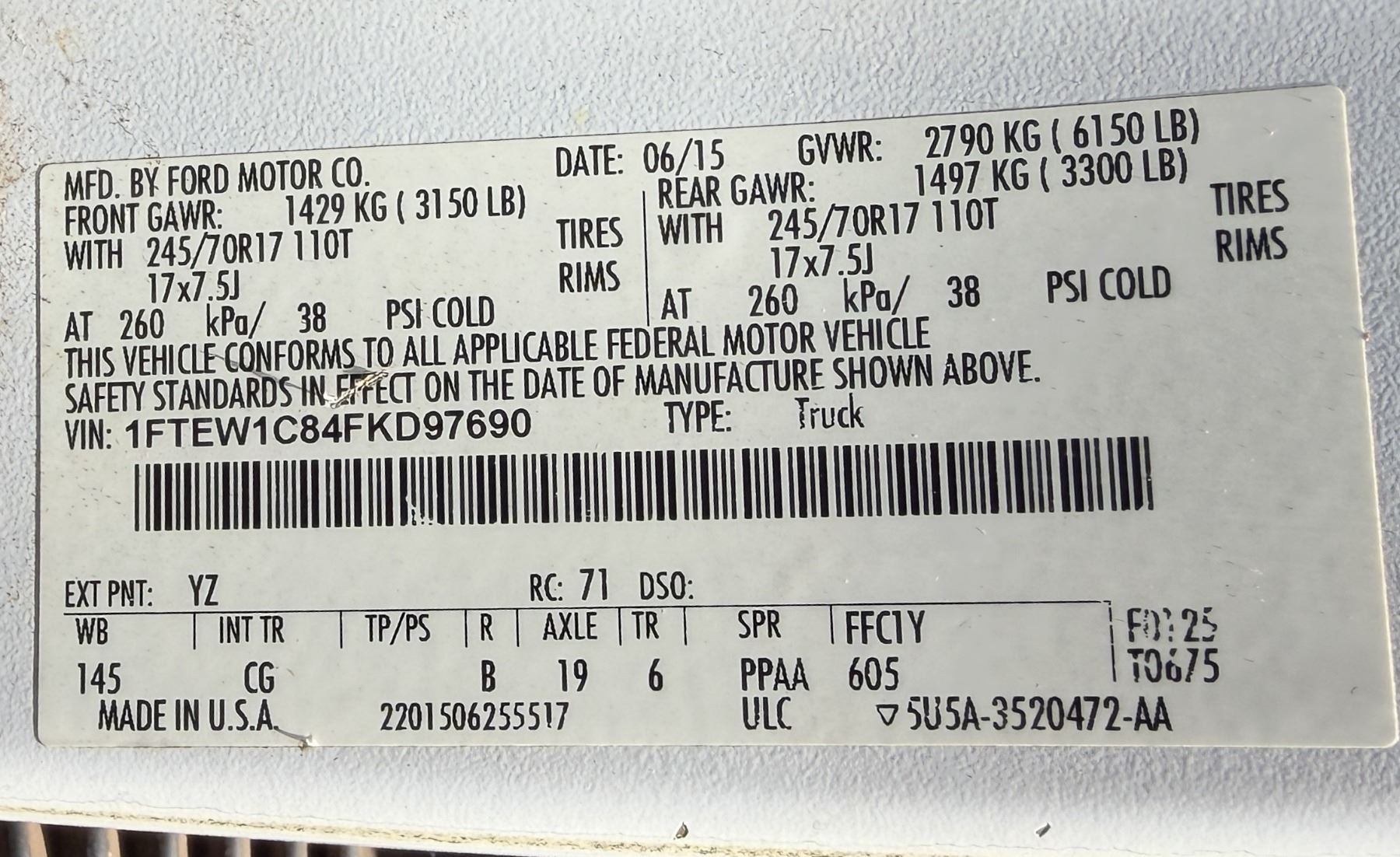 Lot 15 (867273) 2015 Ford F150 XL Pickup Truck, 100,453 Miles, Lic. 585TVS (Starts & Runs - See Video)
