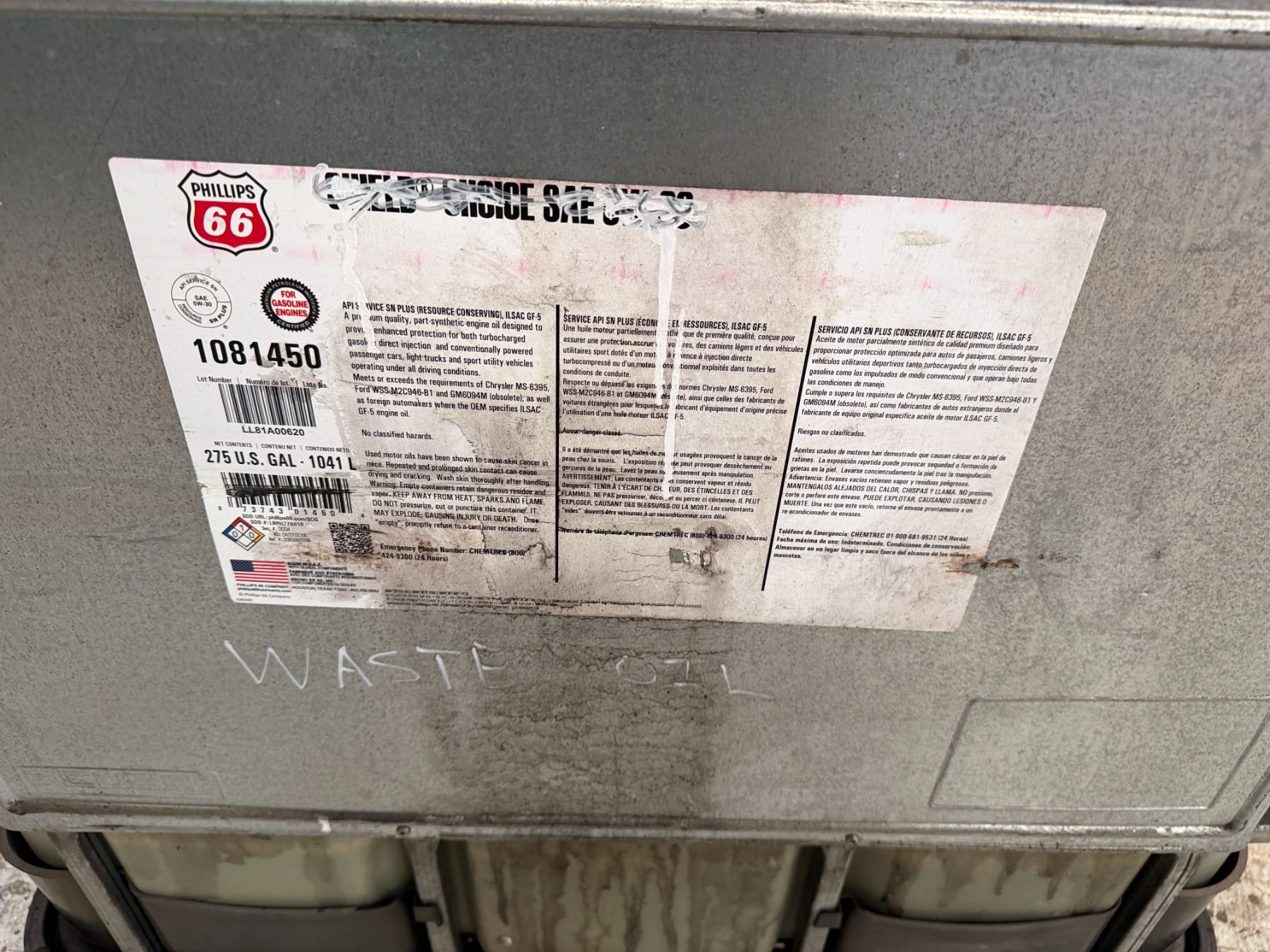 275-Gallon Intermediate Bulk Container (IBC) Tote. Used For Oil Waste