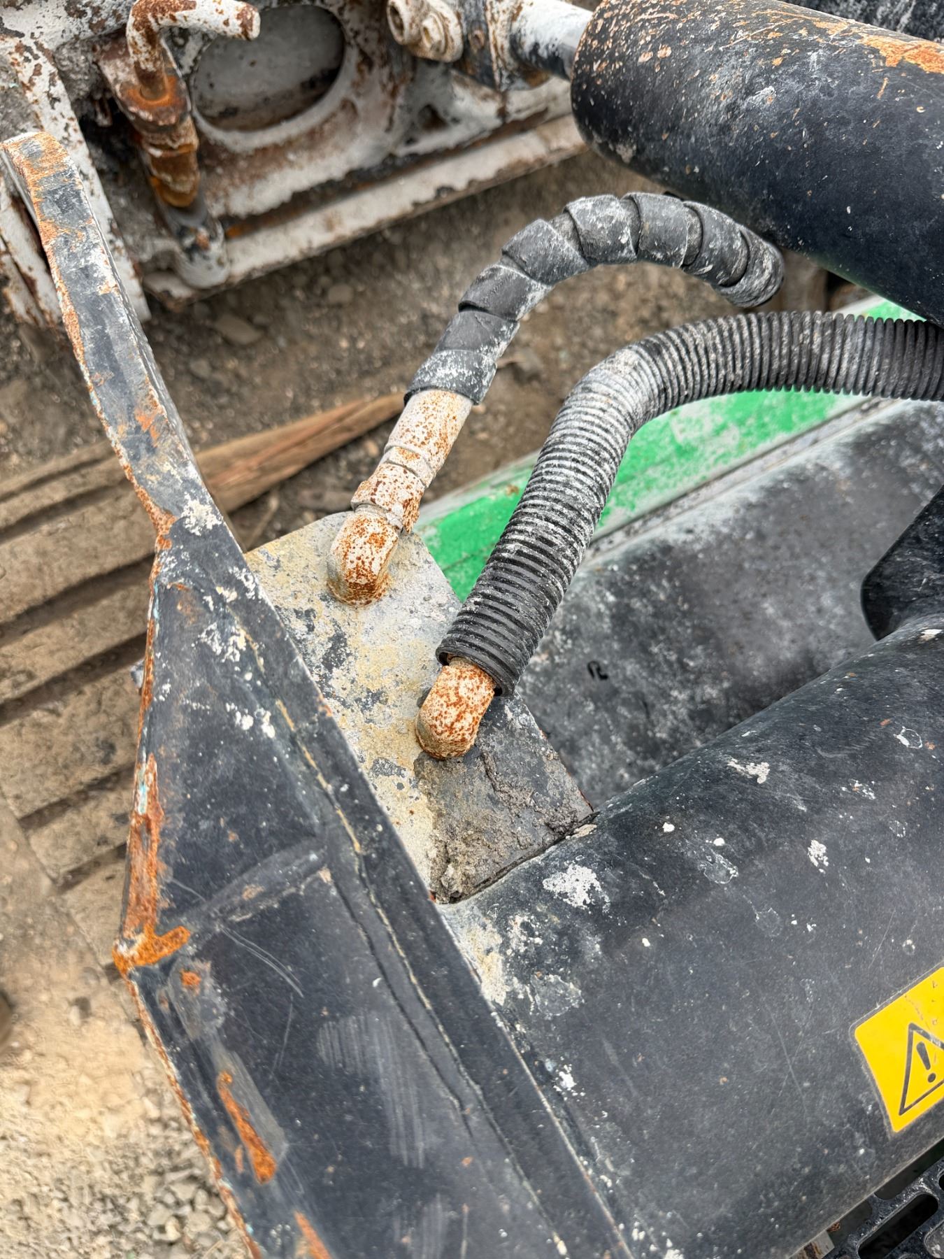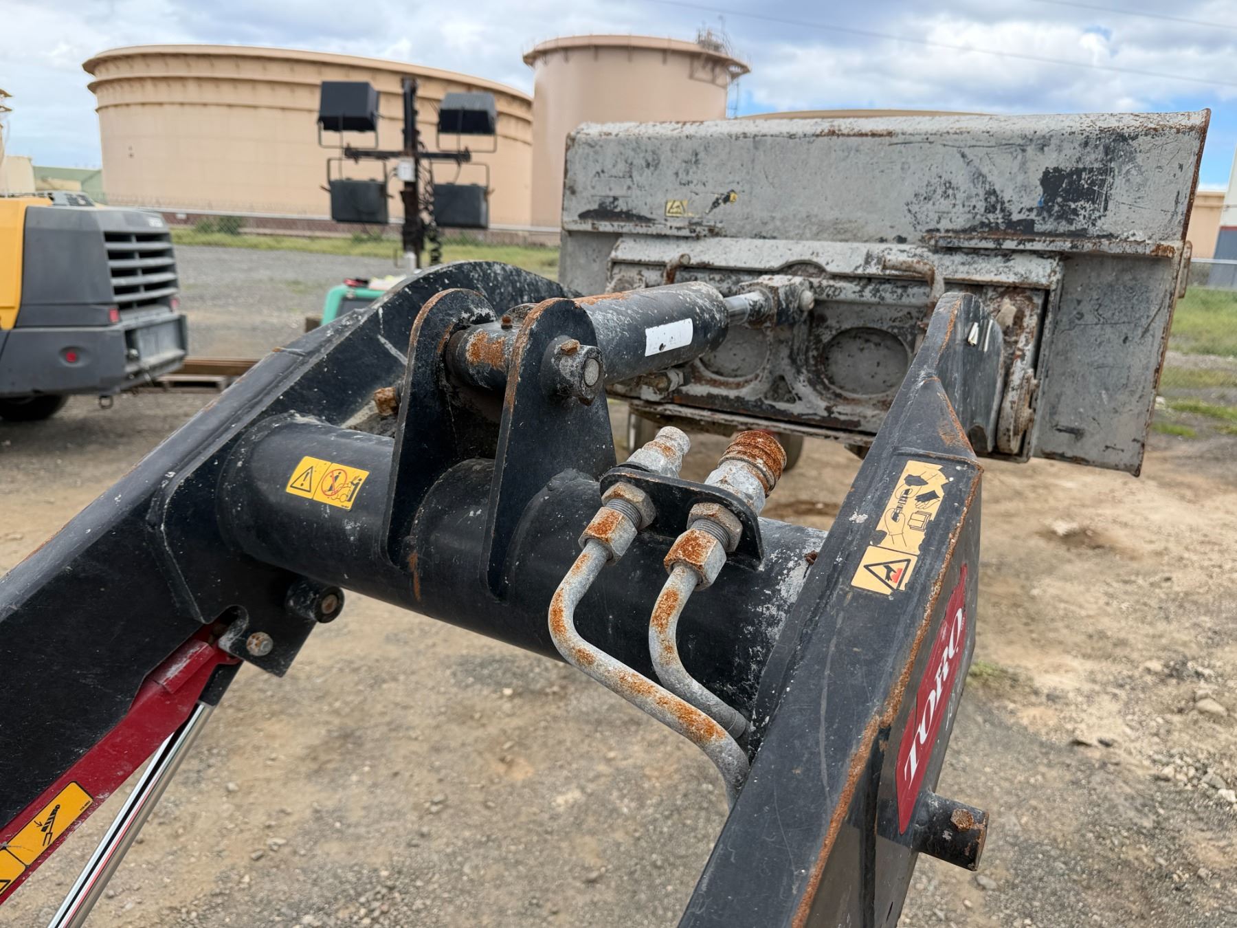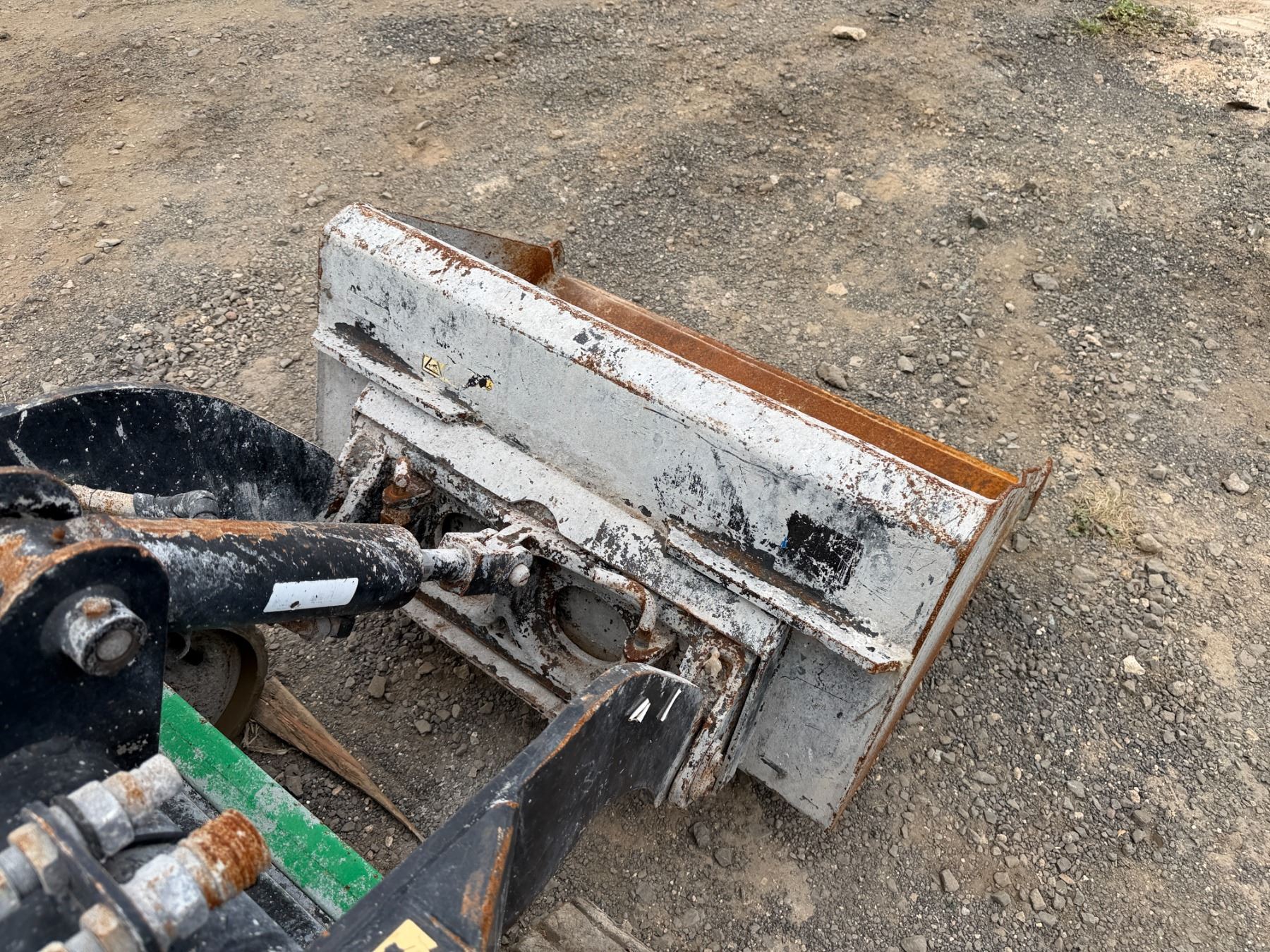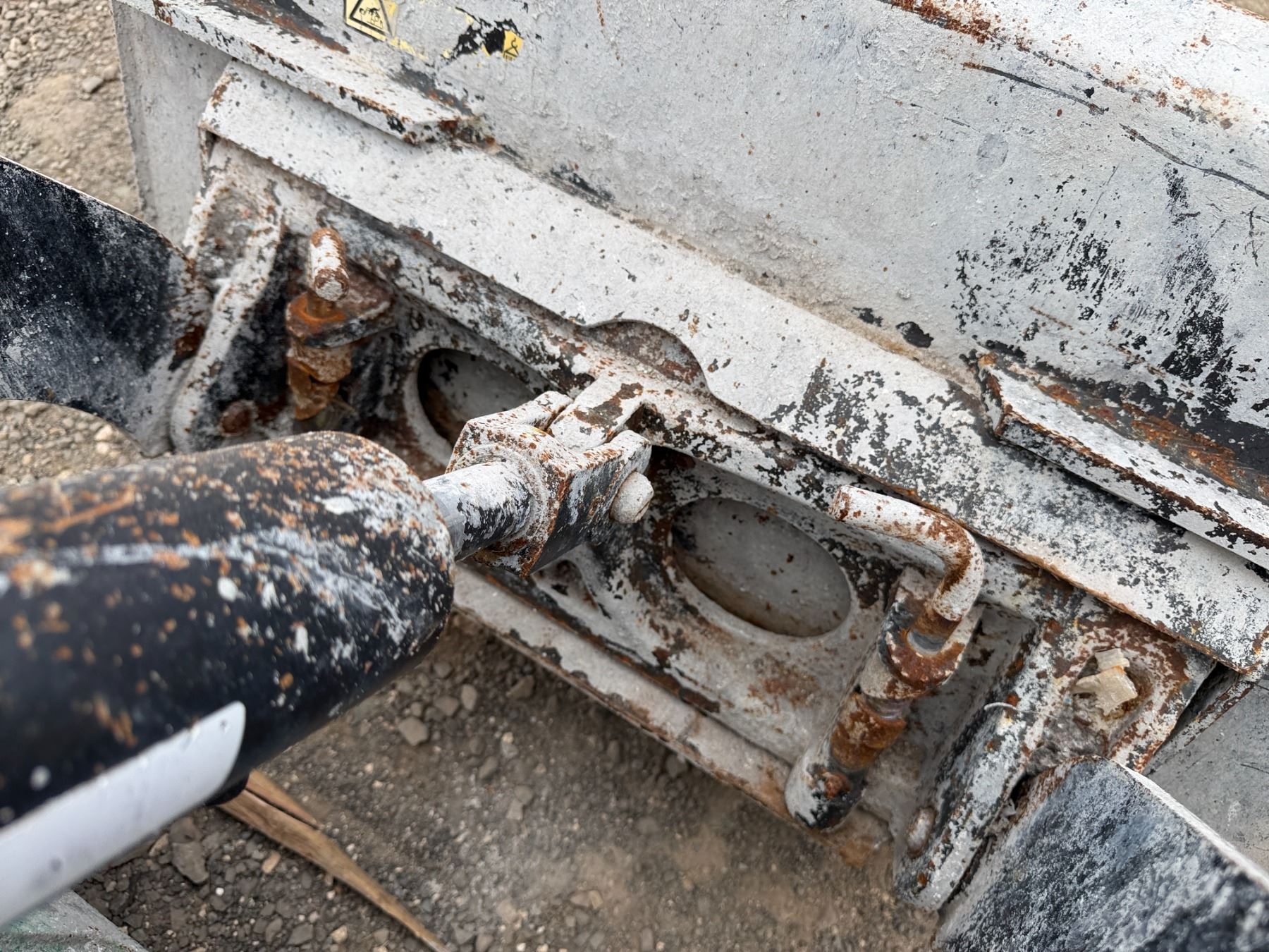 THE RETAINING PINS SECURING THE BUCKET ARE SEIZED and require lubrication to free them. This condition must be addressed to ensure the bucket remains properly attached and does not detach during operation.