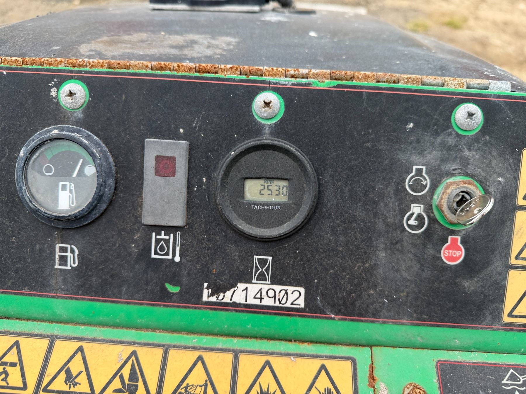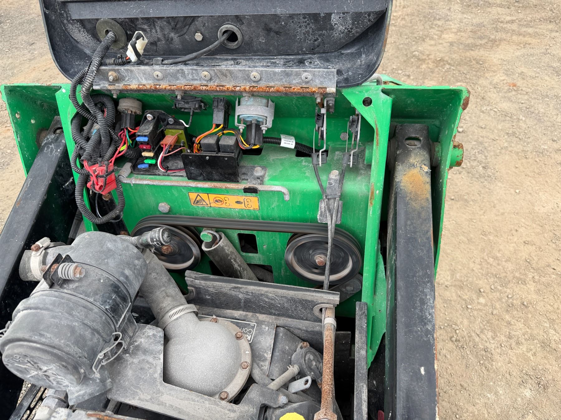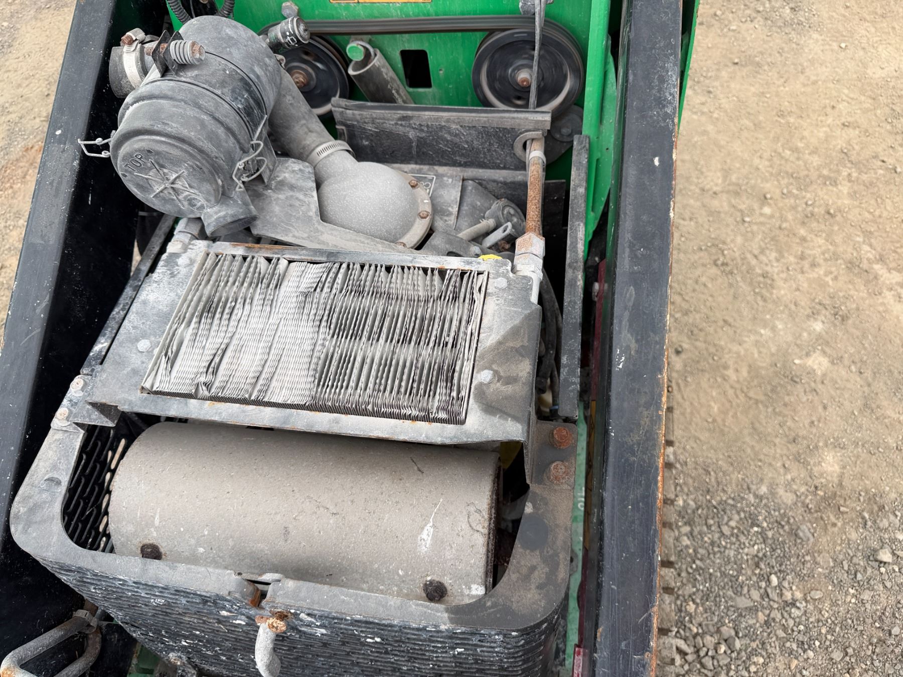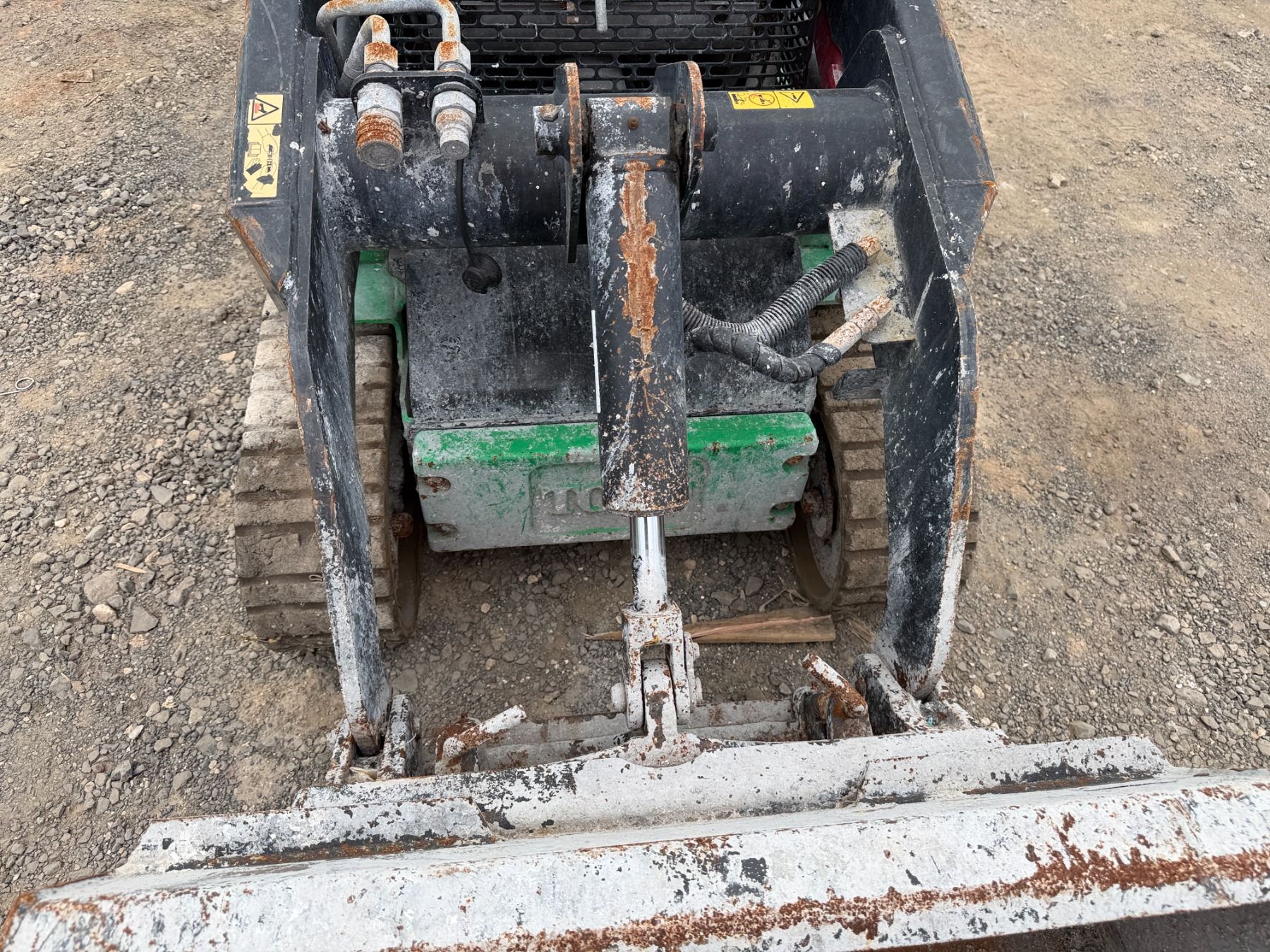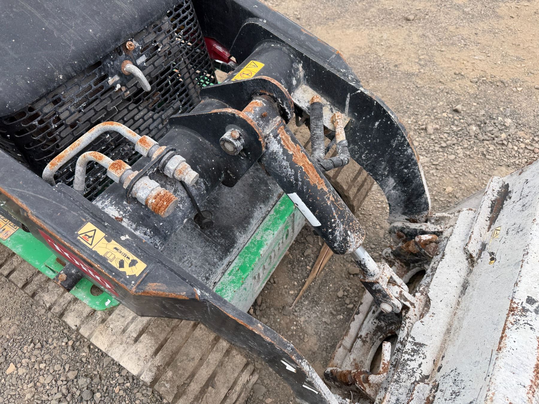 THE RETAINING PINS SECURING THE BUCKET ARE SEIZED and require lubrication to free them. This condition must be addressed to ensure the bucket remains properly attached and does not detach during operation.