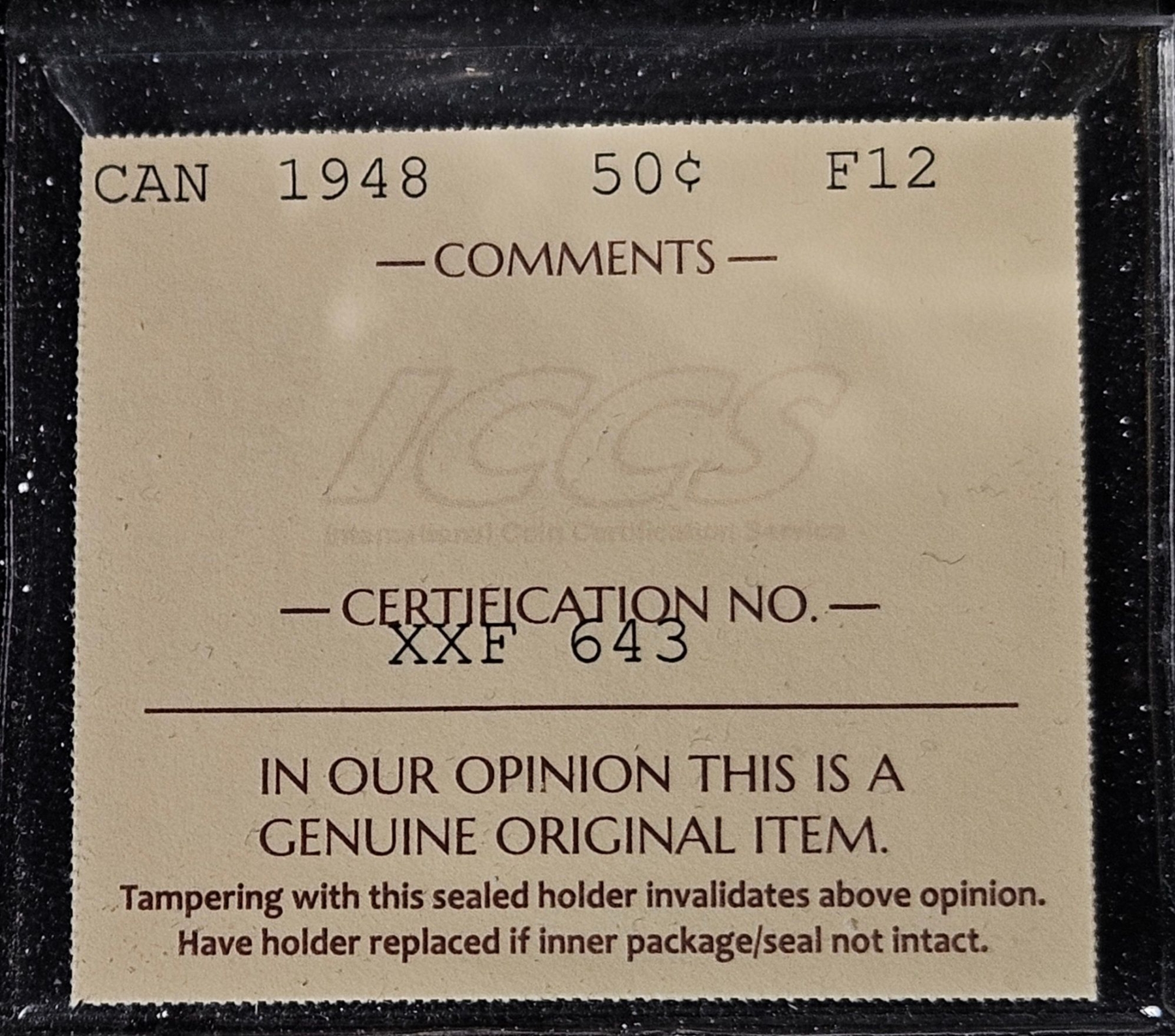 Lot 57 1948 Canadian 50¢ F12 Half Dollar Coin with Protective Plastic Case and Certification