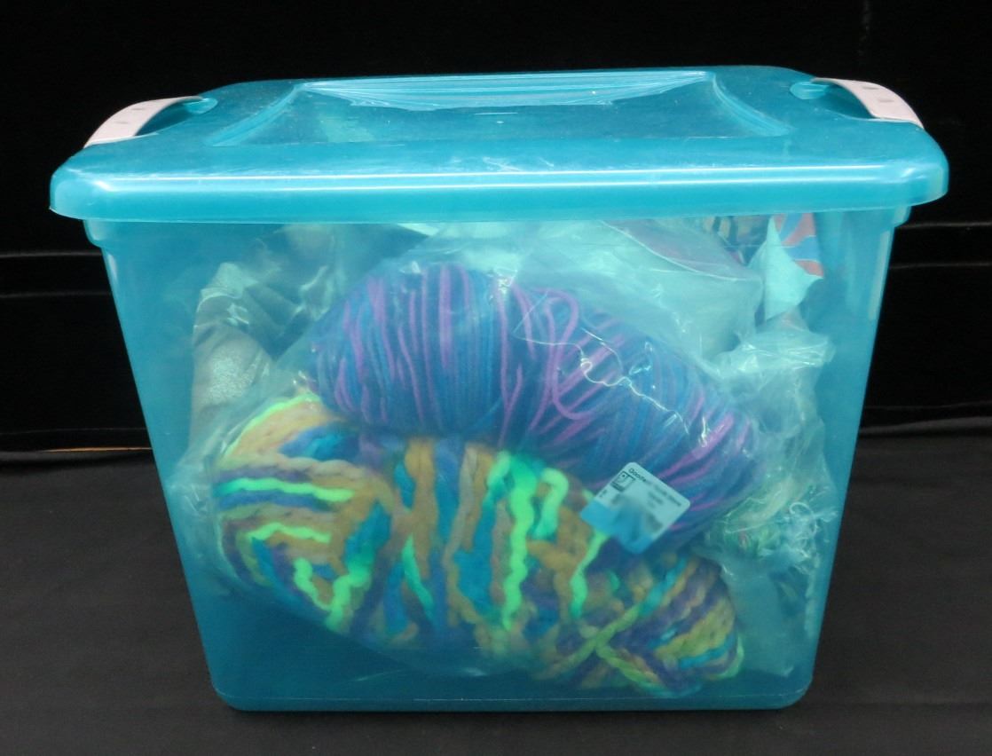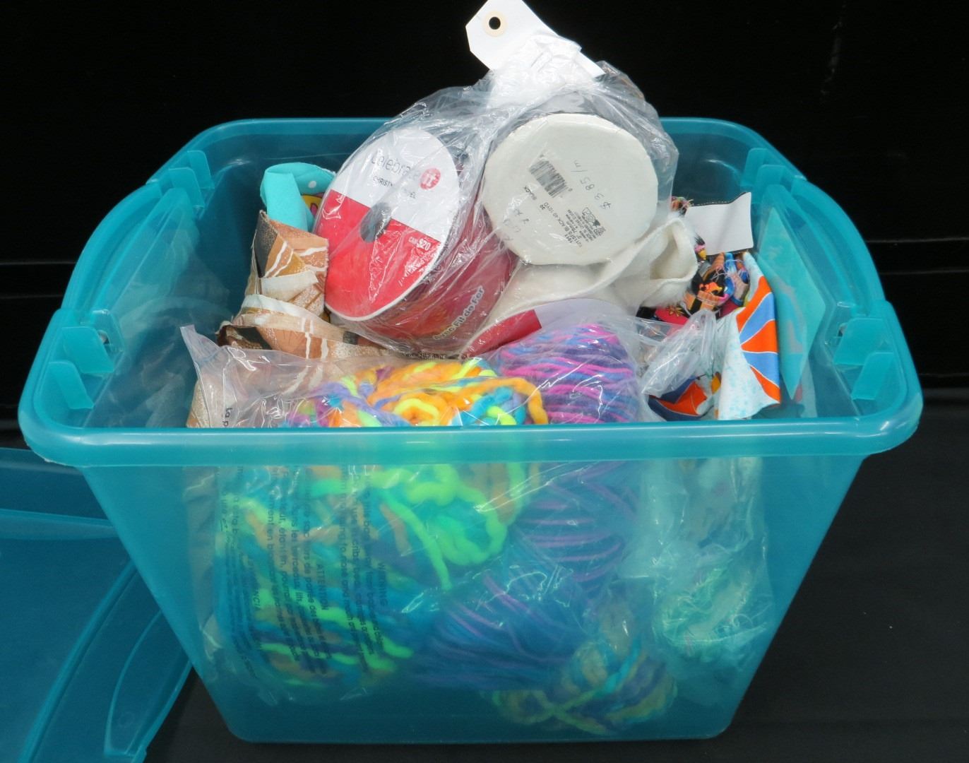 Lot 13 12" x12" Sterlite Tote Full Of Fabric, Wool and Crafting Threads