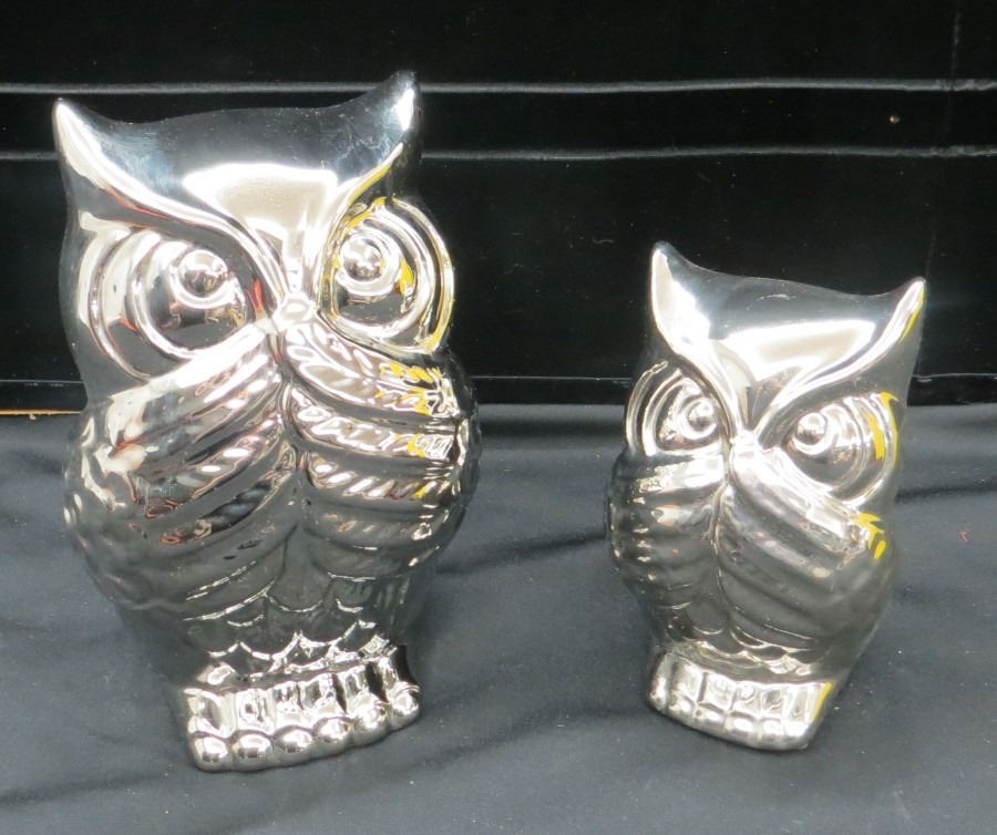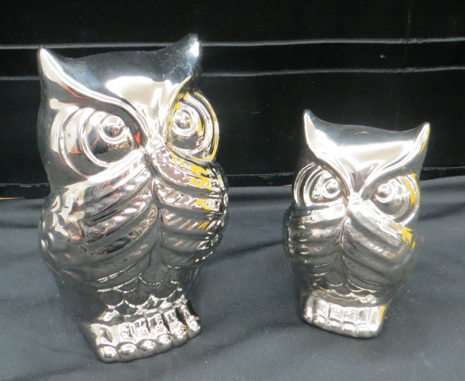 Lot 15 2 Decorative Silver Ceramic Owls 7" & 9" Tall