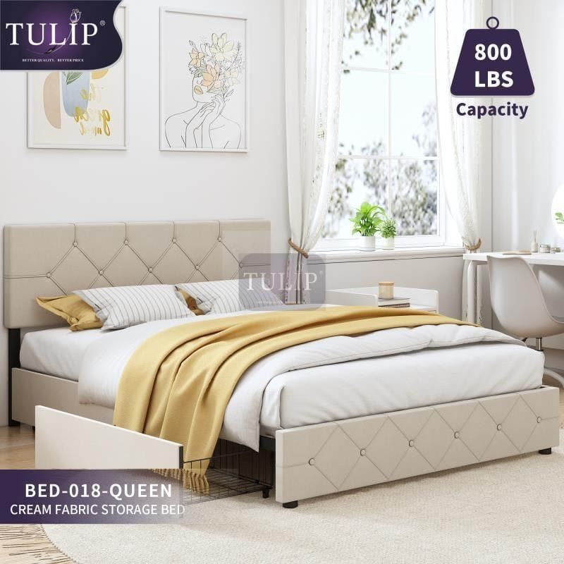 Brand new Tulip Bed frames- New in Box (Cream Fabric) Size- 018 Queen Storage bed Retail Price- $500