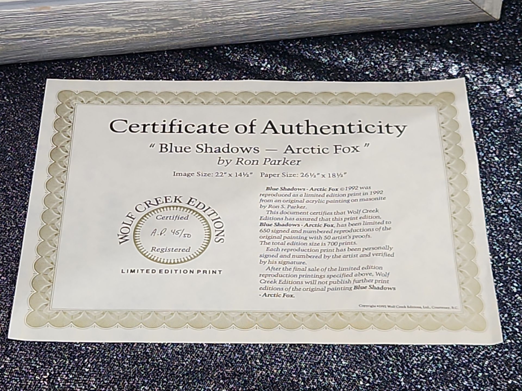 Lot 38 Limited Edition "Blue Shadows , Arctic Fox" Framed Print By Artist Ron Parker.