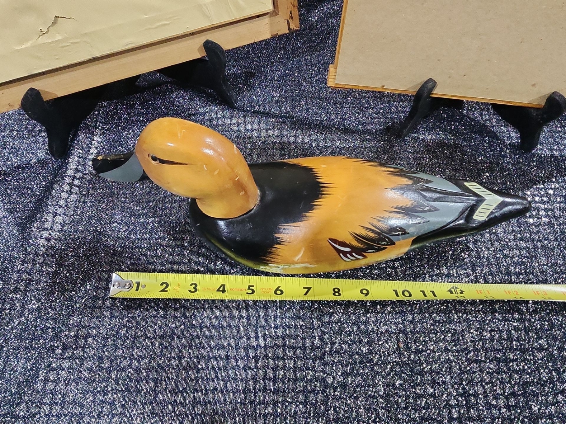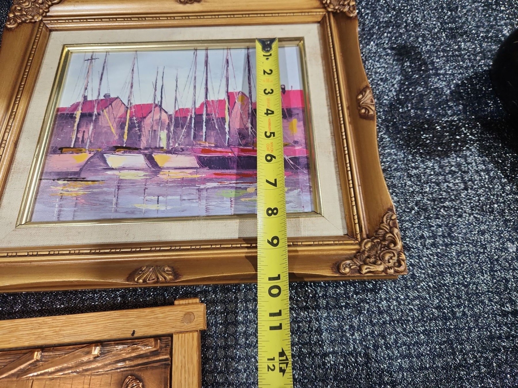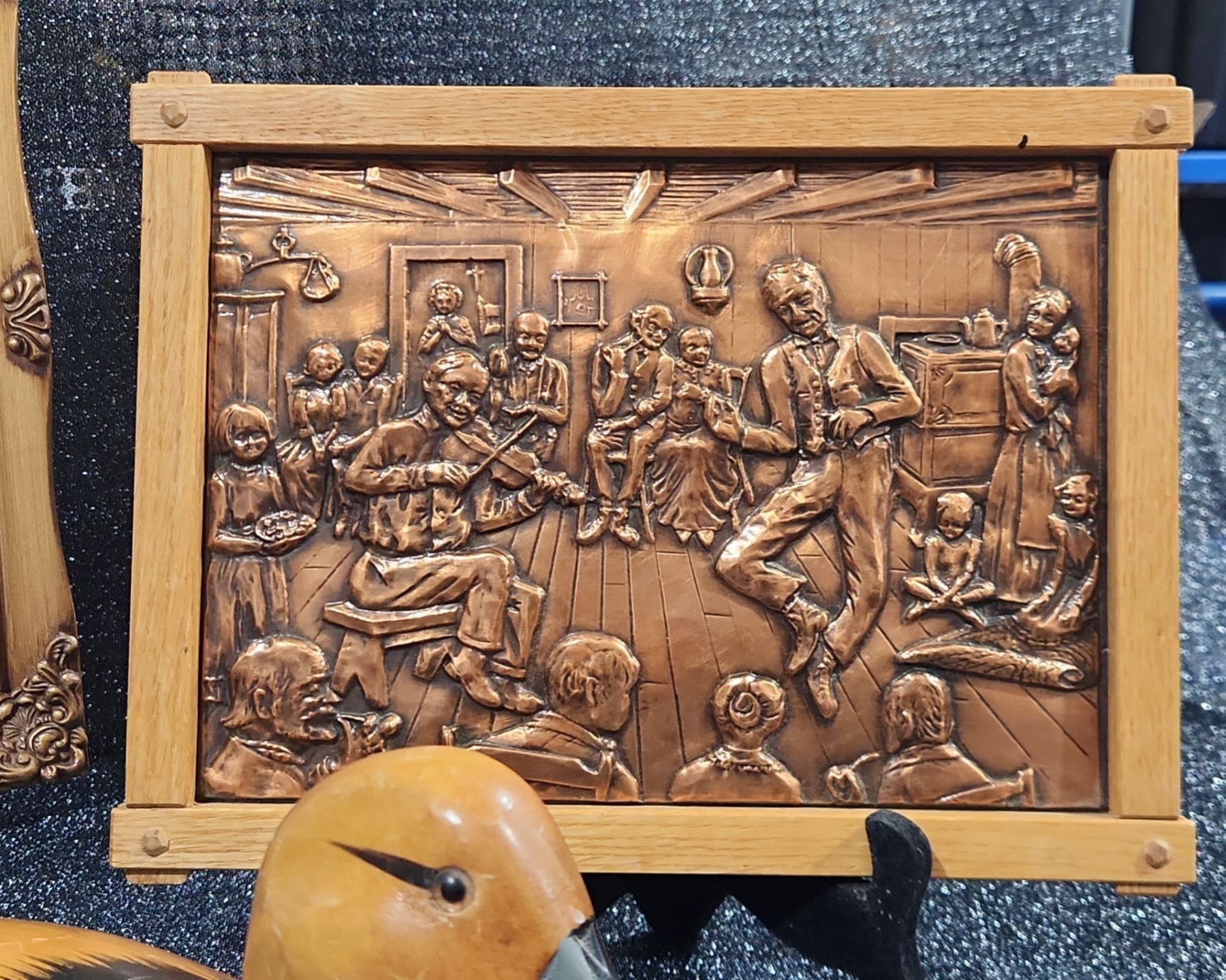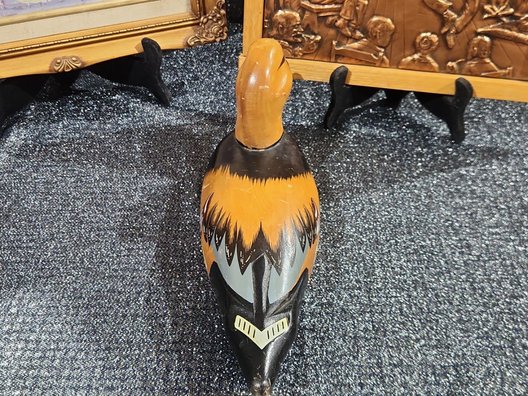 hand-carved and hand-painted solid wood duck figurine , oil painting ships at a dock, framed in a gold-colored frame. copper plaque Featuring of a traditional "kitchen party".