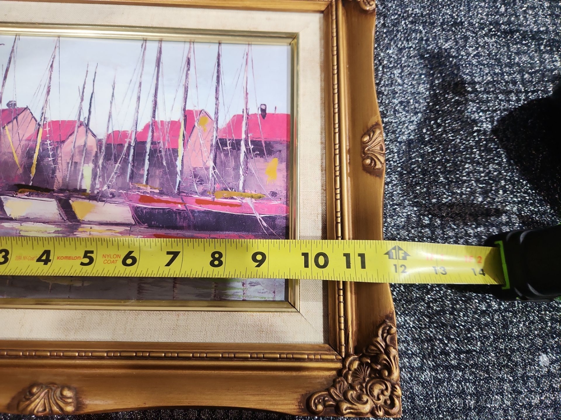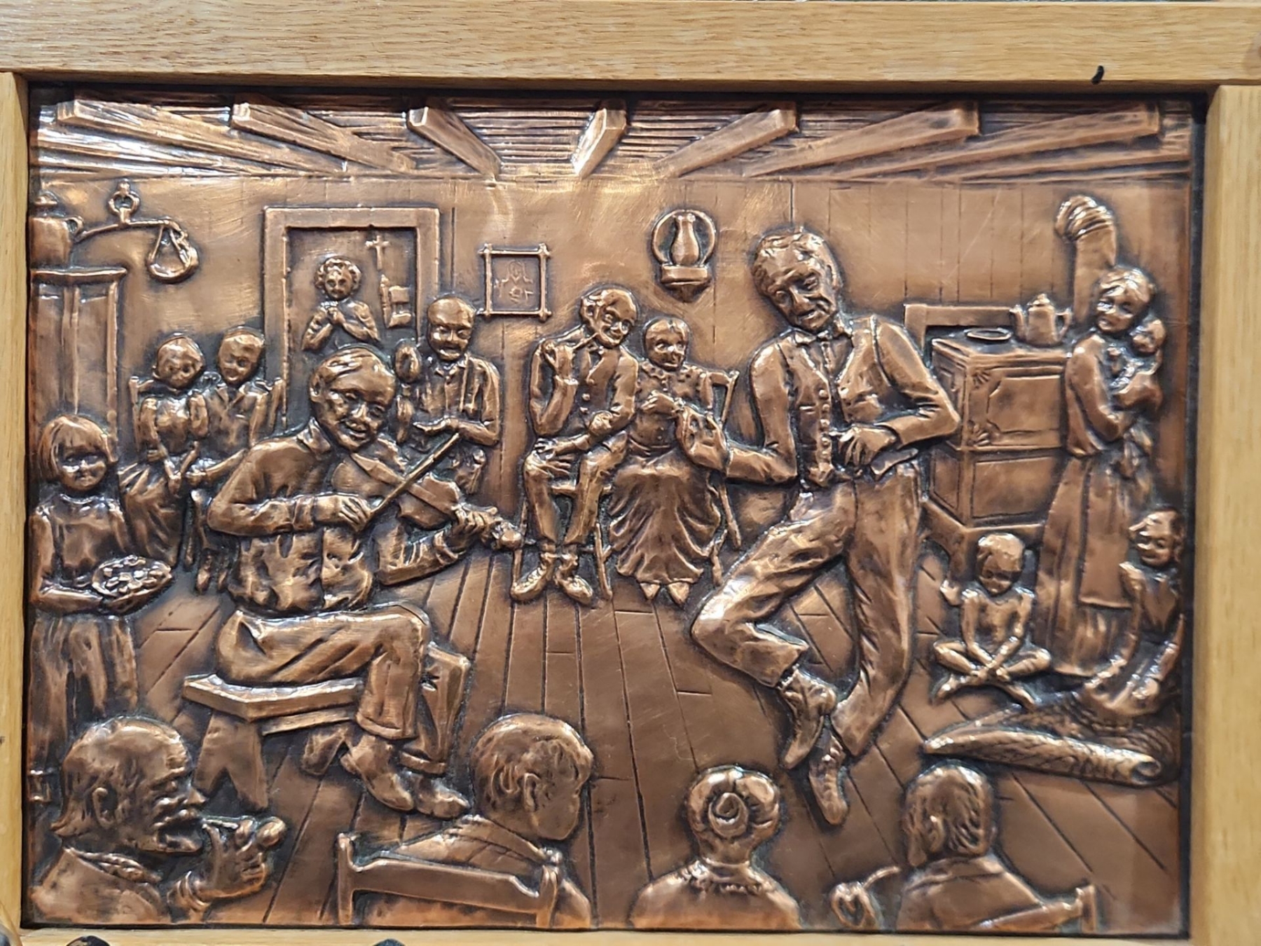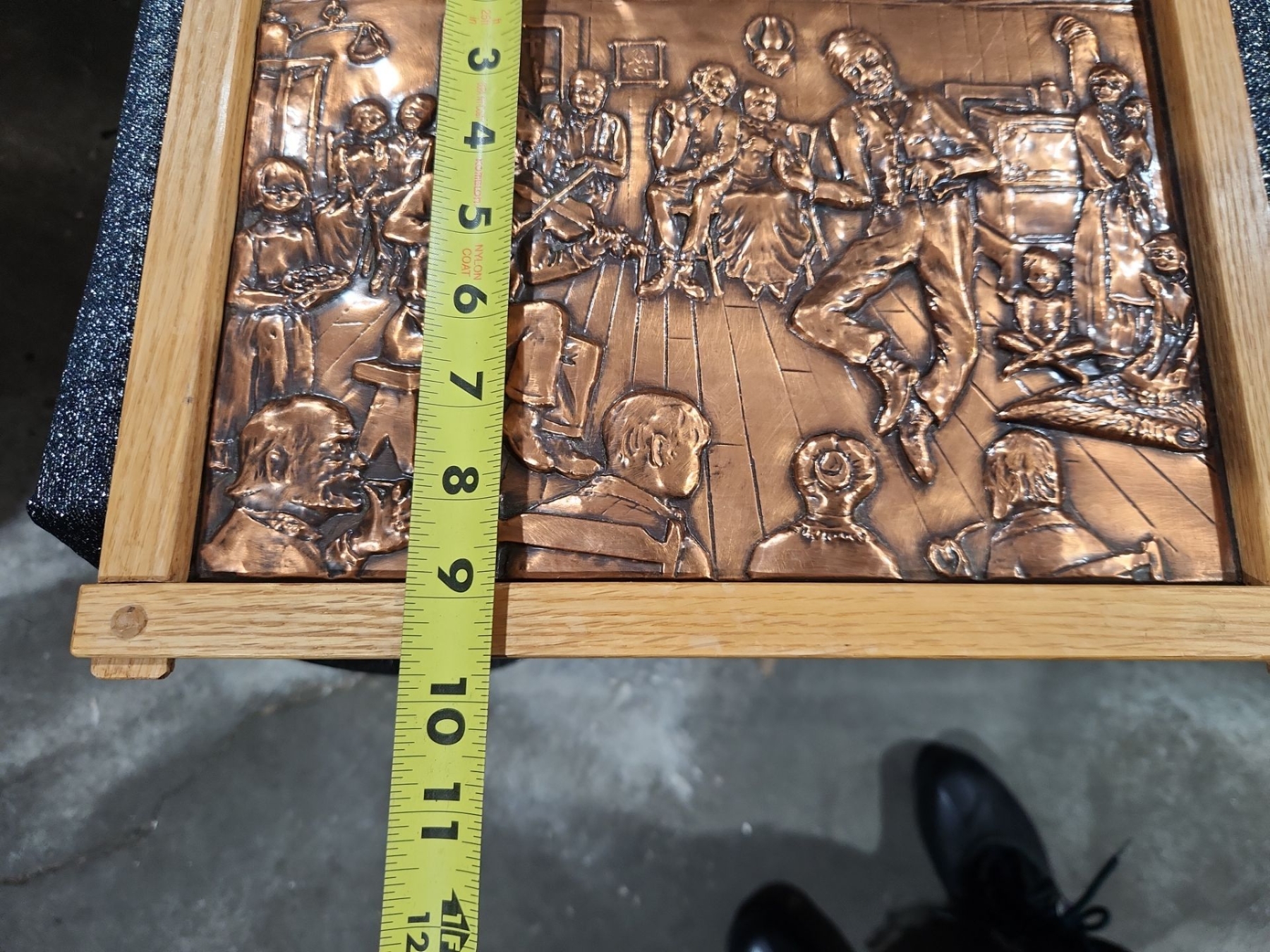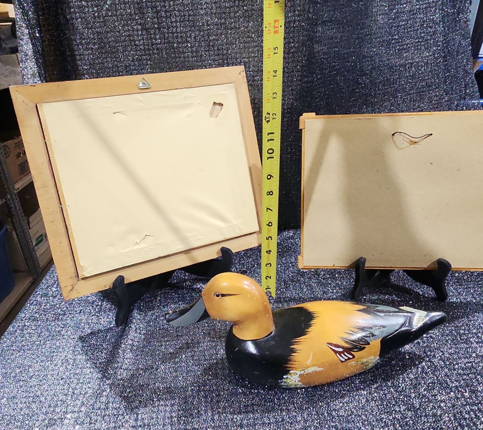 hand-carved and hand-painted solid wood duck figurine , oil painting ships at a dock, framed in a gold-colored frame. copper plaque Featuring of a traditional "kitchen party".