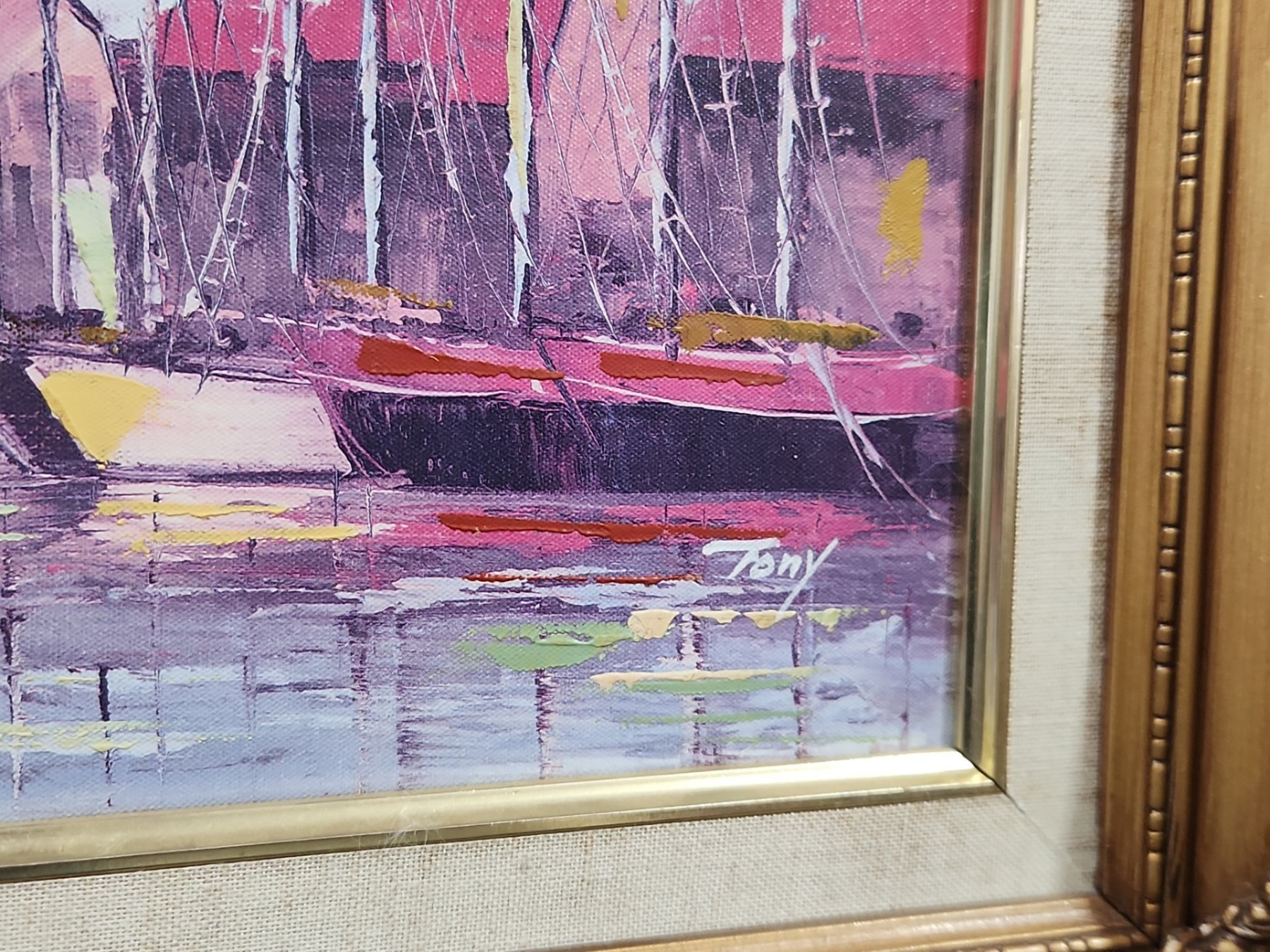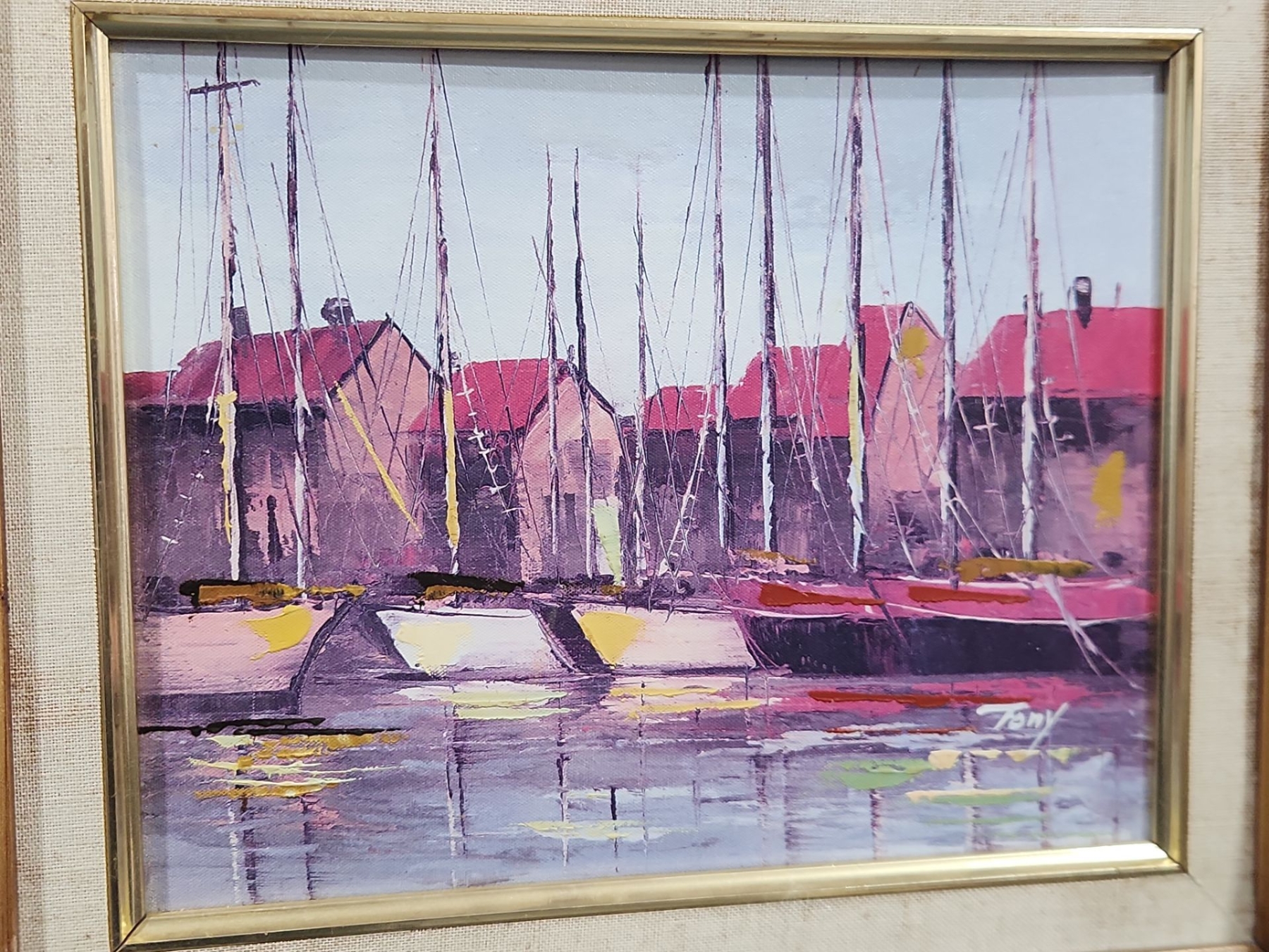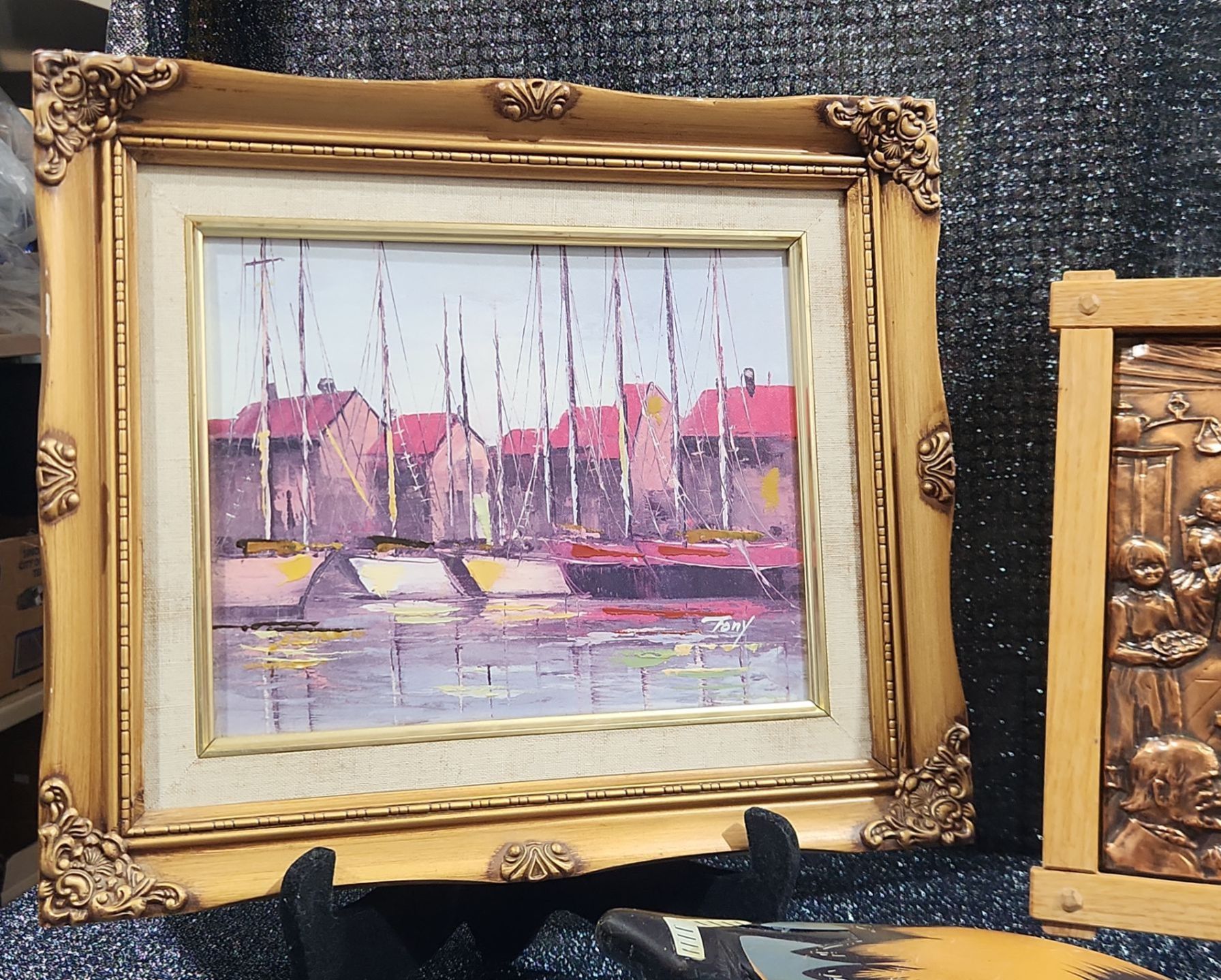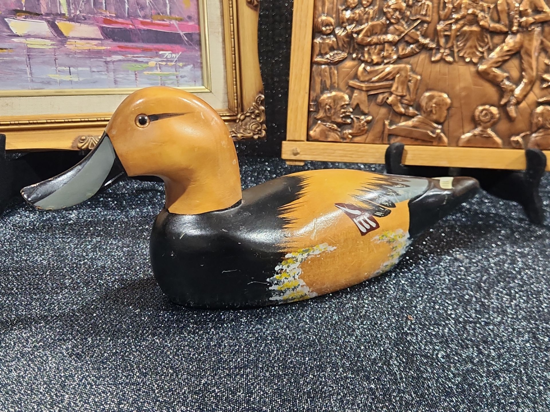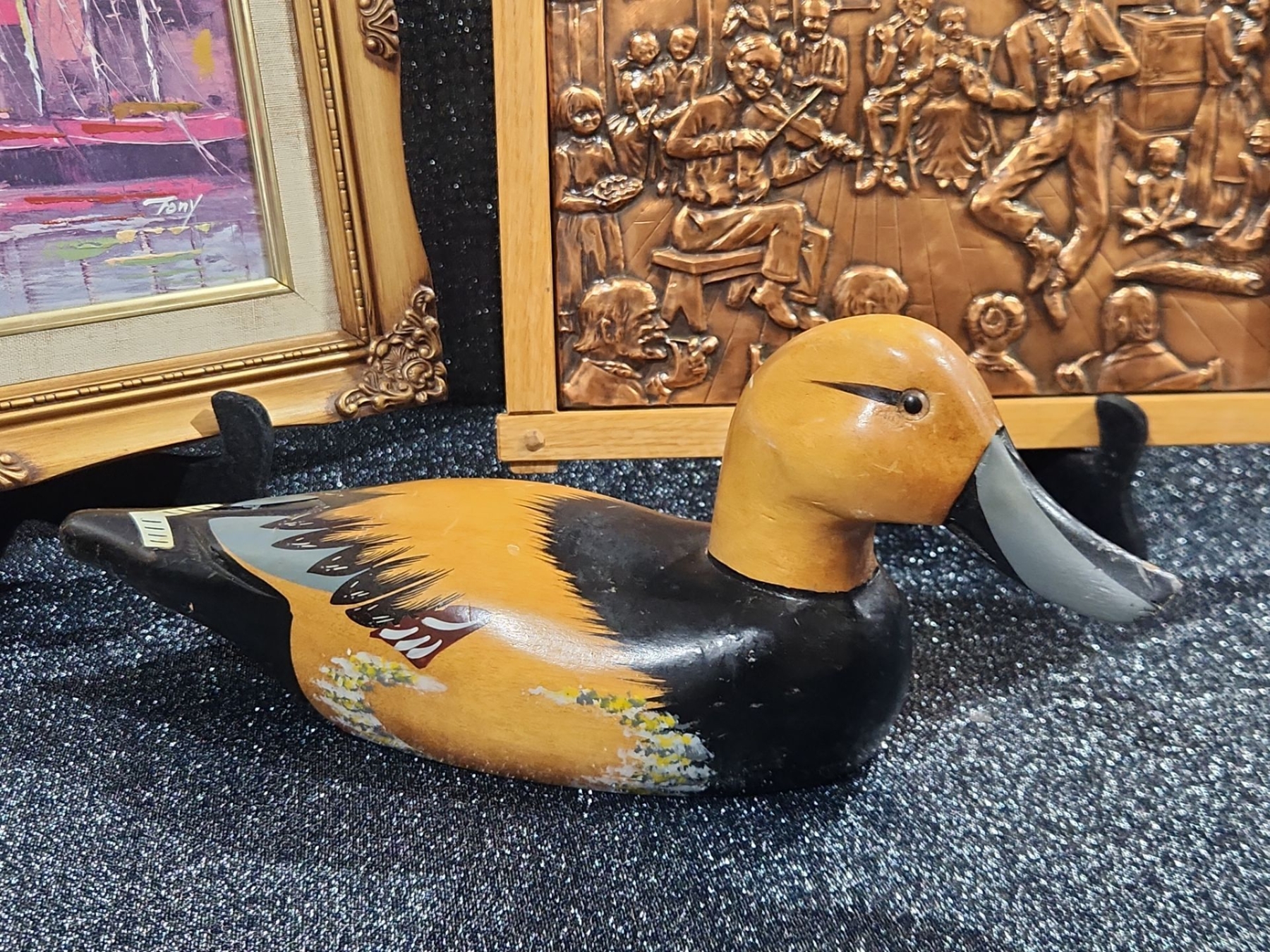Lot 39 Ships At A dock Oil Painting, Solid Wood Duck Figurine, Traditional Kitchen Party In Copper Plaque.
