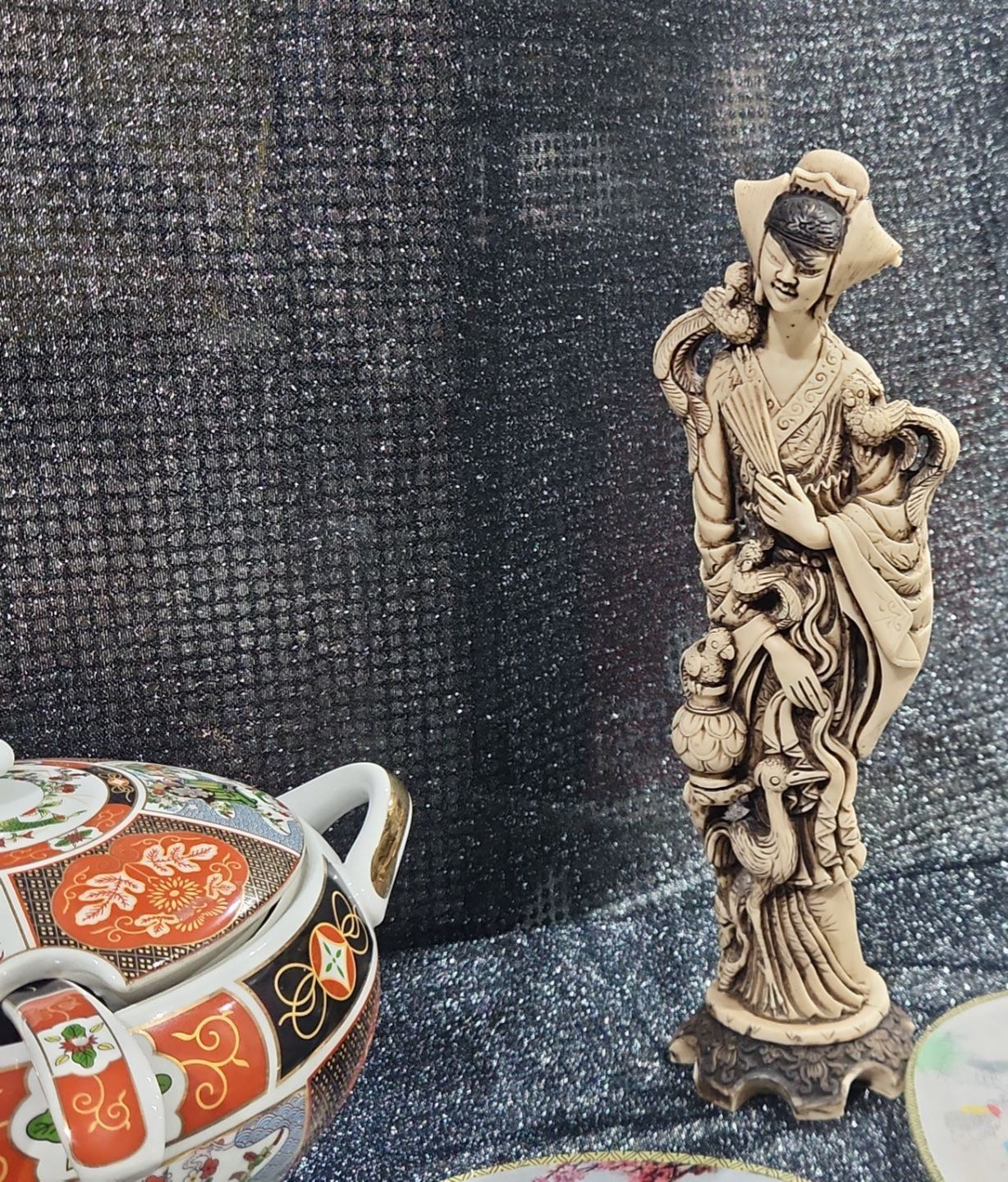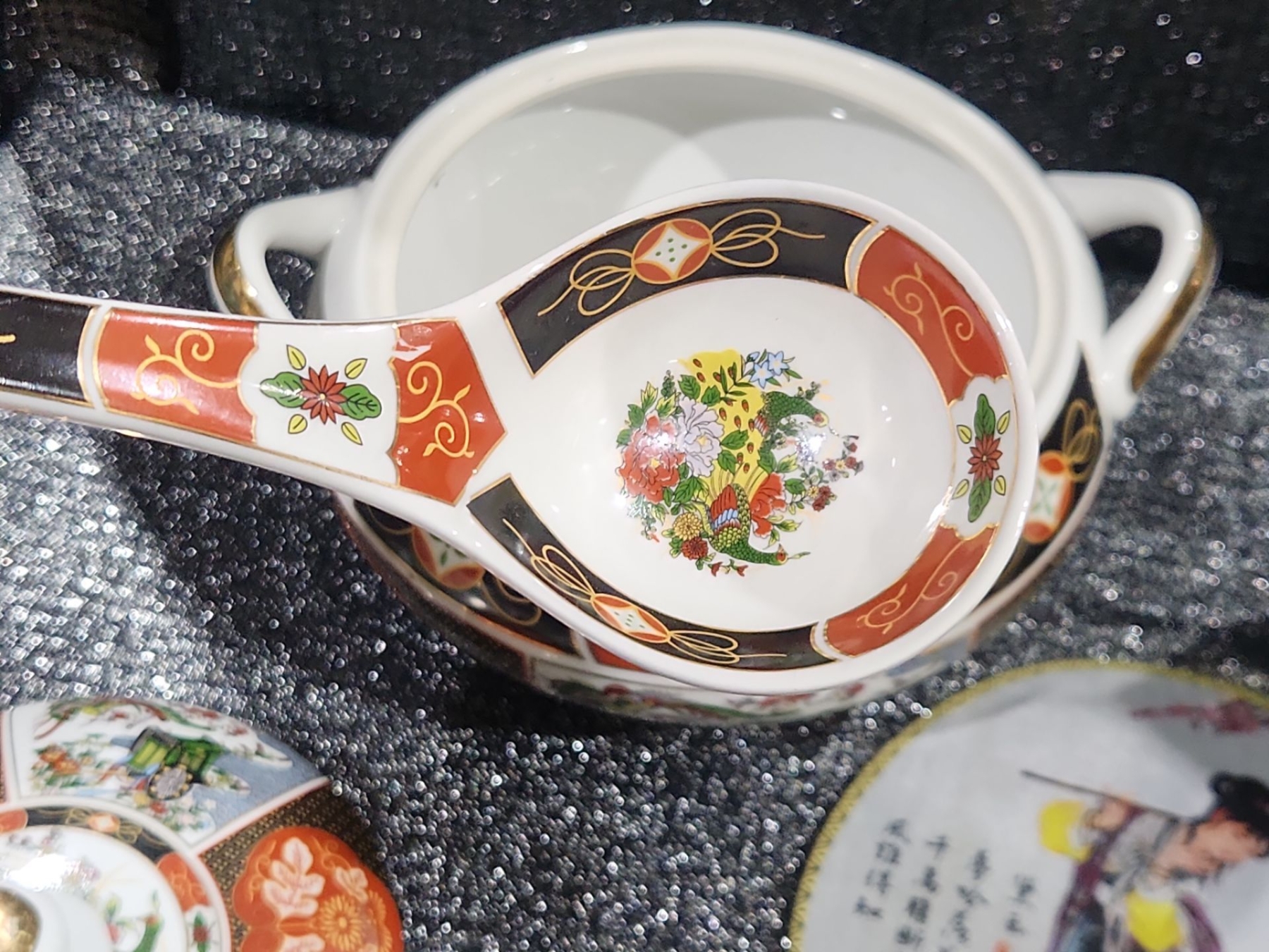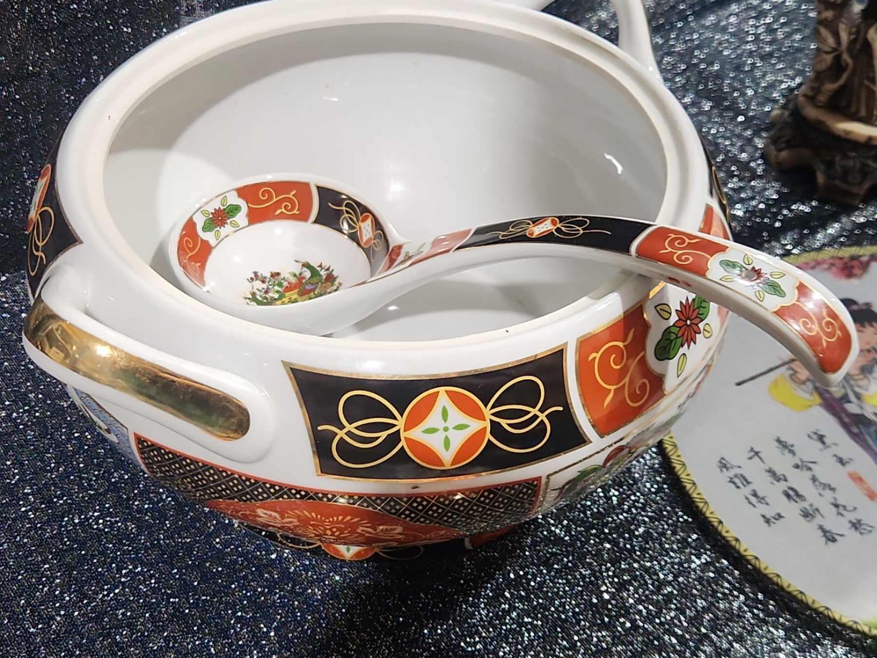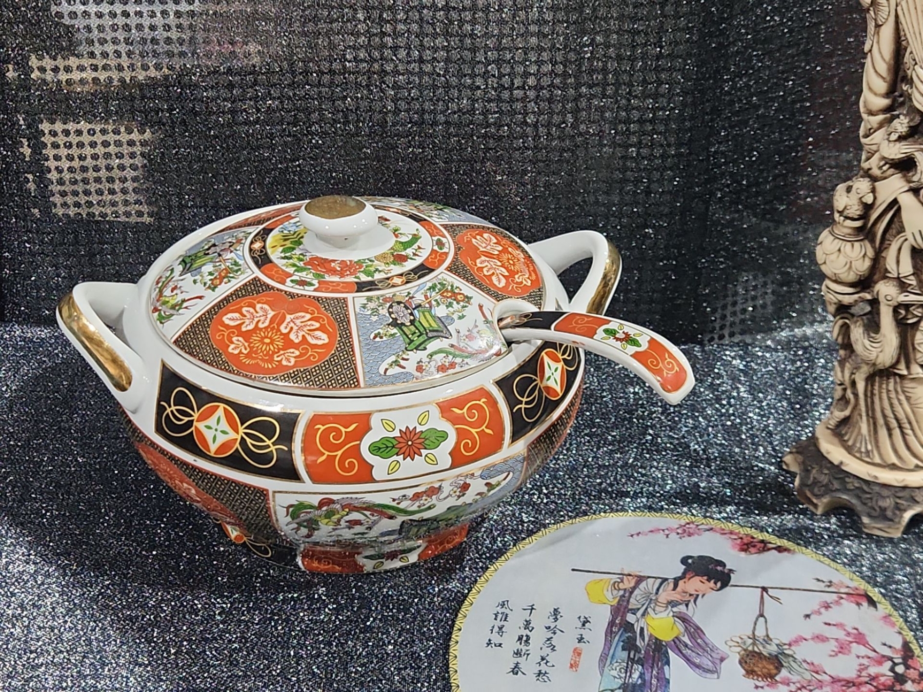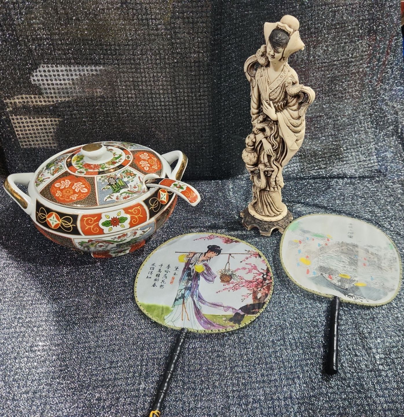 Japanese Porcelain Lidded Tureen & Ladle In The Imari Style, Two Round Chinese Ancient Hand Fan, Carved Resin Asian-style figurine