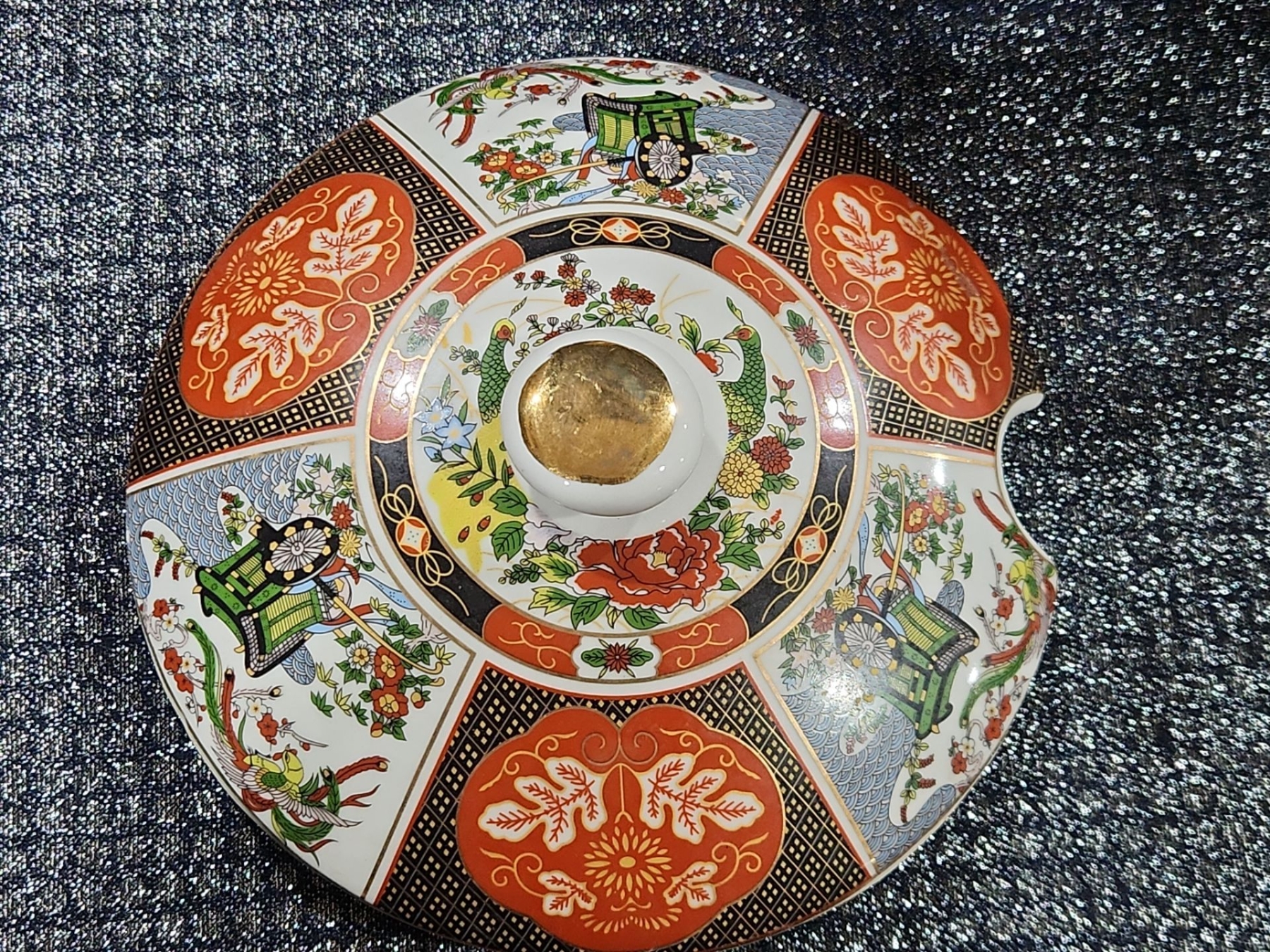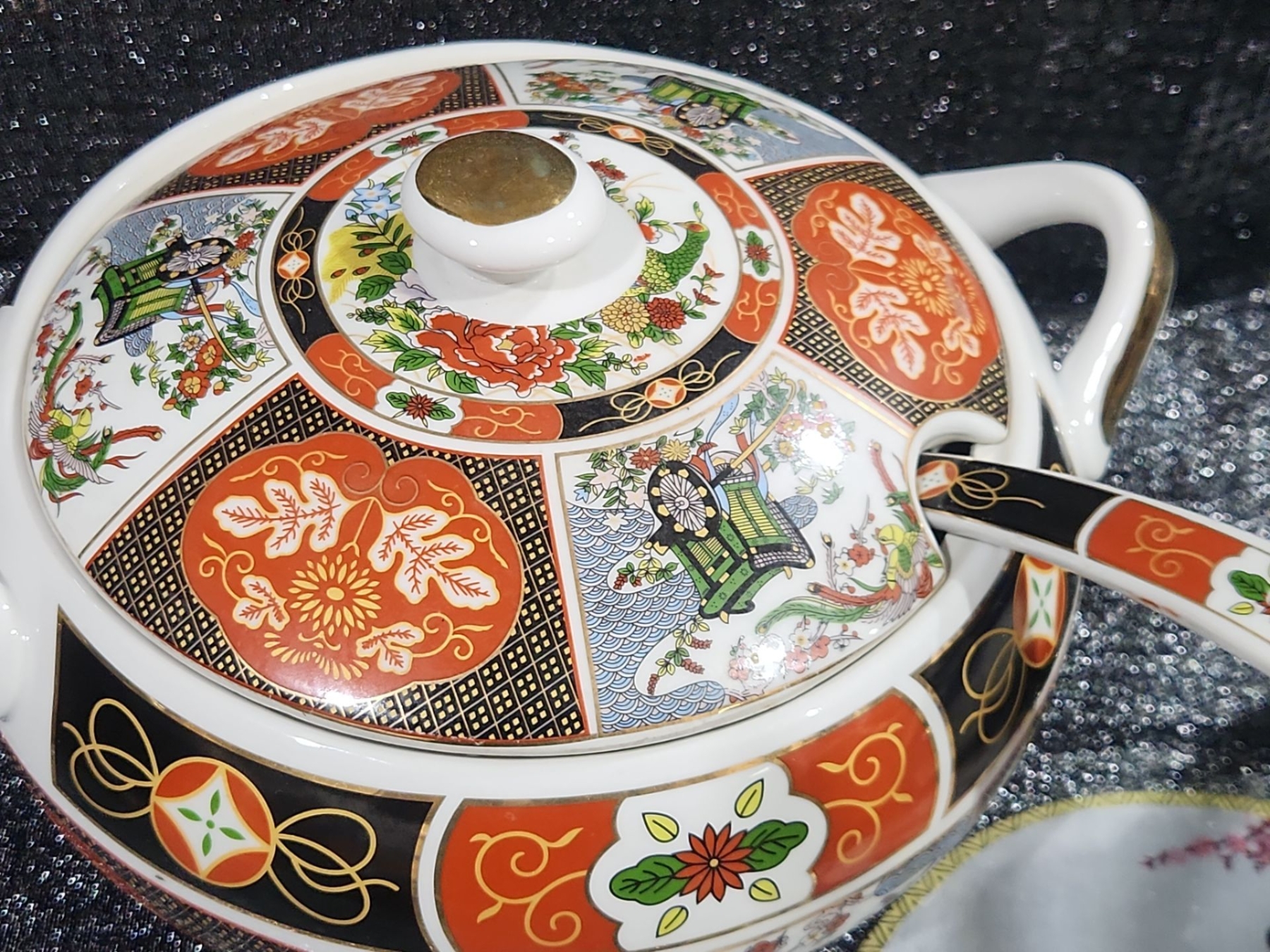 Lot 41 Japanese Porcelain Lidded Tureen & Ladle In The Imari Style, Chinese Ancient Hand Fan, And More.