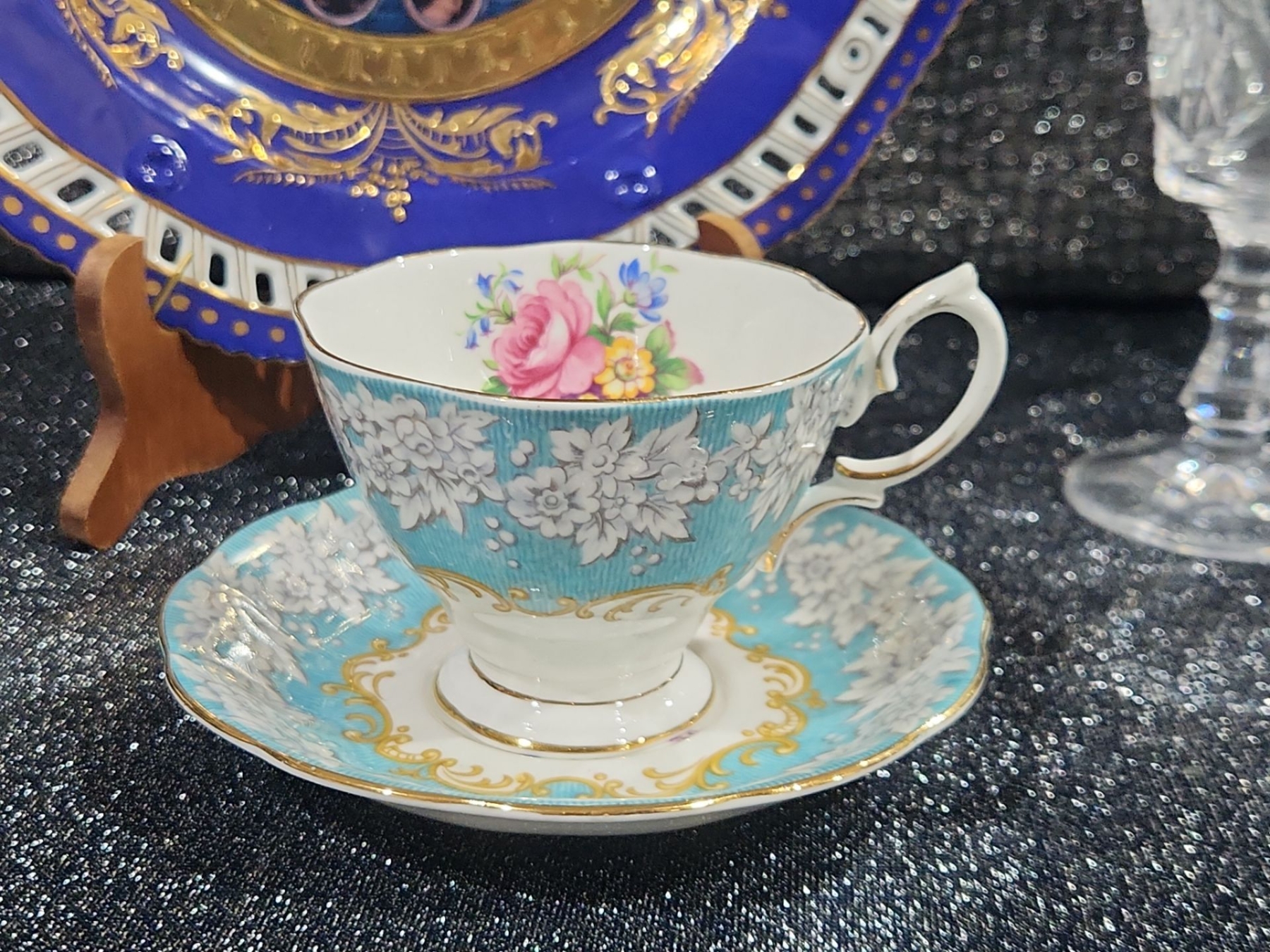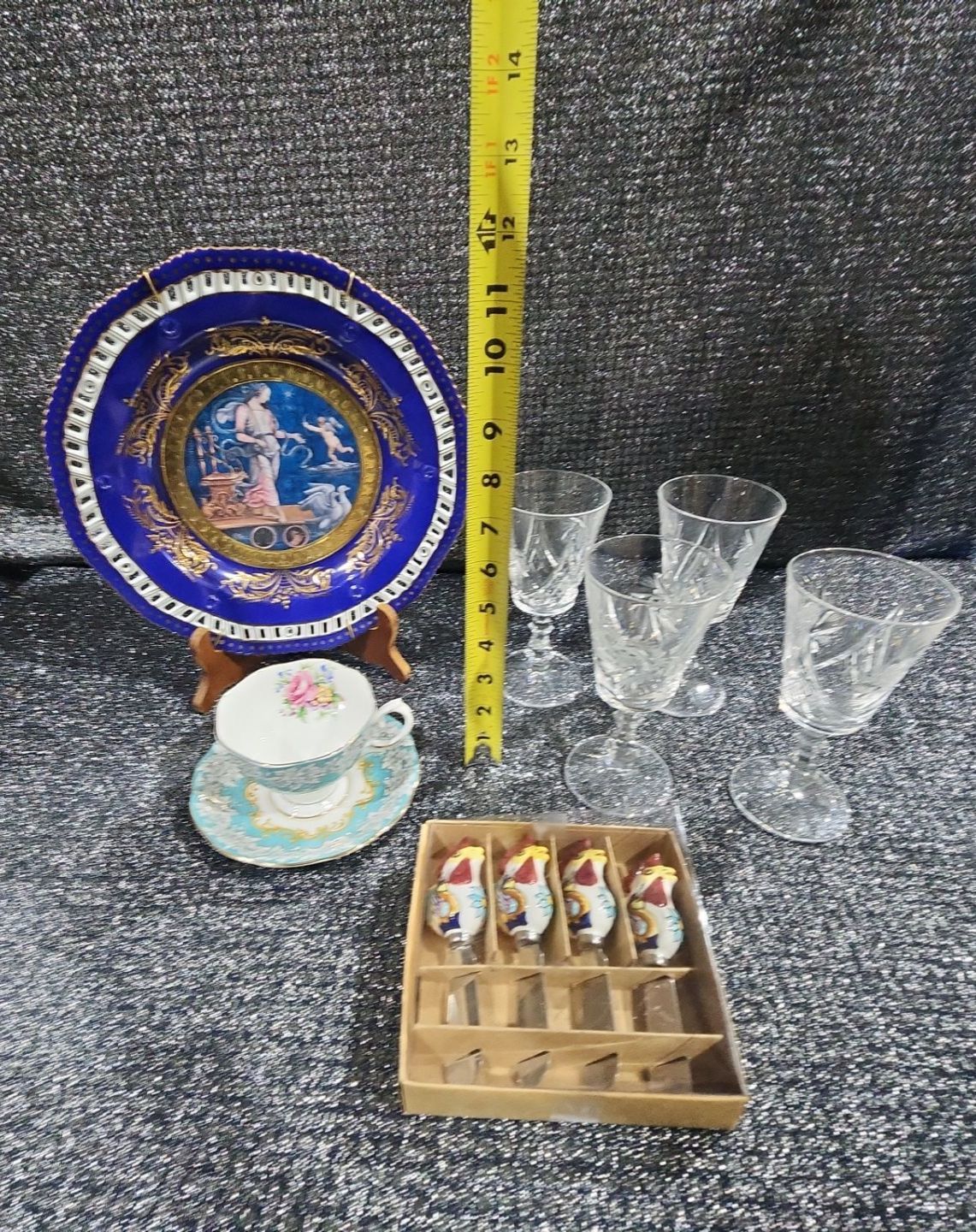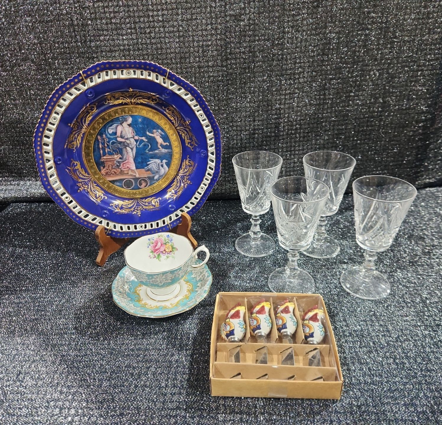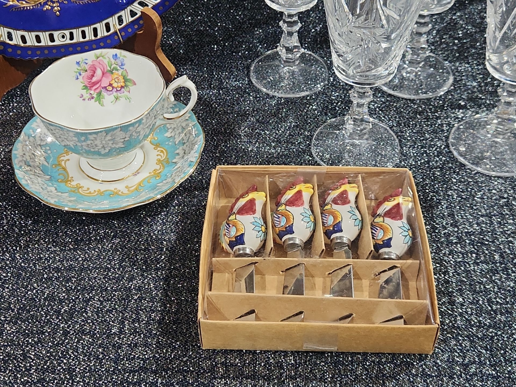 Decorative Plate, Crystal Stemmed Glasses, Royal Albert “Enchantment” Teacup & Saucer , Harry & David Chicken-Shaped Ceramic Spreaders,