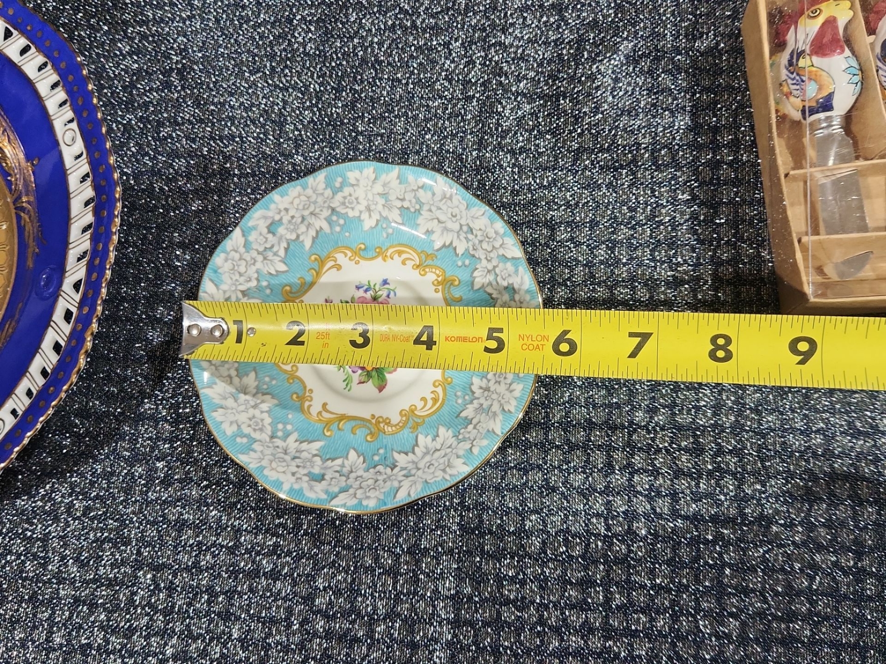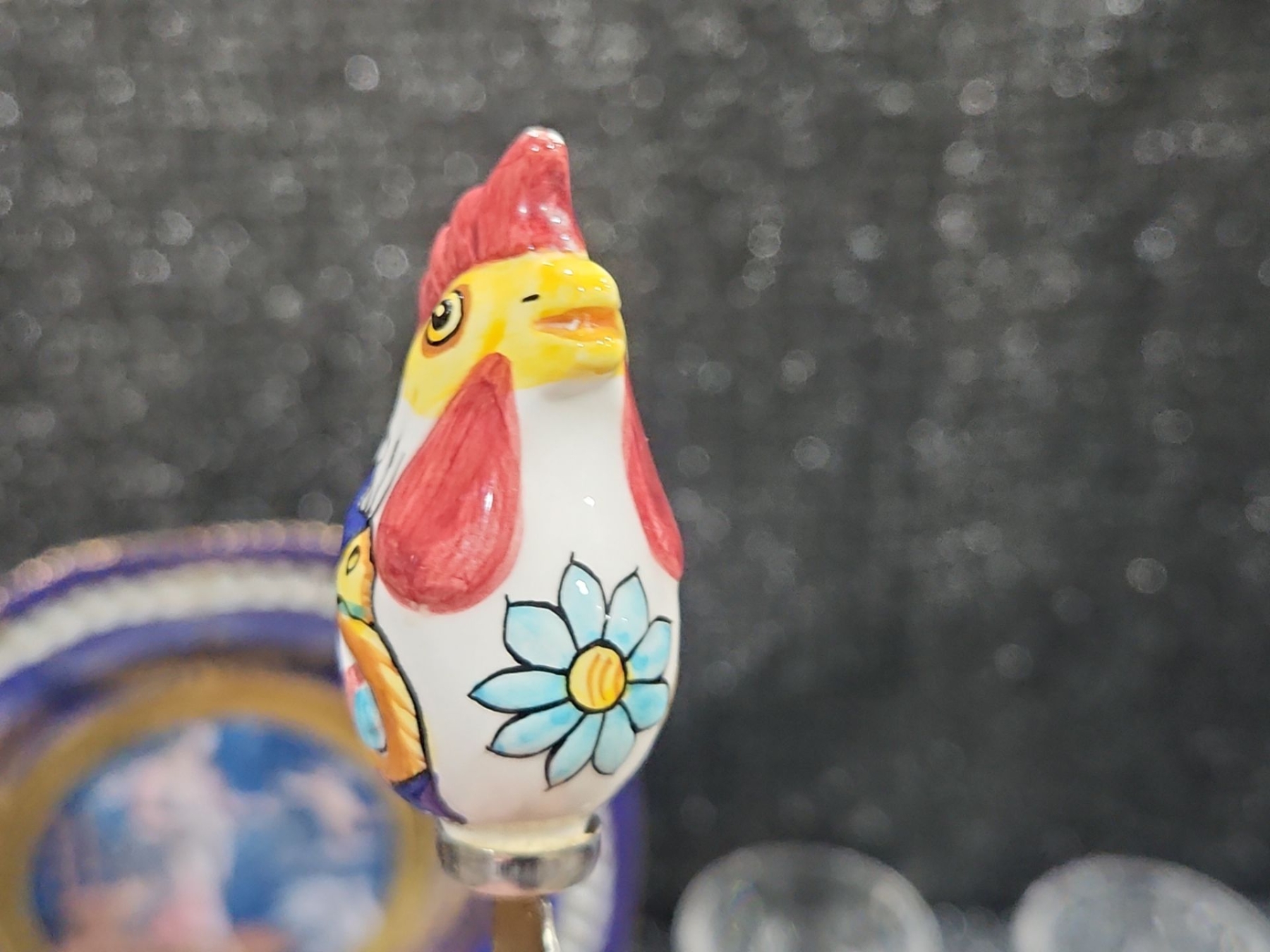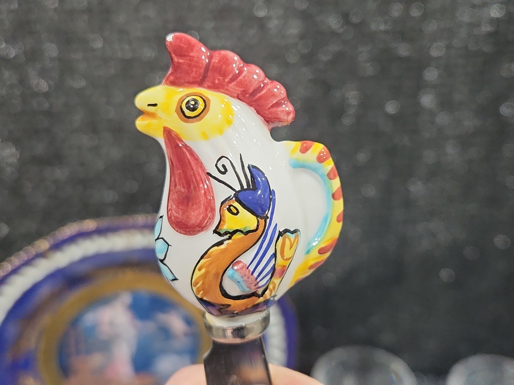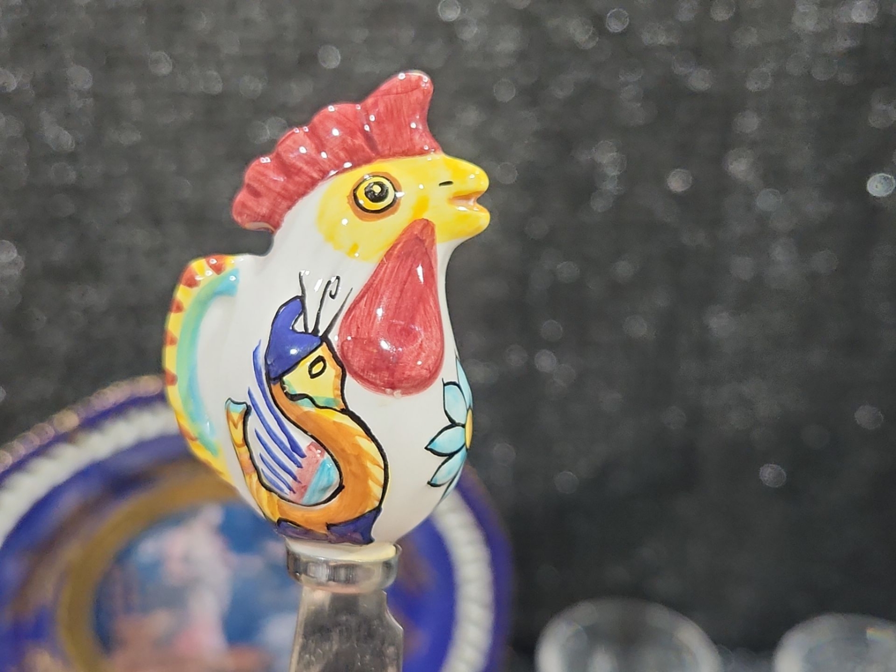 Decorative Plate, Crystal Stemmed Glasses, Royal Albert “Enchantment” Teacup & Saucer , Harry & David Chicken-Shaped Ceramic Spreaders,